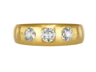 However, the grandiose impulse didn't entirely fade. The discovery of new diamond mines in South Africa in 1867 revolutionised the market, making diamonds more abundant and accessible than ever before. Combined with advances in diamond cutting, this new availability propelled diamonds to unprecedented levels of popularity. At the same time, coloured gemstones such as rubies, sapphires and opals also gained favour, often paired with diamonds to create striking, vibrant combinations in carved half hoop rings.
