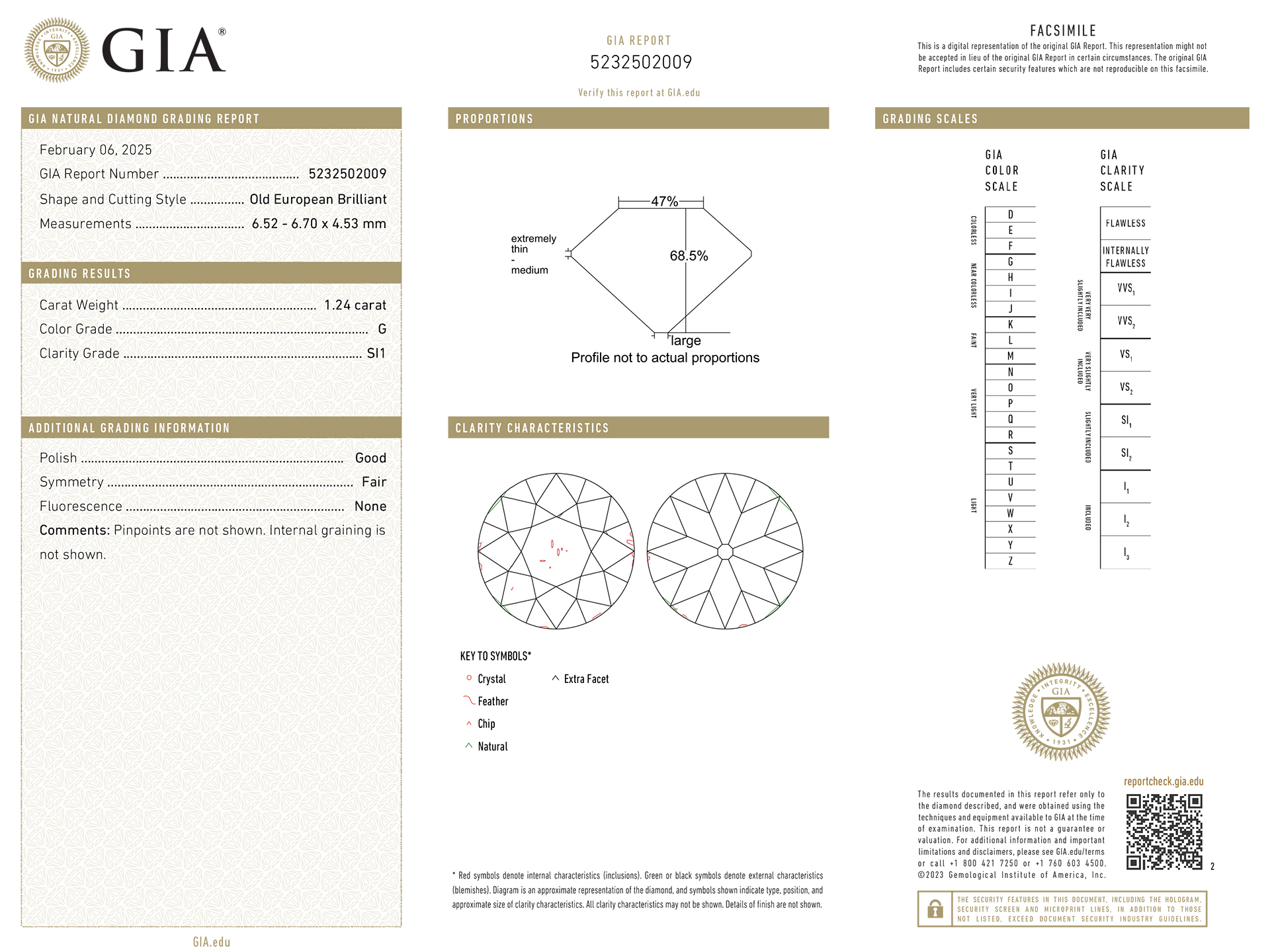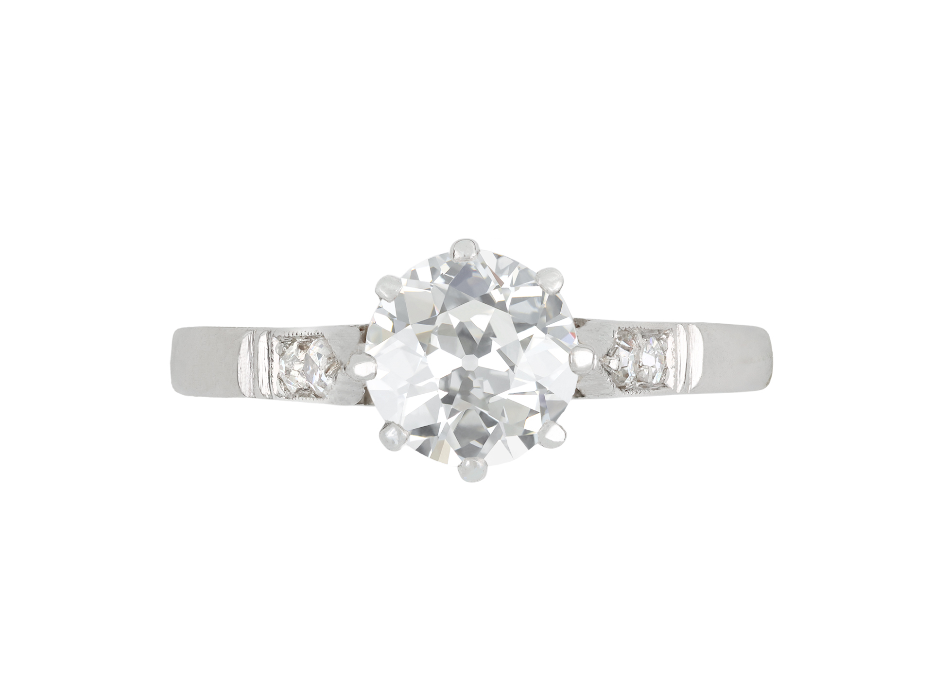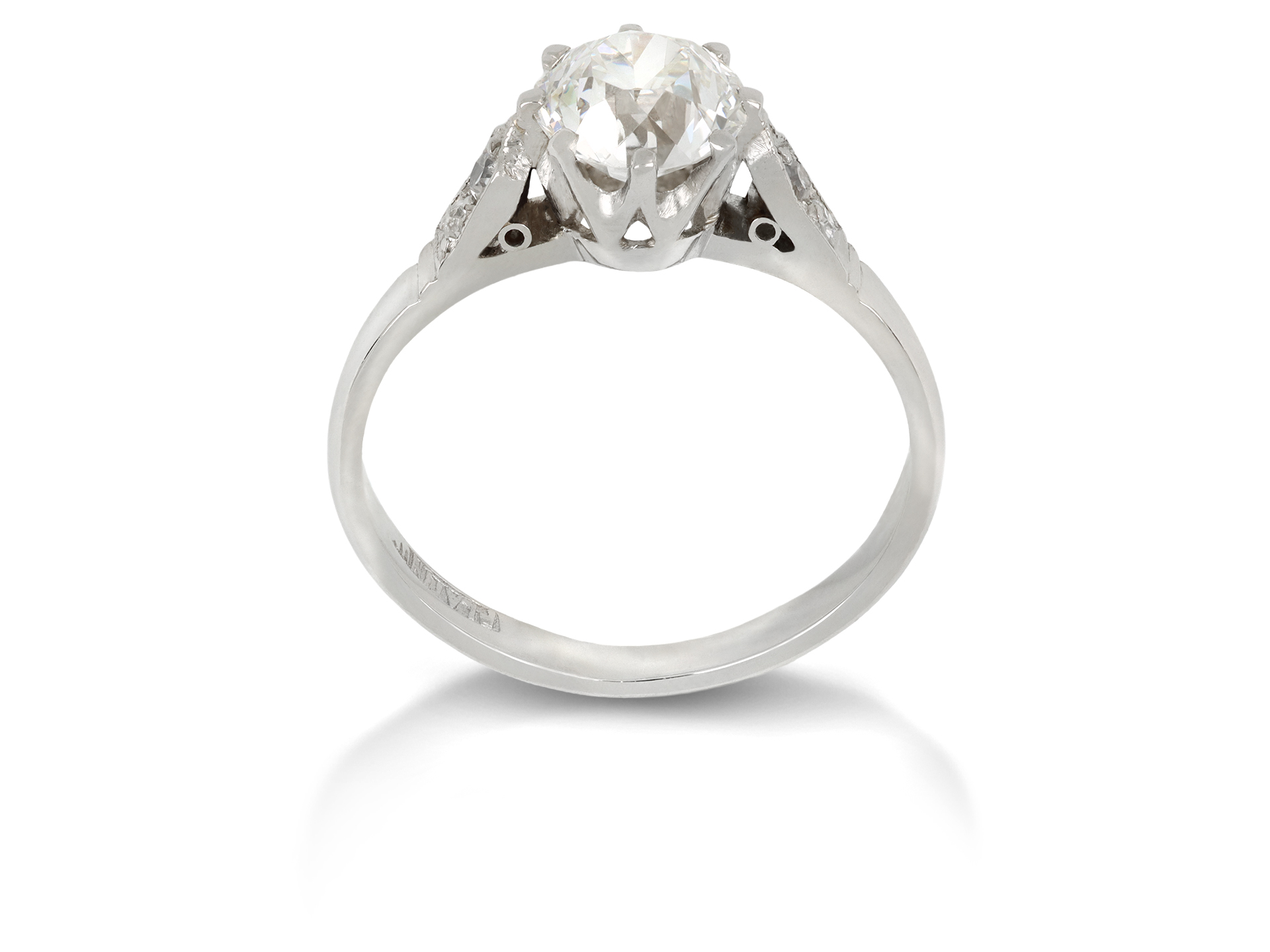 Old cut diamond flanked solitaire ring. Set with a round old cut diamond, G colour, SI1 clarity, with a weight of 1.24 carats, in an open back claw setting, further set with four round old cut diamonds in open back grain settings with a combined weight of 0.06 carats. The total approximate diamond weight is 1.30 carats, to an elegant solitaire design featuring curving claws and millegrain edging, an intricately pierced gallery and circular open backholing, leading to steep shoulders with chenier detail and flowing through to a solid D-shape shank. Marked platinum, English, circa 1935, accompanied by Gemological Institute of America (GIA) report #5232502009.