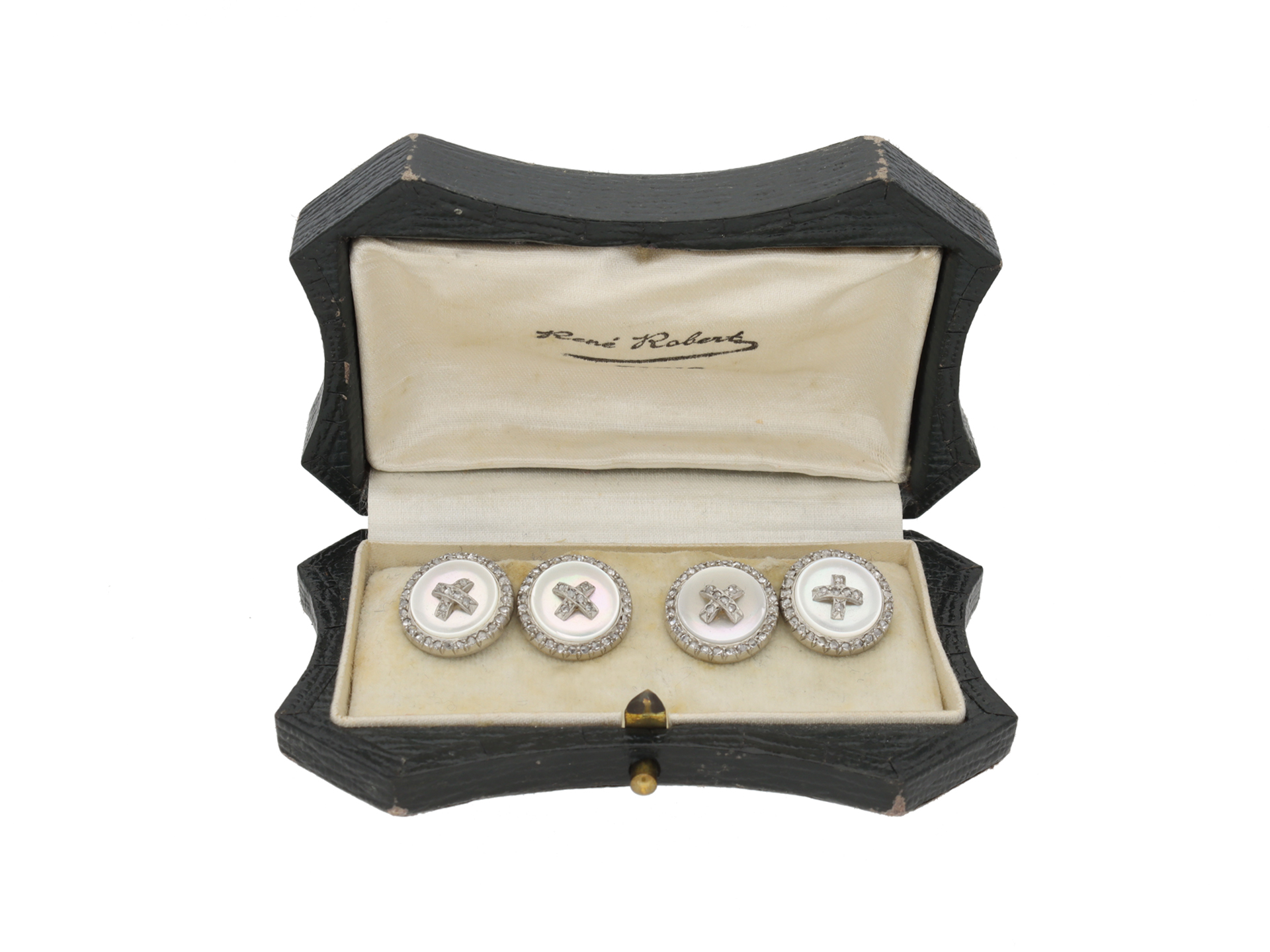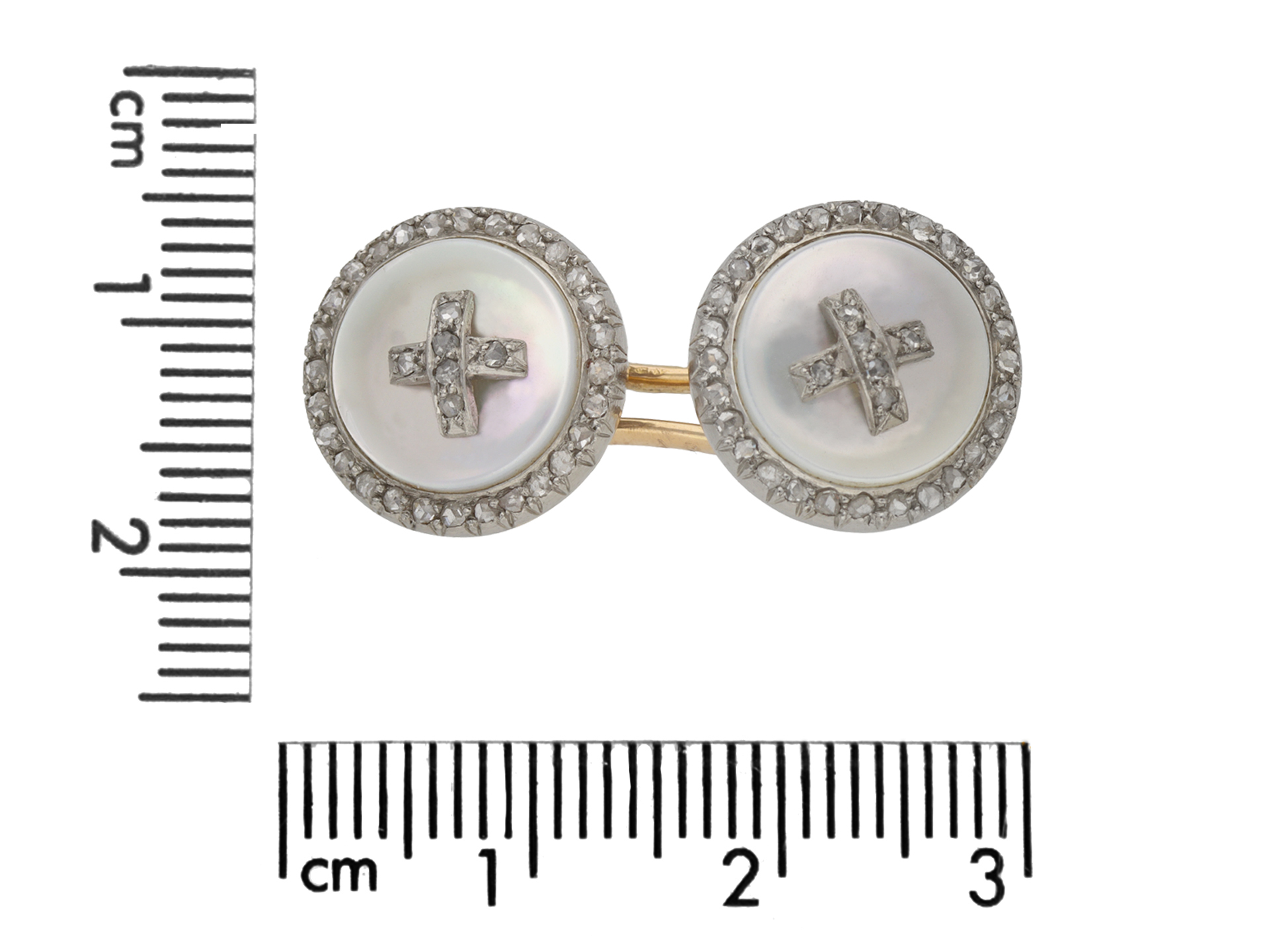 Antique diamond and mother of pearl cufflinks by Groene & Darde, French, circa 1910.