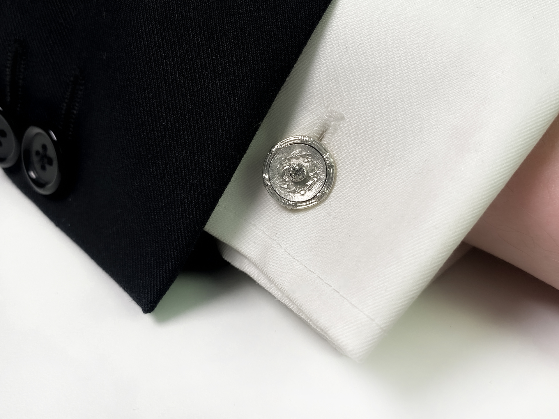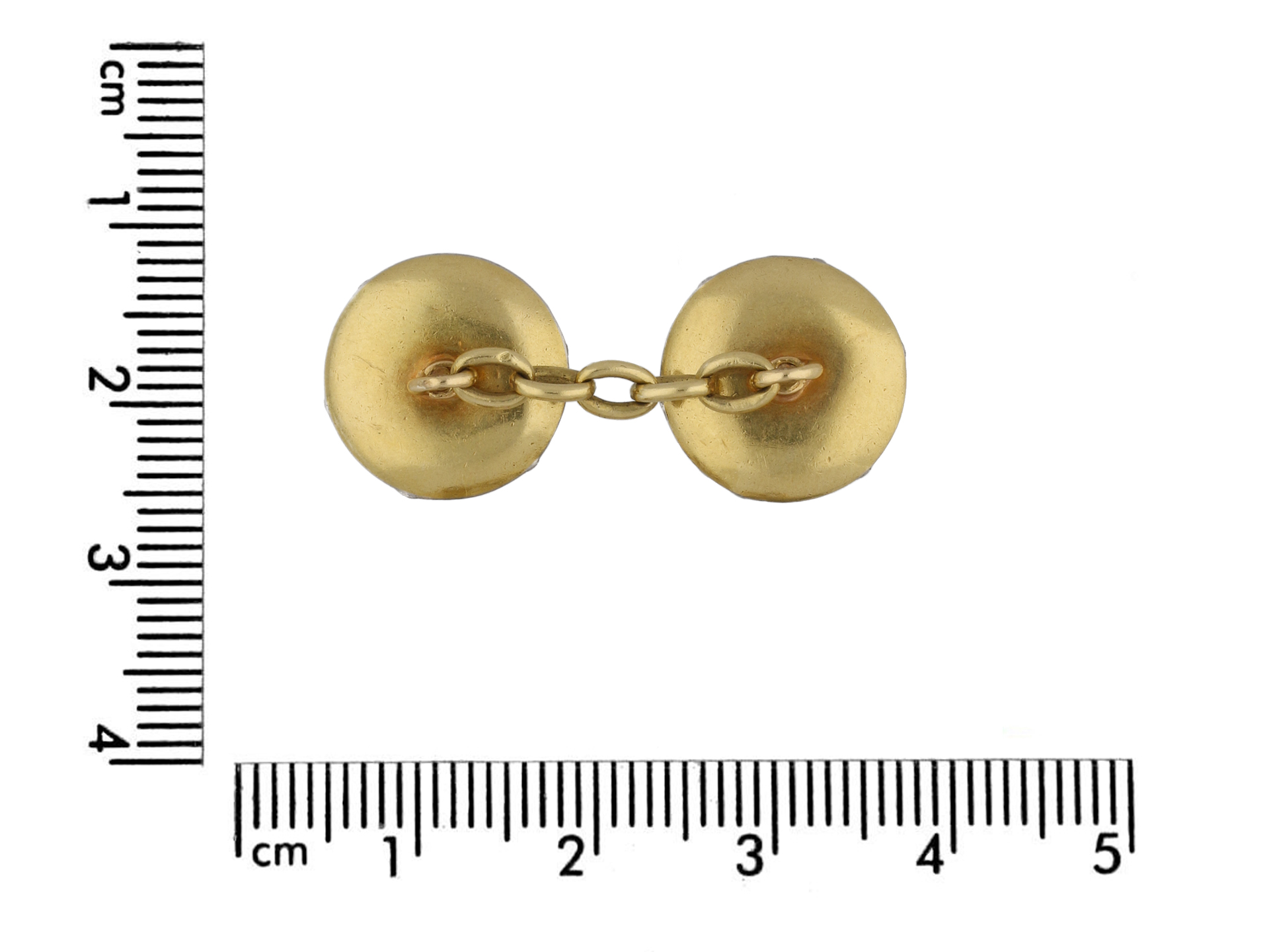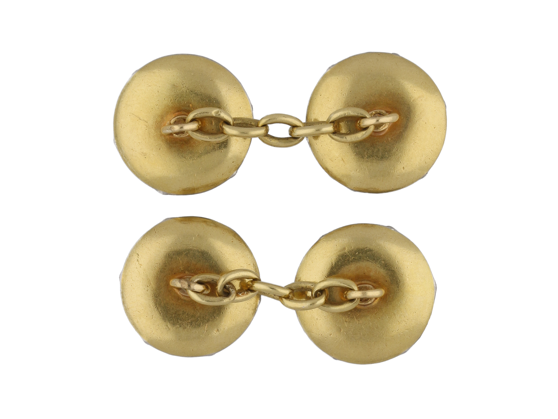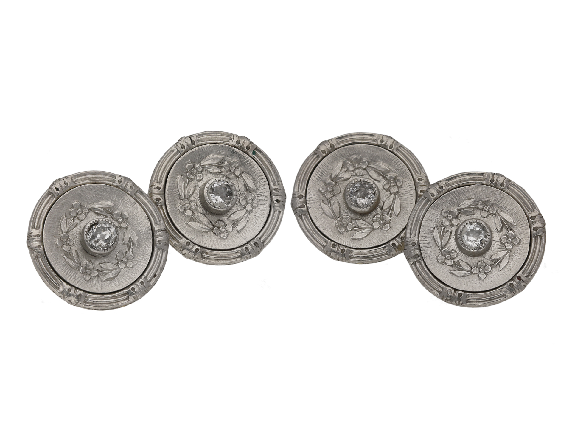 Edwardian diamond cufflinks. A matching pair of cufflinks, each circular disc set to centre with a round old cut diamond in a closed back rubover setting, four in total with a combined approximate weight of 0.08 carats, surrounded by intricately engraved raised floral and foliate details and edged by an incised scrolling and linear border, fitted to reverse with a secure oval chain link fitting. Tested yellow gold and platinum, circa 1905.