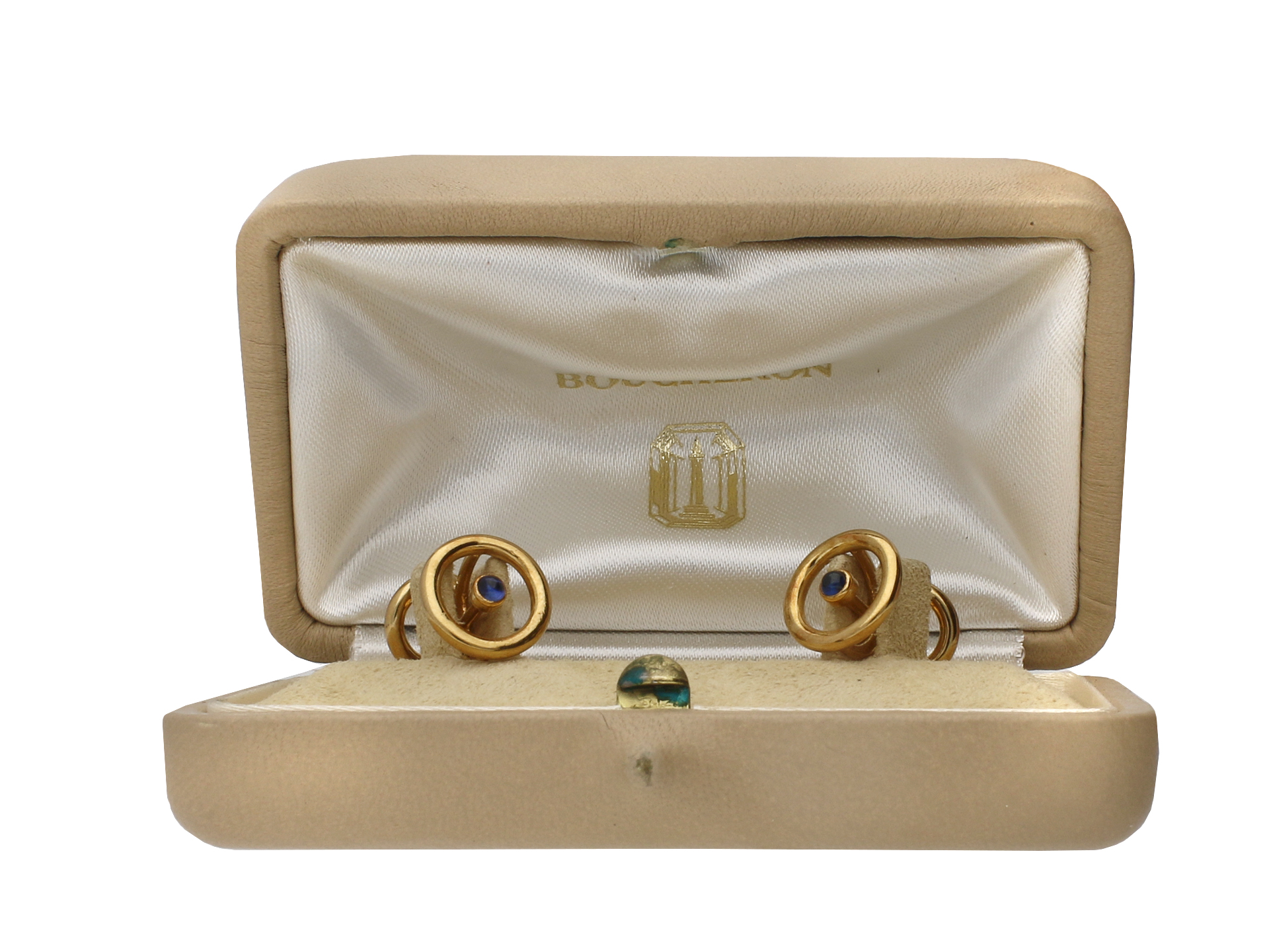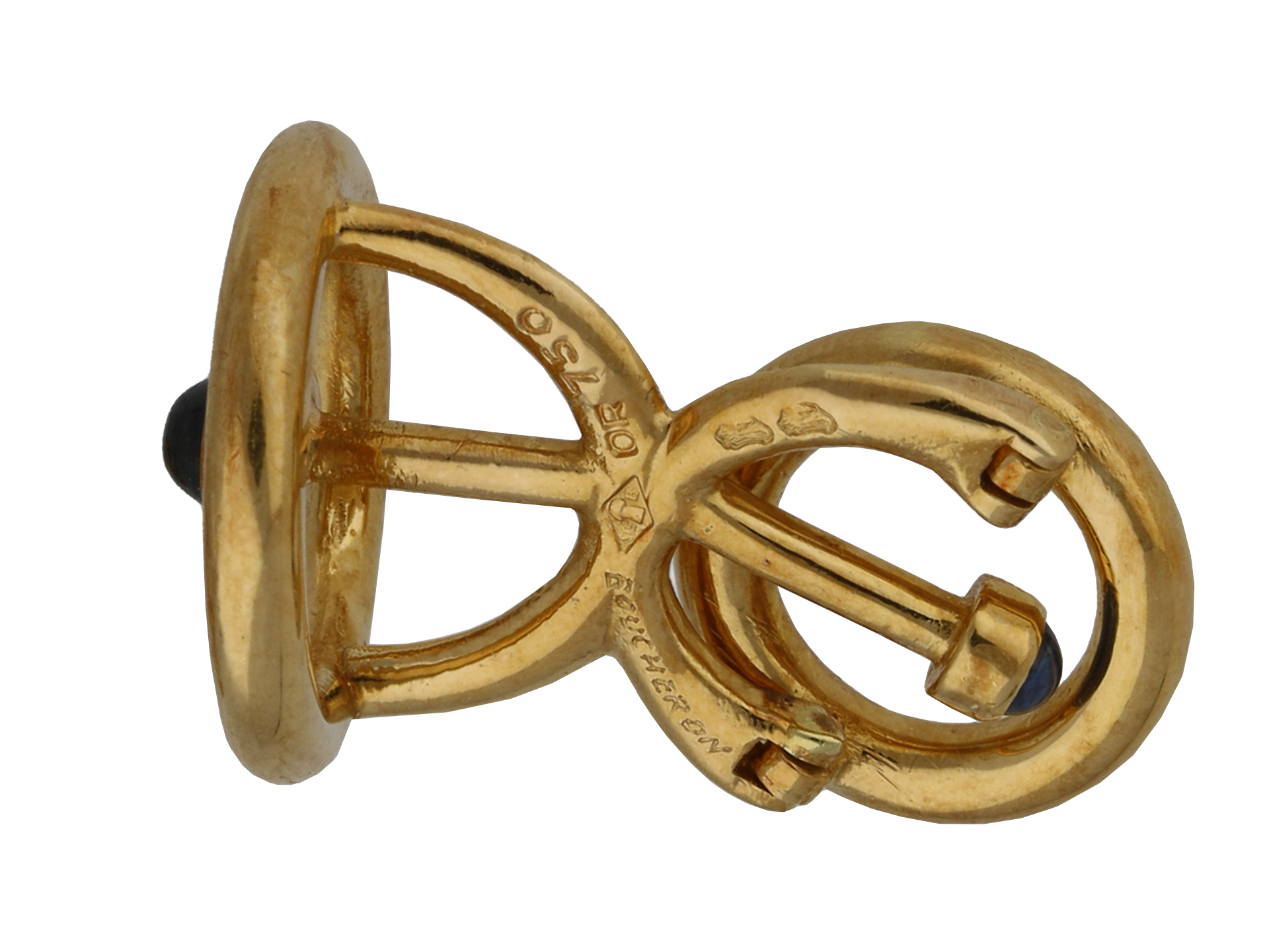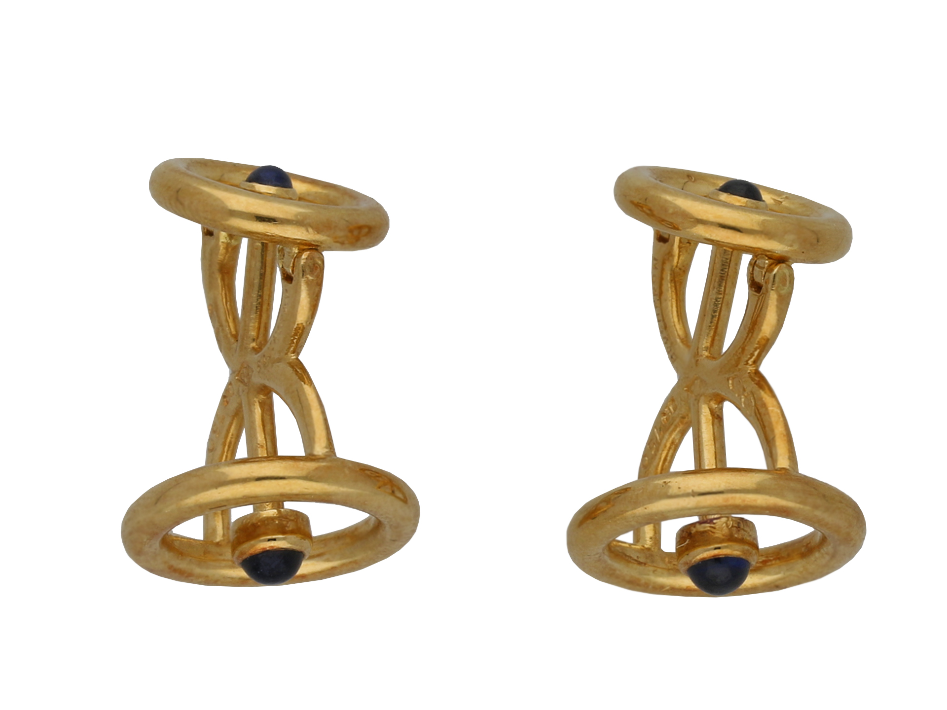 Boucheron gold and sapphire cufflinks. A matching pair of cufflinks, each set to centre front and back with a round cabochon natural sapphire in a closed back rubover setting, four in total with a combined approximate weight of 0.36 carats, to an elegant openwork circular design, joined together by an 'X' shape intersected by two gold bars, fitted to reverse with a secure hinged fitting, approximately 2cm in length. Marked 18 carat yellow gold, signed 'Boucheron', maker's mark for Boucheron, stamped 'OR', numbered '34467', French, circa 1970, accompanied by a Boucheron fitted box.