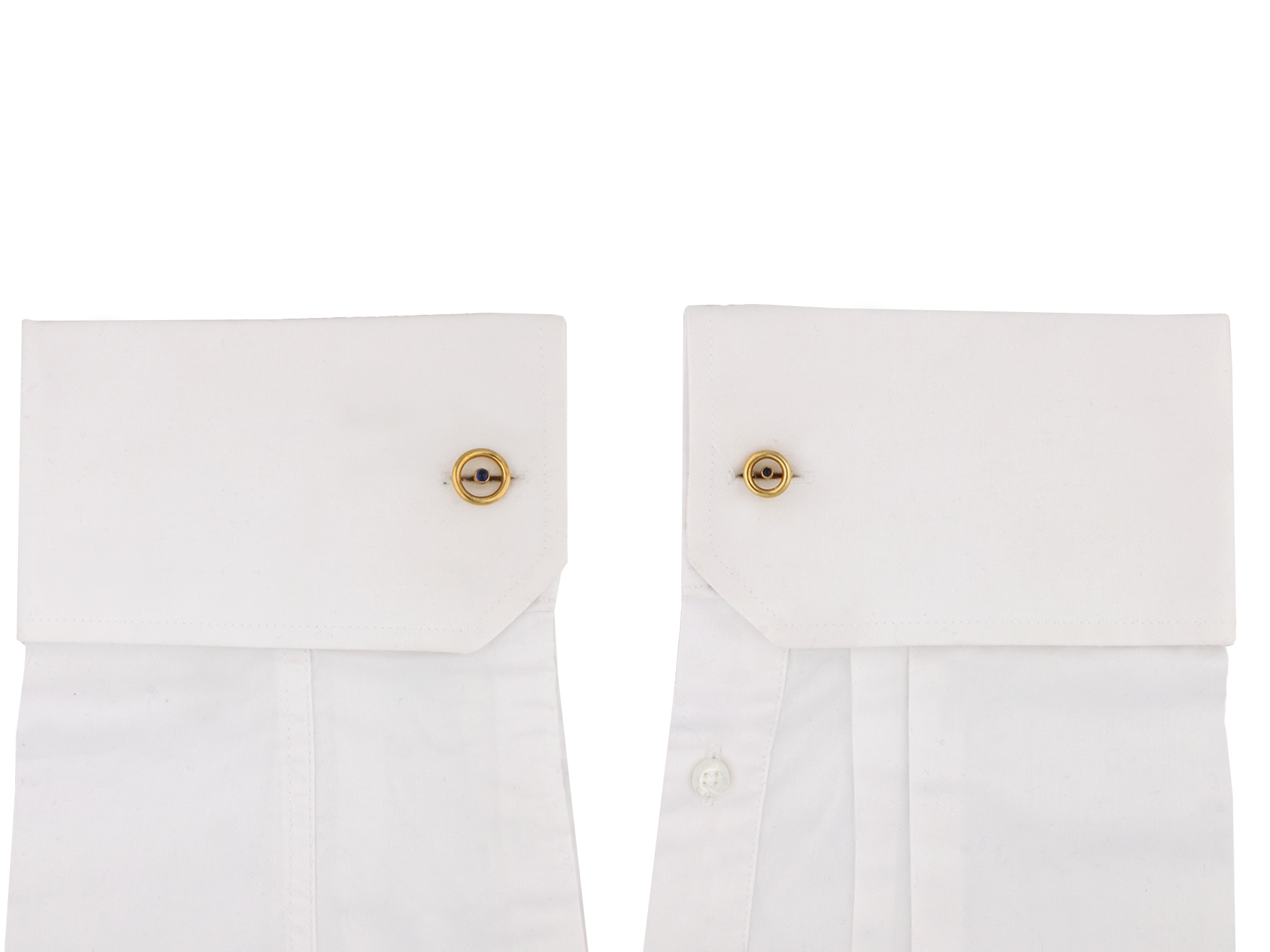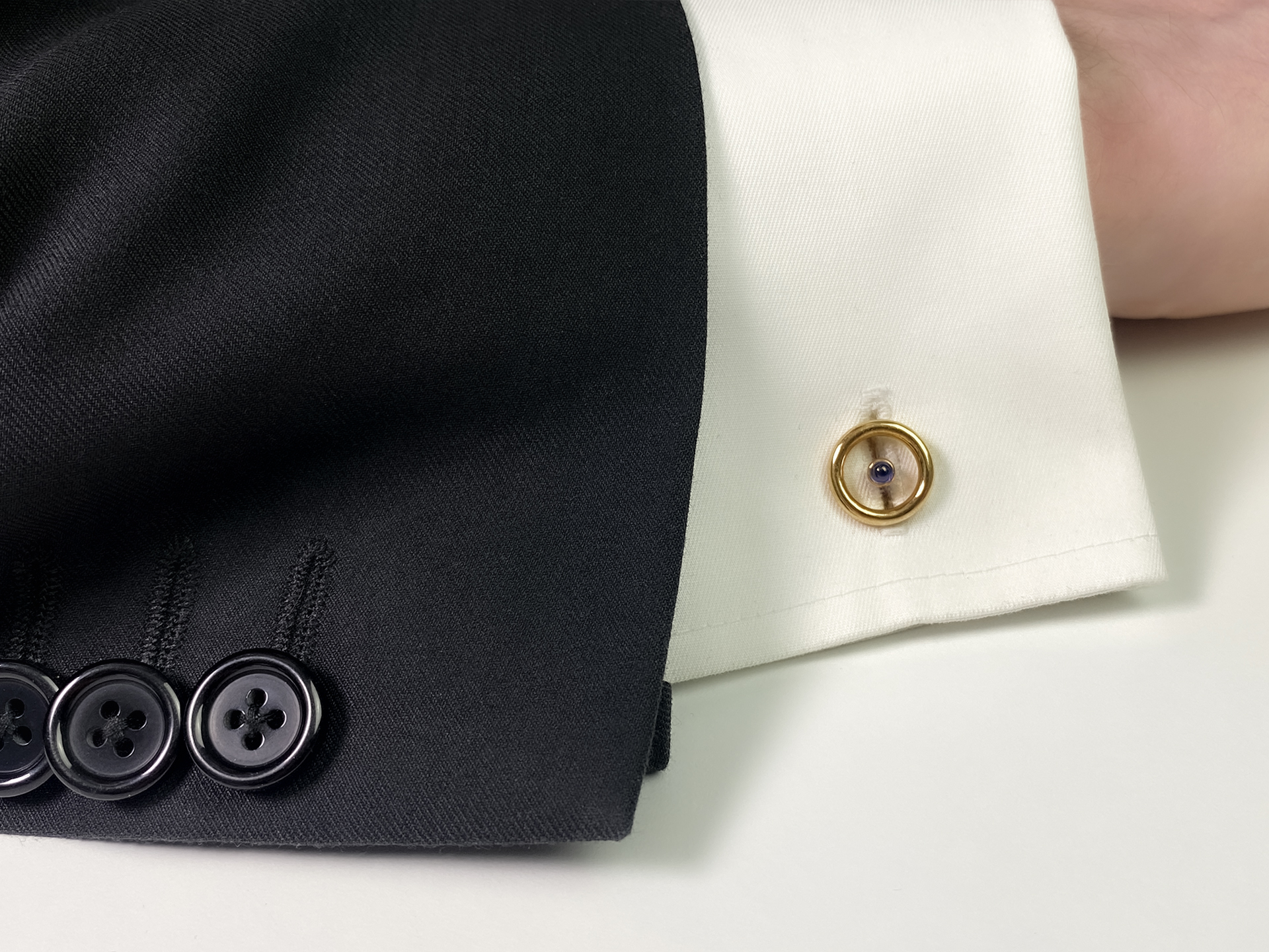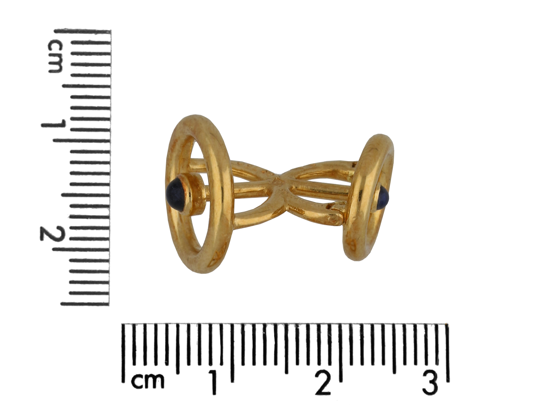 Boucheron gold and sapphire cufflinks. A matching pair of cufflinks, each set to centre front and back with a round cabochon natural sapphire in a closed back rubover setting, four in total with a combined approximate weight of 0.36 carats, to an elegant openwork circular design, joined together by an 'X' shape intersected by two gold bars, fitted to reverse with a secure hinged fitting, approximately 2cm in length. Marked 18 carat yellow gold, signed 'Boucheron', maker's mark for Boucheron, stamped 'OR', numbered '34467', French, circa 1970, accompanied by a Boucheron fitted box.