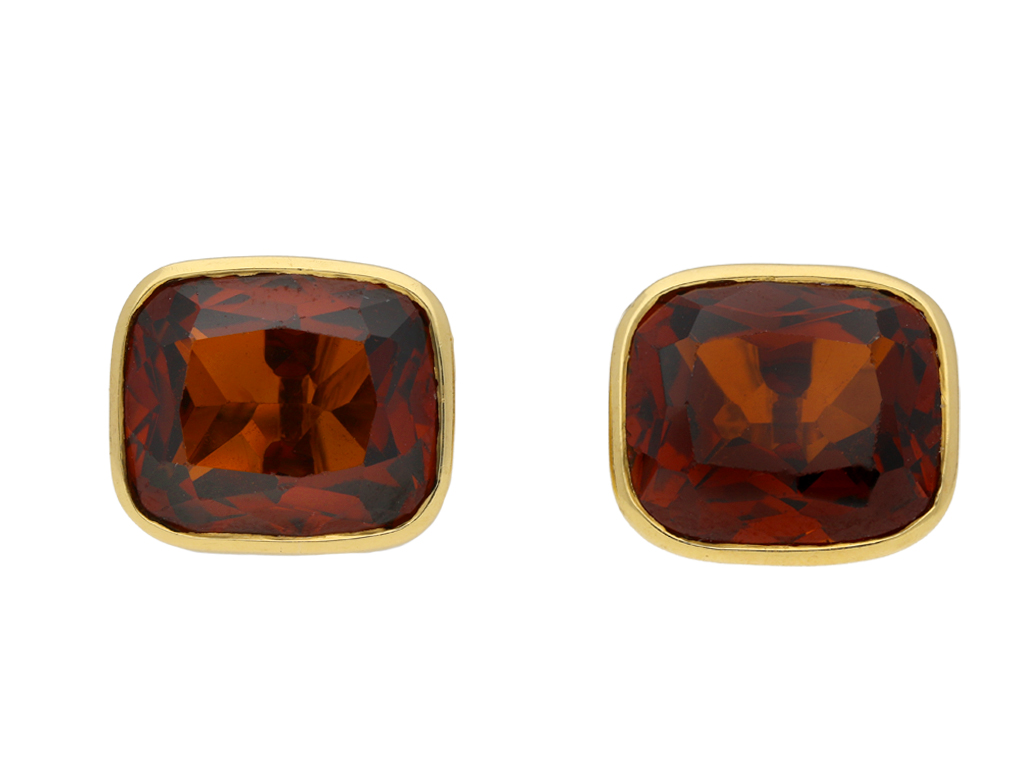 Bulgari citrine cufflinks. A matching pair of cufflinks, each composed of a cushion shape old cut natural citrine in an open back rubover setting, two in total with a combined approximate weight of 16.00 carats, the reverse mounted with a flat curving gold bar leading to hinged links with a smooth rounded torpedo form, approximate length 2.40cm. Marked 18 carat yellow gold, stamped 'BVLGARI ITALY', French import marks, Italian, circa 1970.