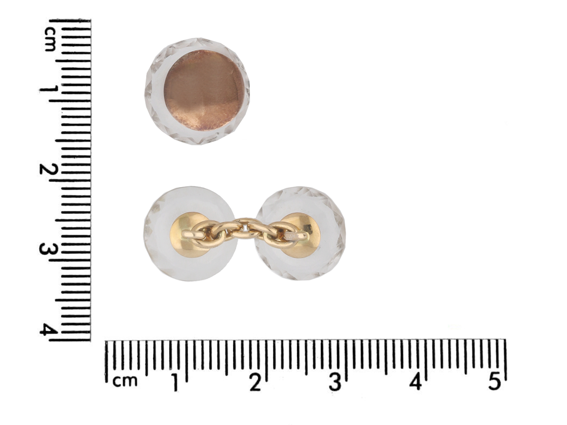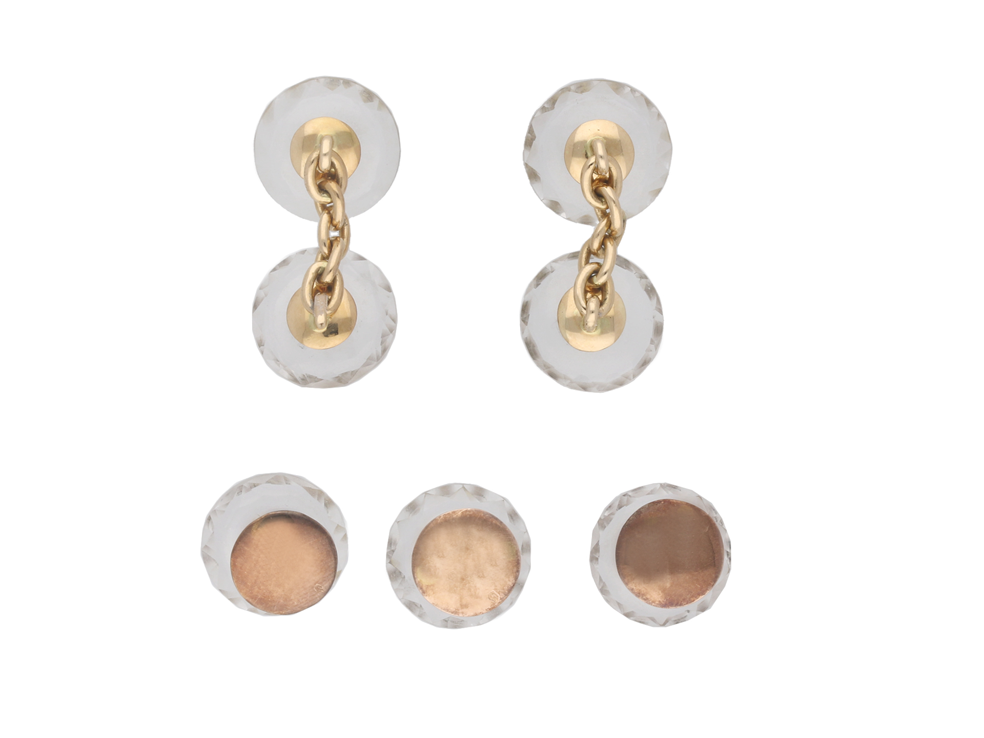 Gentleman’s rock crystal and diamond dress set. A matching dress set comprising of of a pair of cufflinks and three studs, each cuff link set with two round old cut diamond in a closed back rubover settings, four in total with a combined approximate weight of 0.16 carats, the three studs set with a round old cut diamond in a closed back rubover setting, three in total with a combined weight of 0.12 carats. The total approximate diamond weight is 0.28 carats, the cuff links composed of a circular rock crystal plaque with faceted edges and matte centre, the reverse mounted with a secure oval chain link fitting, the studs composed of a matching circular rock crystal plaque with faceted edges and matte centre, the reverse mounted with a secure polished gold circular stud, cufflinks measure approximately 2.5cm in length, studs measure 1.8cm in width. Marked 18 carat yellow gold, settings tested platinum, French, circa 1910, accompanied by a fitted box.