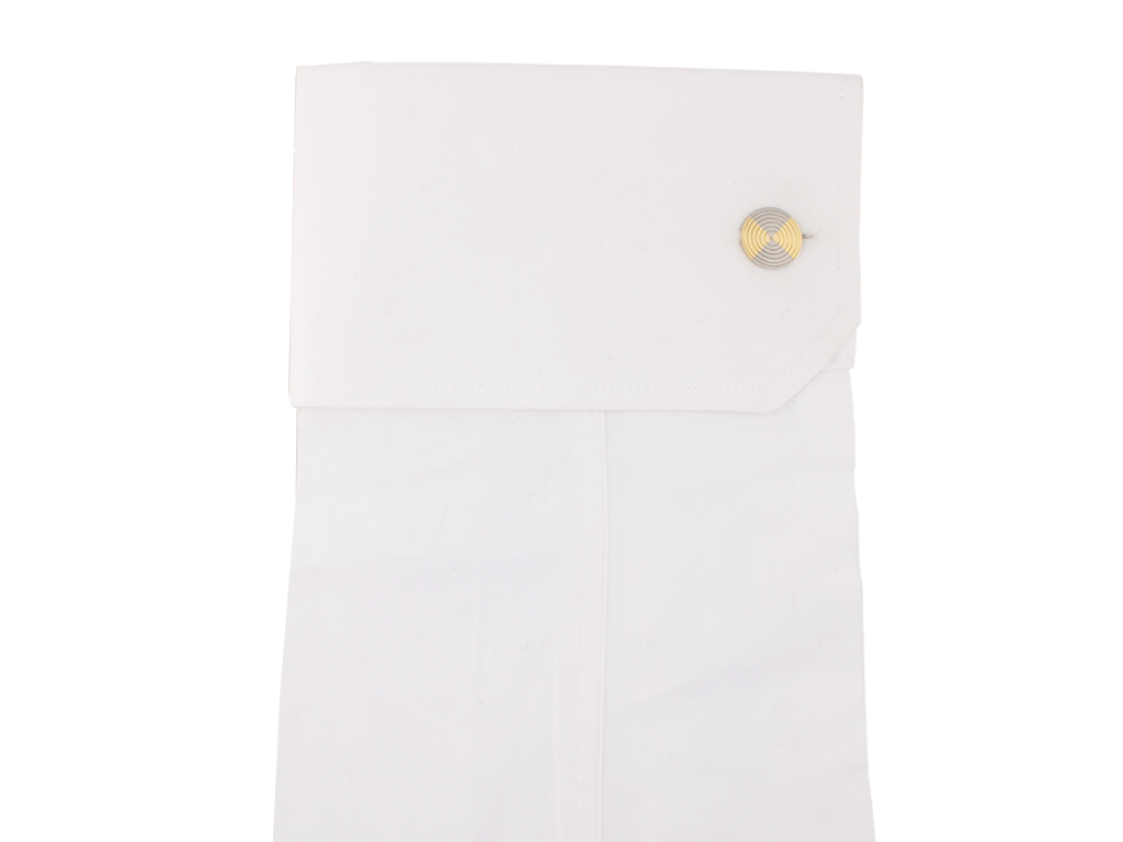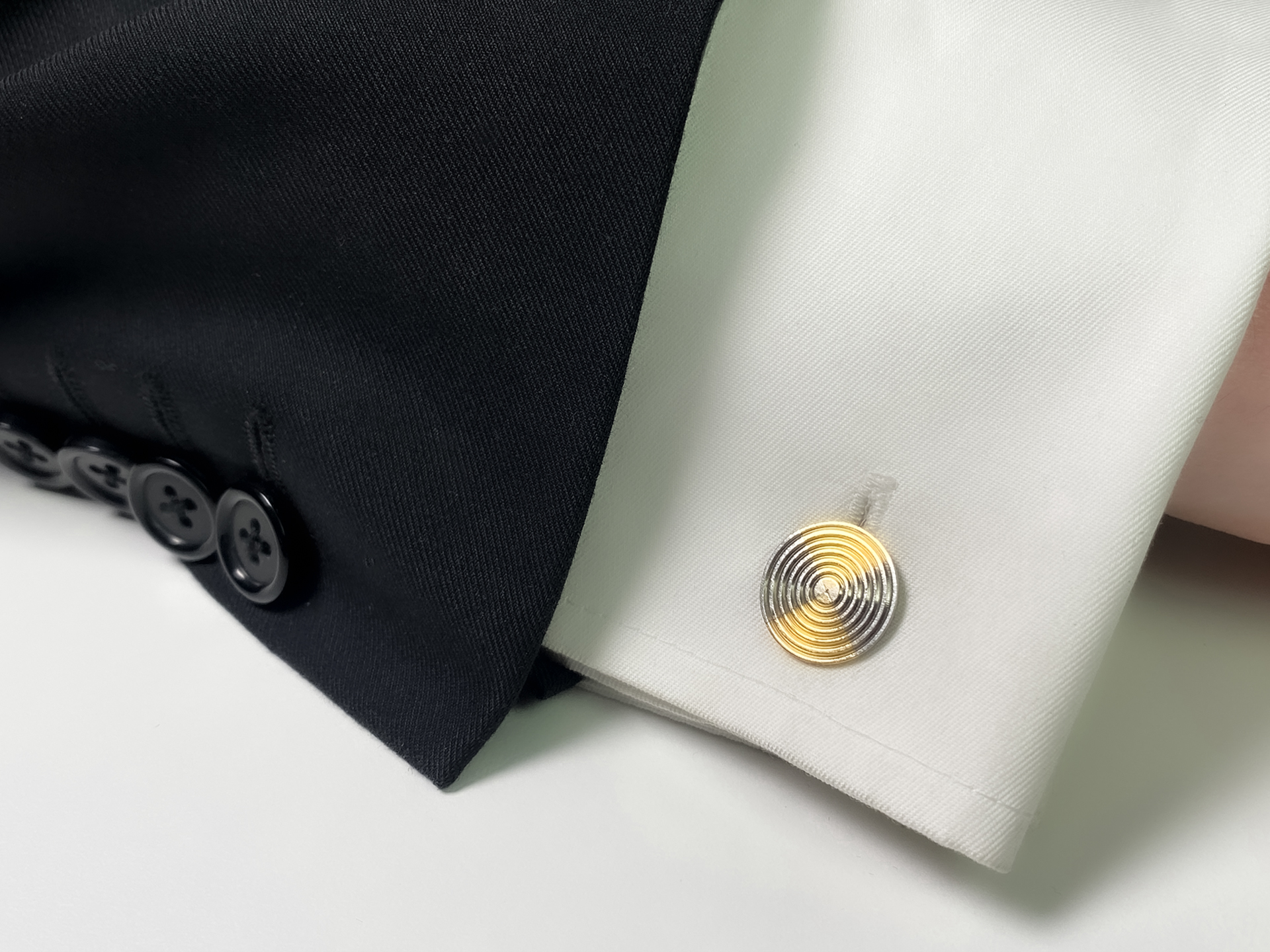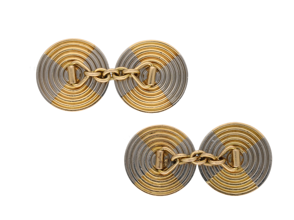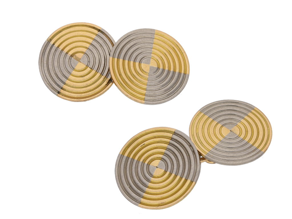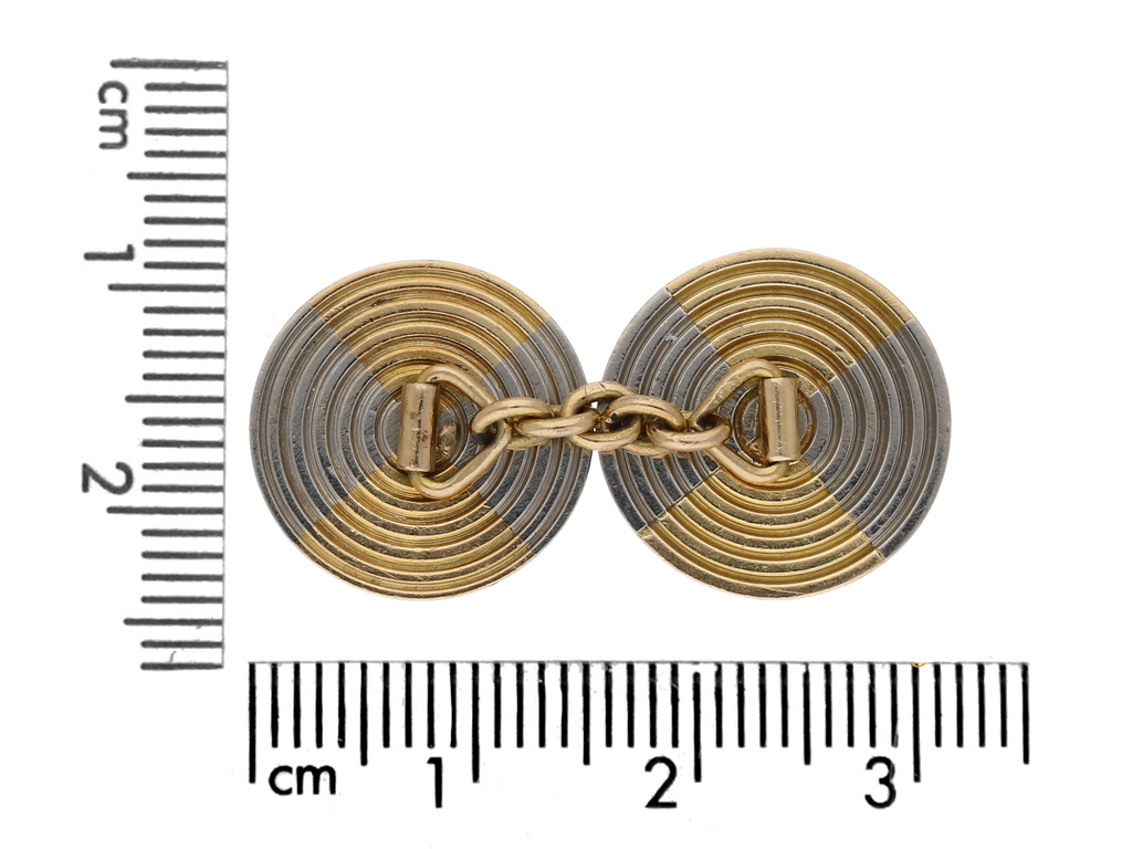 Gold and platinum cufflinks. A matching pair of circular cufflinks each composed of two flat round discs split into quarters with alternating gold and platinum segments, further adorned by seven concentric raised rings, connected by oval chain links secured to the reverse, approximately 2.00cm. Tested yellow gold and platinum, circa 1940.