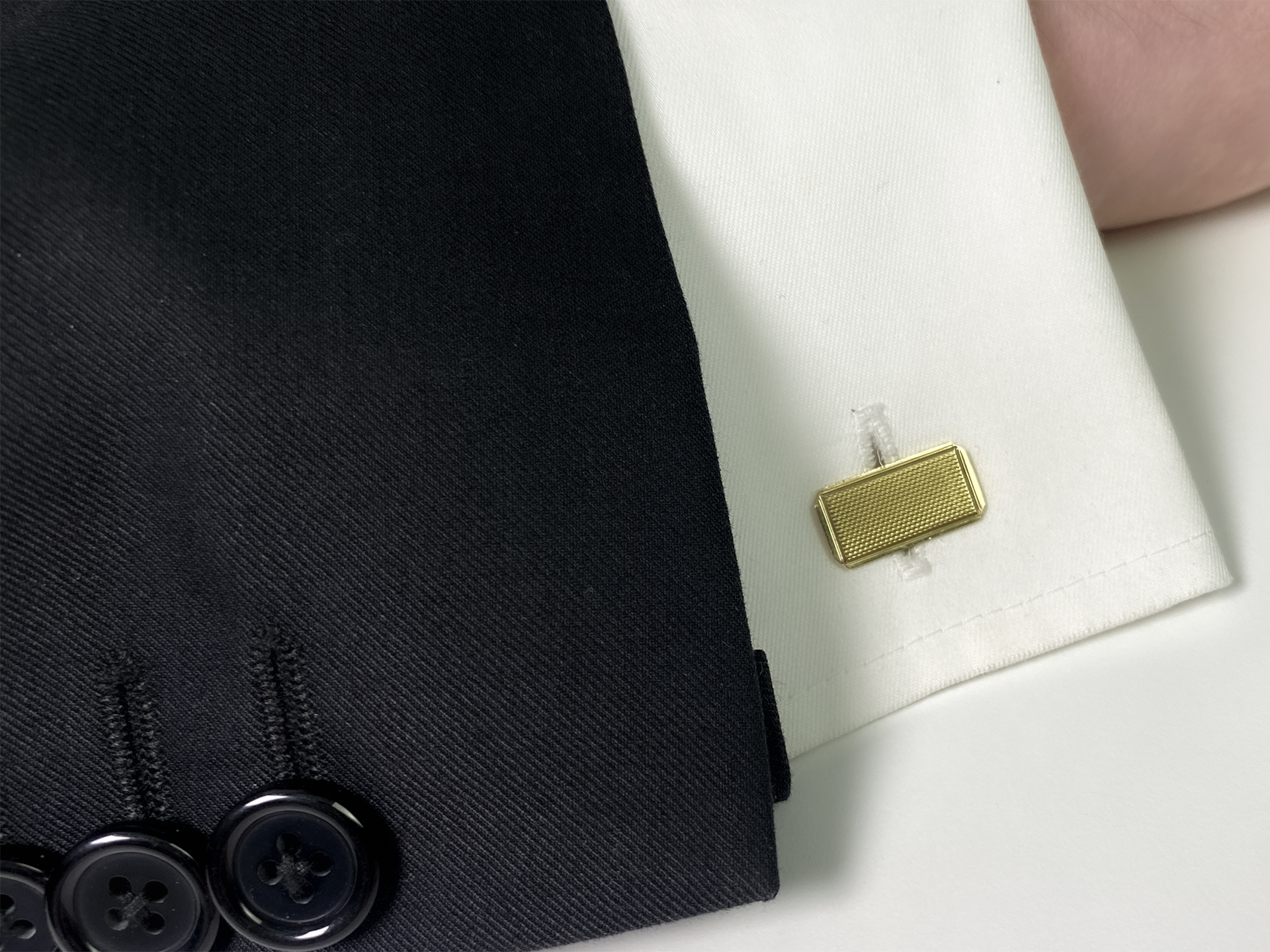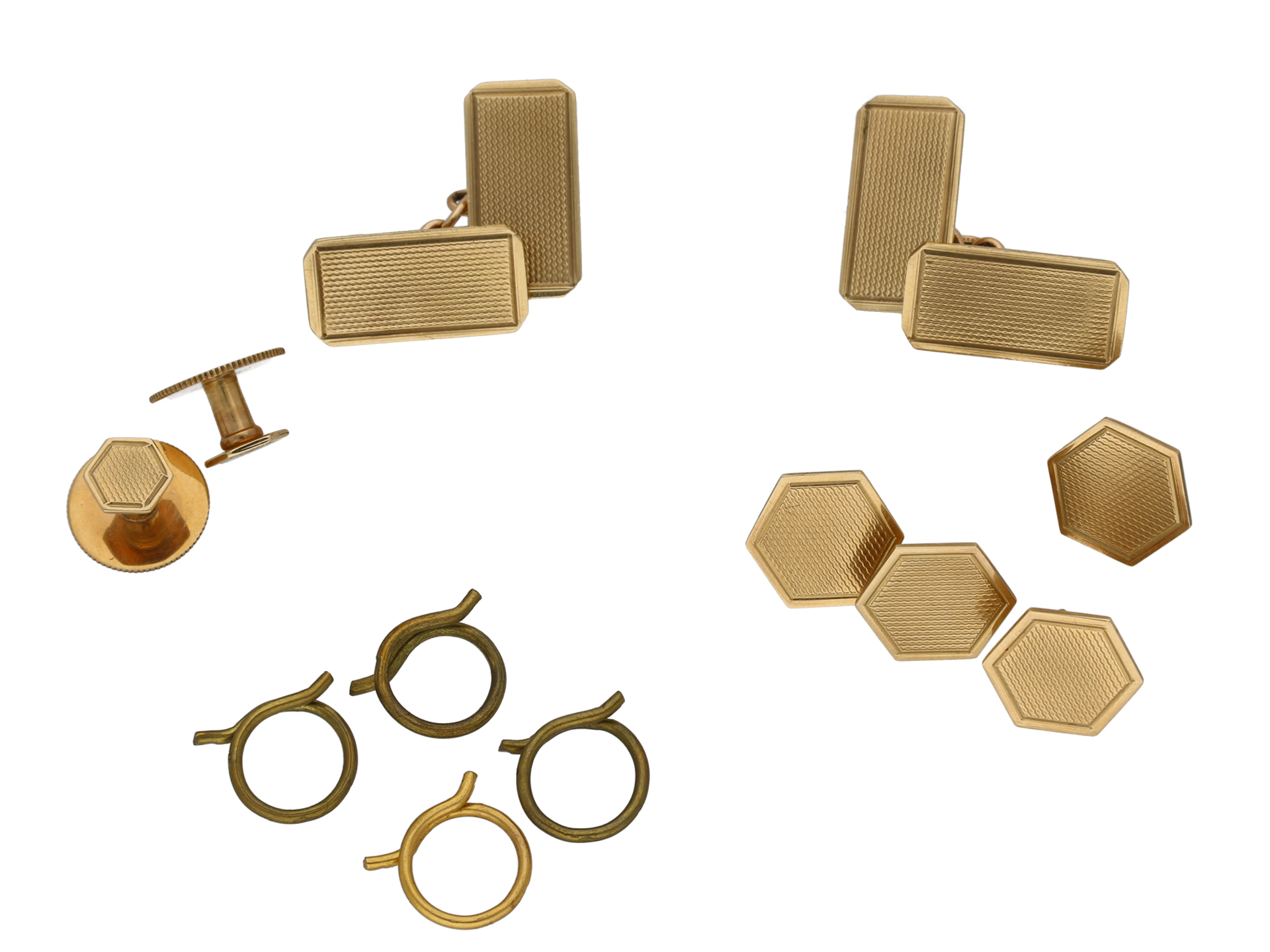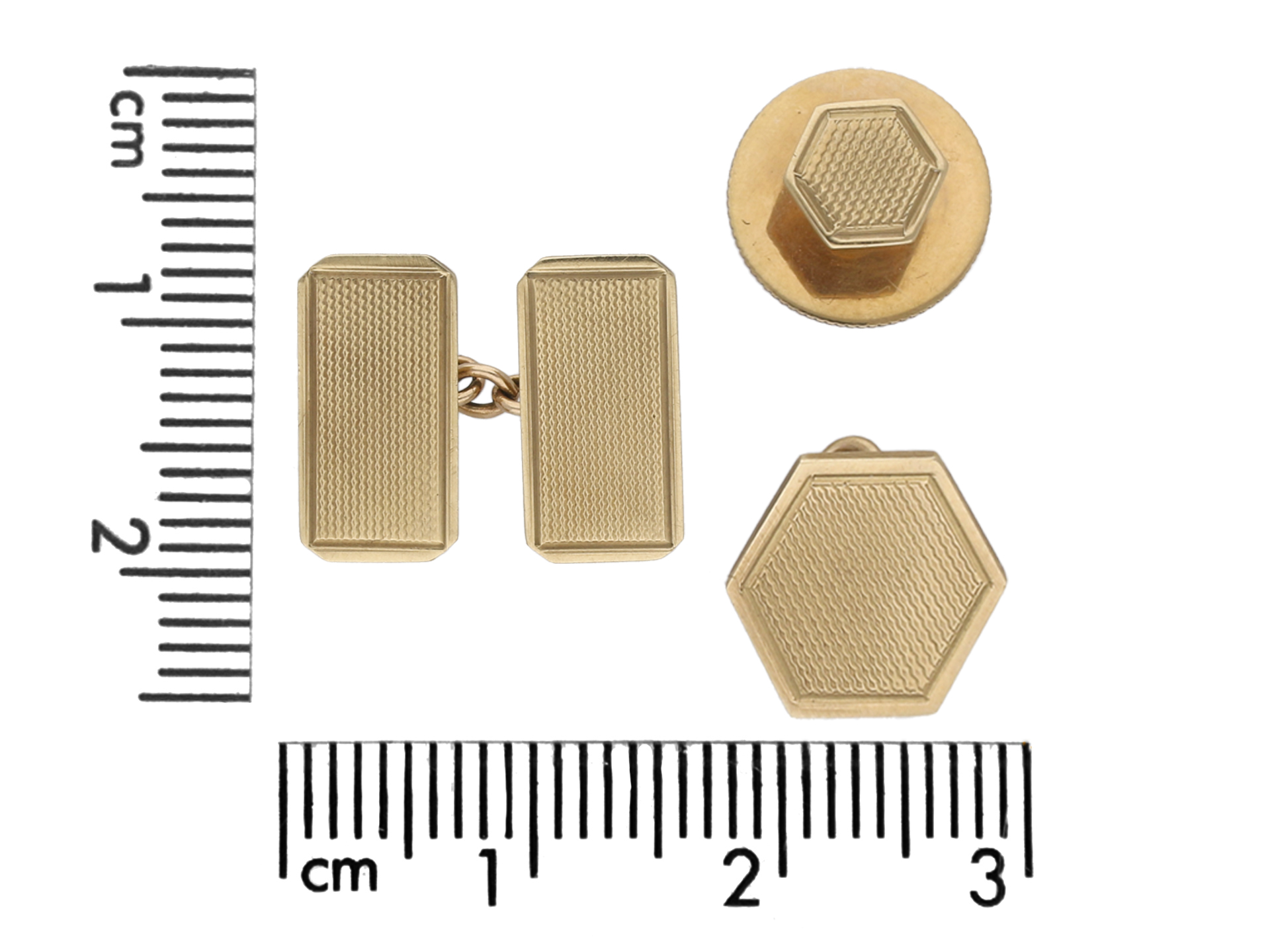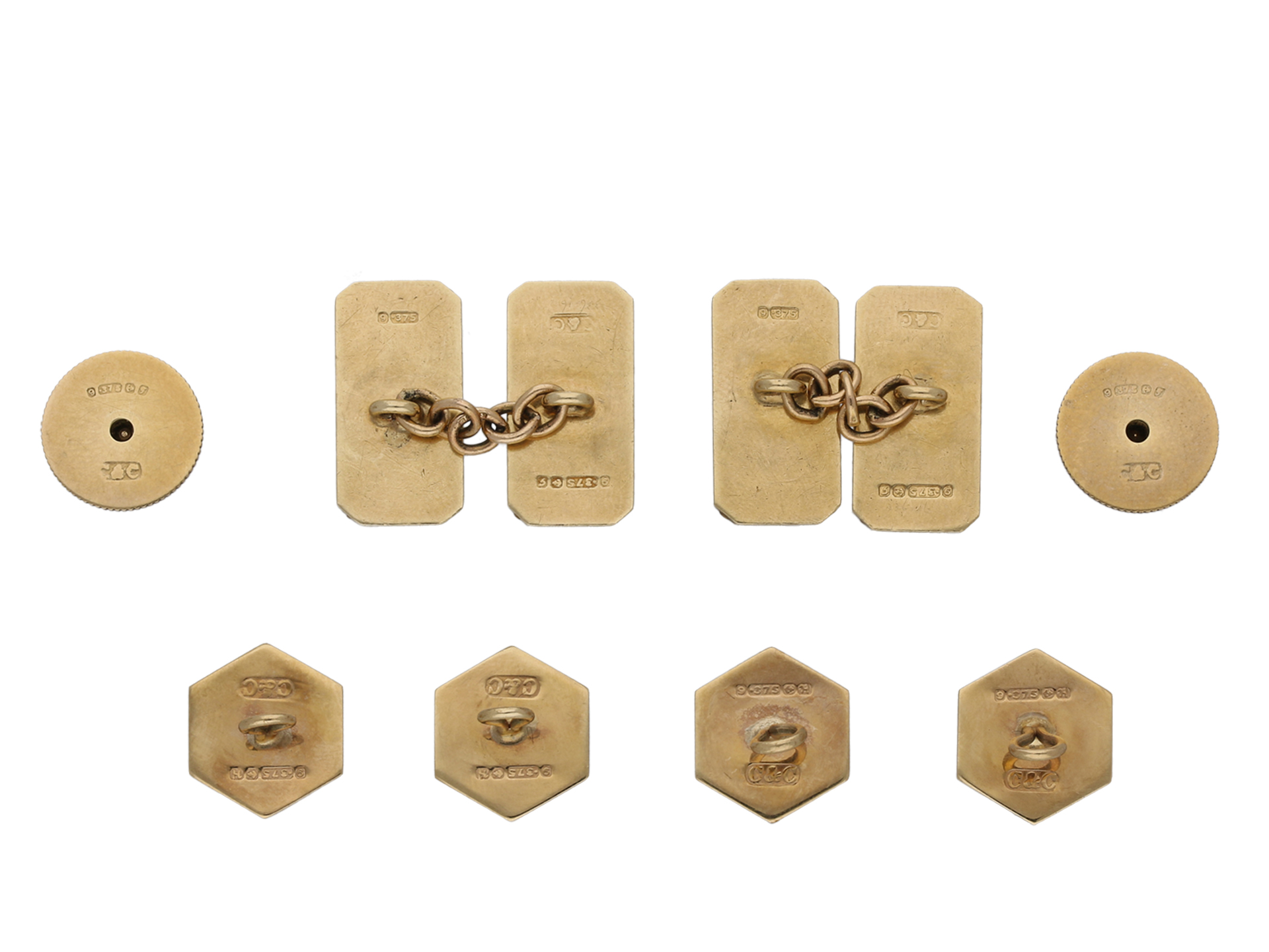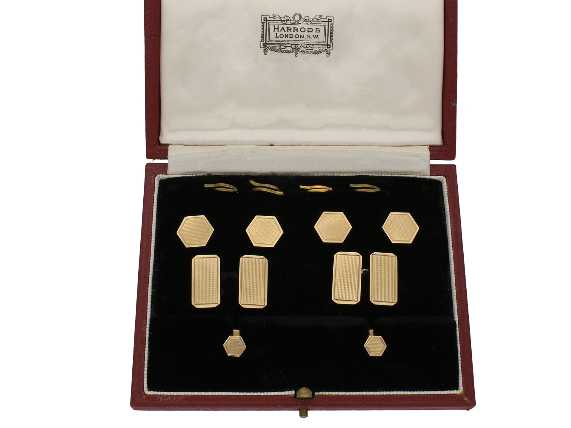 Vintage gold dress set. Full dress set comprised of a matching pair of cufflinks, two studs and four buttons, the cufflinks are comprised of rectangular plaques with engraved borders and engine turned decoration, the four buttons comprised of hexagonal plaques with matching engraved borders and engine turned decoration, the studs with matching design and round plaque on the reverse, cufflinks secured to reverse with oval gold links, cufflinks measure approximately 1.8cm in length, buttons measure approximately 1.1cm in diameter. Marked 9 carat yellow gold, total approximate weight of 11.99 grams, full hallmarks for Birmingham, maker's mark for Cohen & Charles, English, 1956, in a Harrods fitted case.