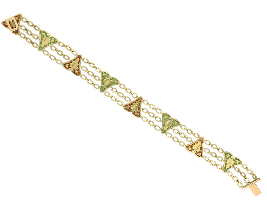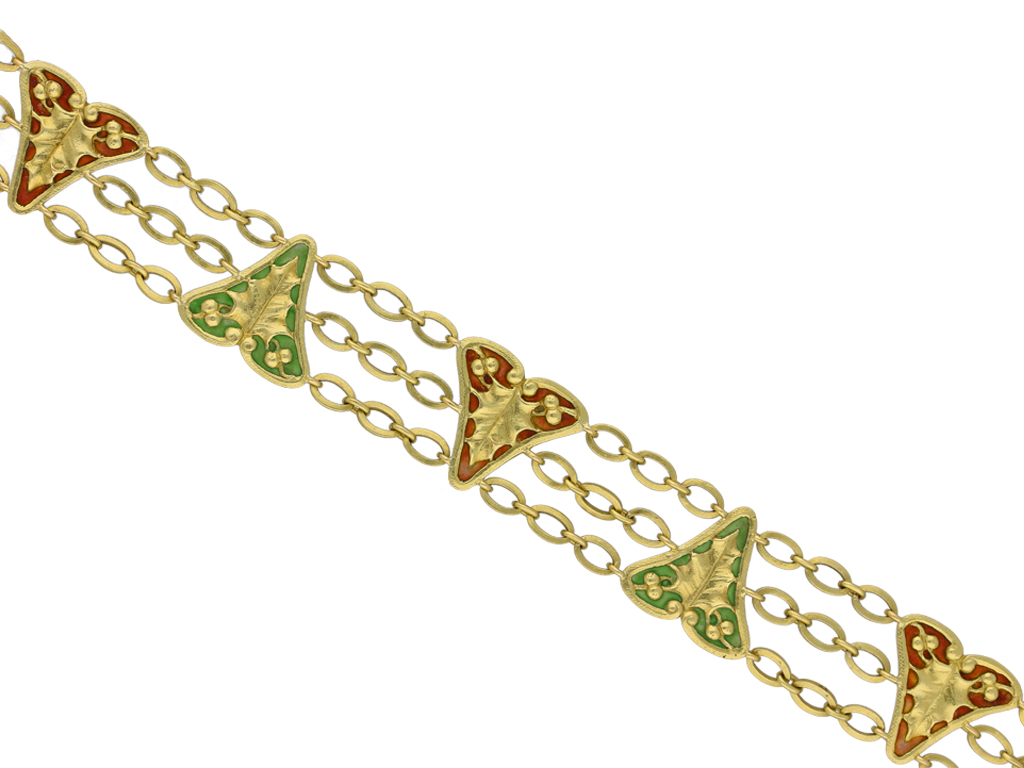 Art Nouveau plique-à-jour enamel bracelet. A yellow gold bracelet composed of eight plaques of ivy design decorated with holly and berry motifs, with alternating green or red plique-à-jour enamel background, set between three chains formed from oval links, to a secure hidden push clasp, approximately 7.5" in length. Tested 18 carat yellow gold, circa 1900.
