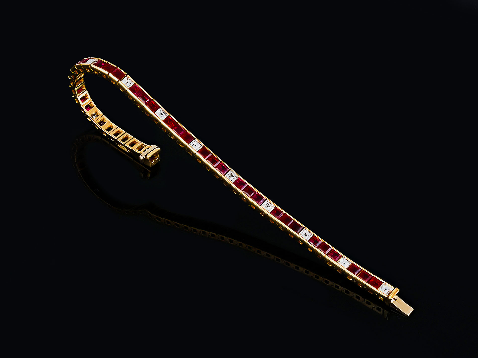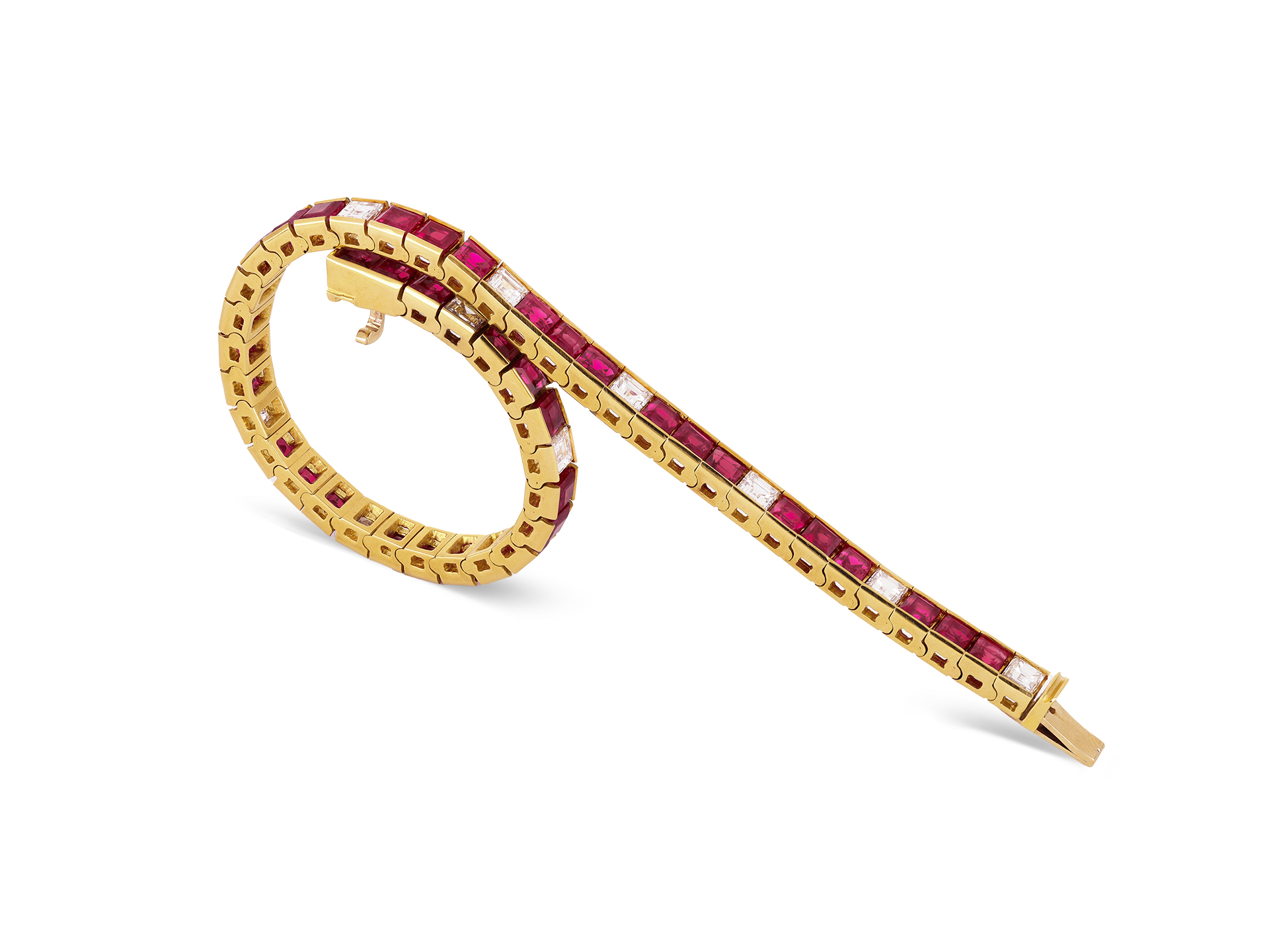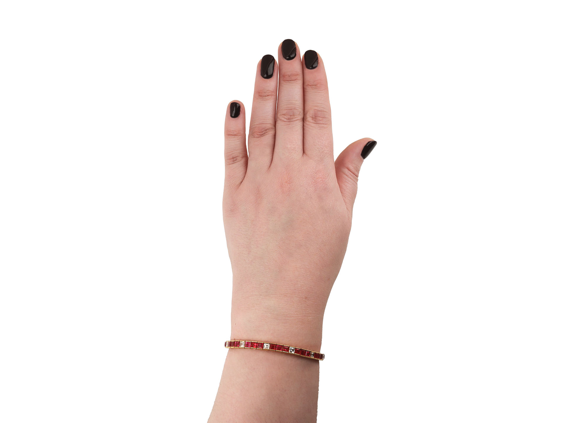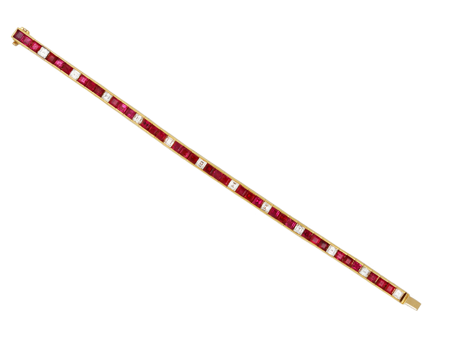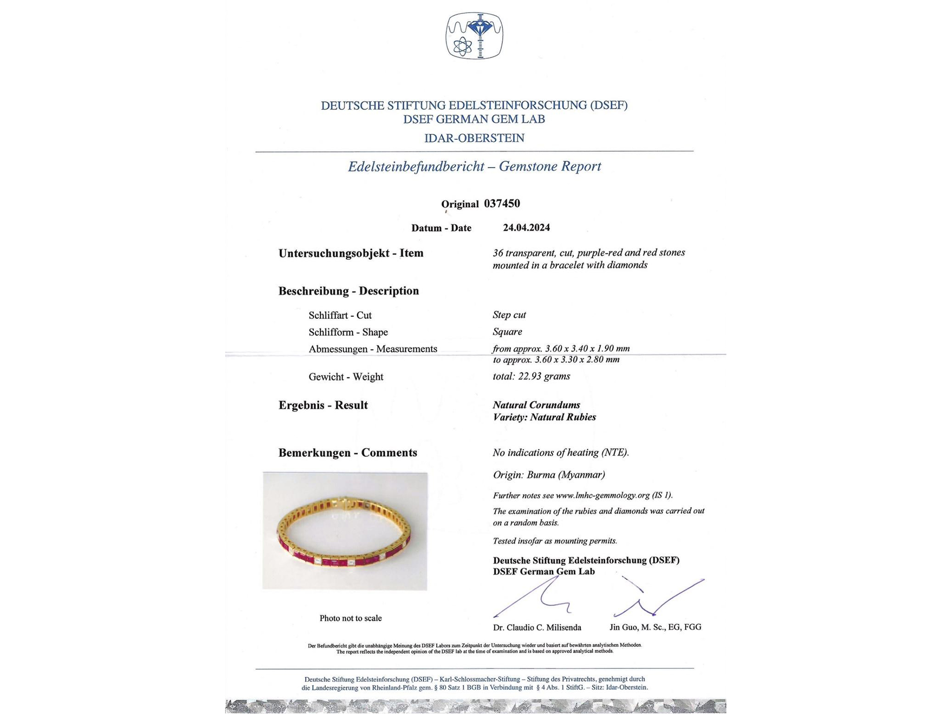 Burmese ruby and diamond line bracelet. Set with thirty-six square step cut natural unenhanced Burmese rubies in open back rubover settings with a combined approximate weight of 10.10 carats, interspersed with twelve square step cut diamonds in open back rubover settings with an approximate combined weight of 3.00 carats, to a smoothly articulating gemeotric line bracelet featuring polished edges, pierced galleries and open rectangular backholing, terminating in a secure push clasp with safety catch, approximately 7" in length. Marked 18 carat yellow gold, circa 1970, accompanied by Deutsche Stiftung Edelsteinforschung (DSEF) report #037450.
