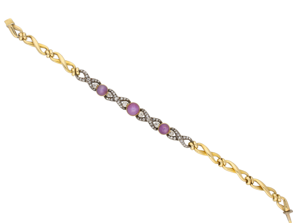 Victorian star ruby and diamond bracelet. Set with three round cabochon natural unenhanced star rubies in open back rubover settings with a combined approximate weight of 7.00 carats, flanked by six round old cut diamonds in open back rubover settings with a combined approximate weight of 0.30 carats, further decorated with sixty round old cut diamonds in open back grain settings with a combined weight of 1.20 carats. The total approximate diamond weight is 1.50 carats, to an elegant articulated bracelet, flowing with movement, featuring of gold infinity links, polished borders and open backholing, fitted with a secure push pin clasp, approximately 7" in length. Marked 18 carat yellow gold and tested silver, French control marks, circa 1890.