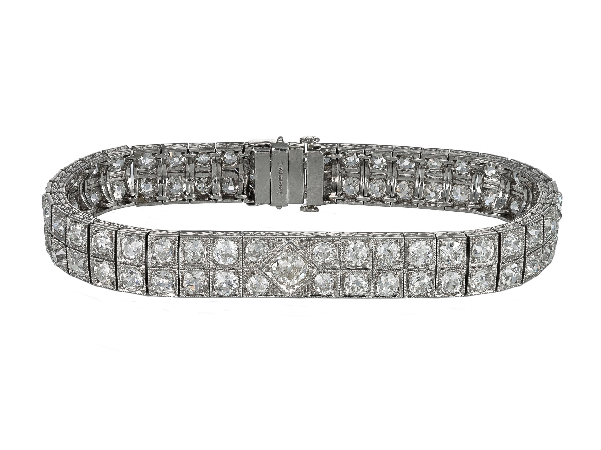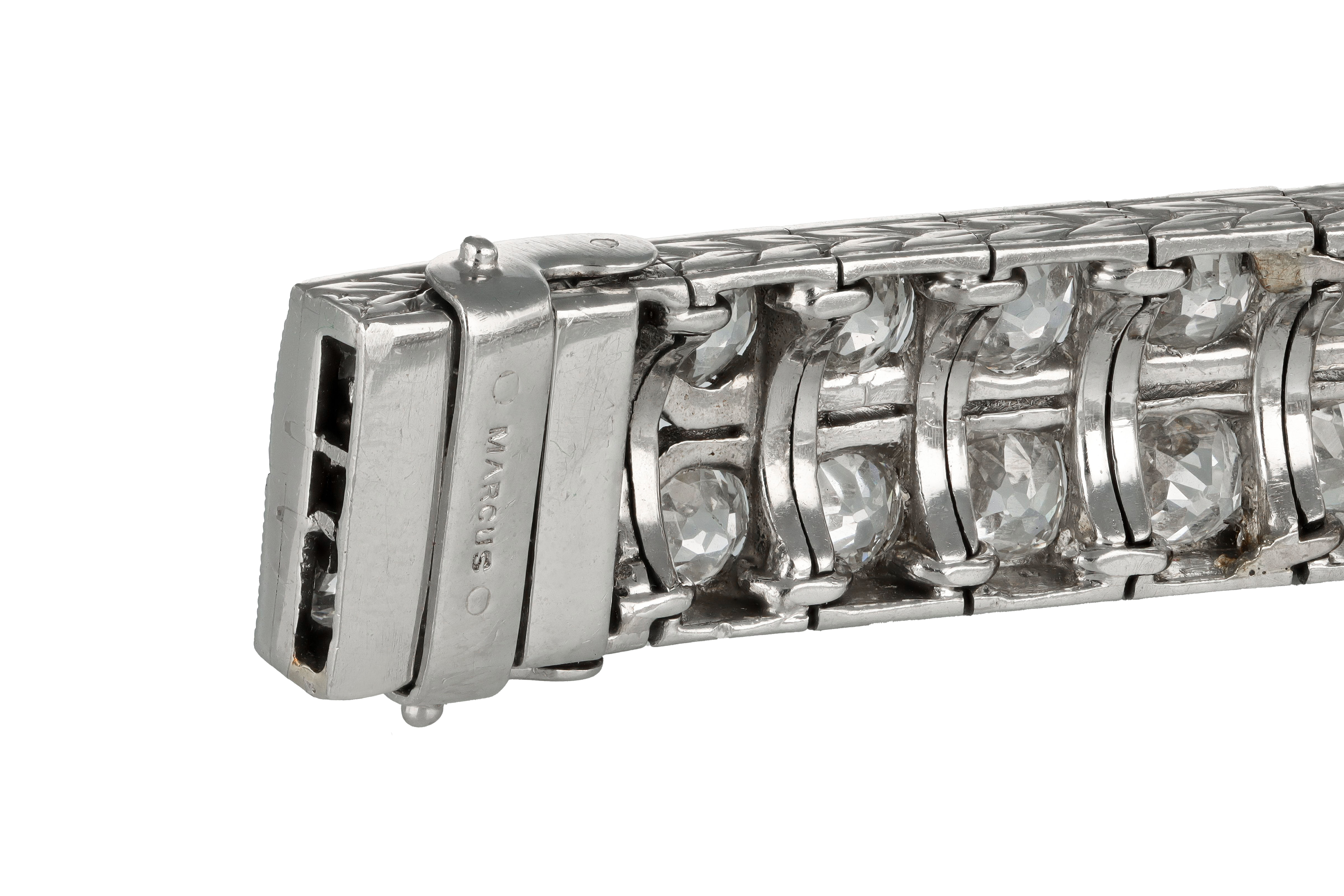 Marcus & Co. diamond bracelet. Set with two cushion shape old mine diamonds in open back grain settings with a combined approximate weight of 1.20 carats, and further set with seventy-eight cushion shape old mine diamonds in open back grain settings with a combined weight of 14.40 carats. The total approximate diamond weight is 15.60 carats, to an exceptional geometric design featuring millegrain edging, a decoratively engraved gallery and fancy shape open backholing, terminating in a secure clasp with safety catch, approximately 6.7" in length. Tested platinum and Iridium, signed 'Marcus' for Marcus & Co., American, circa 1920.