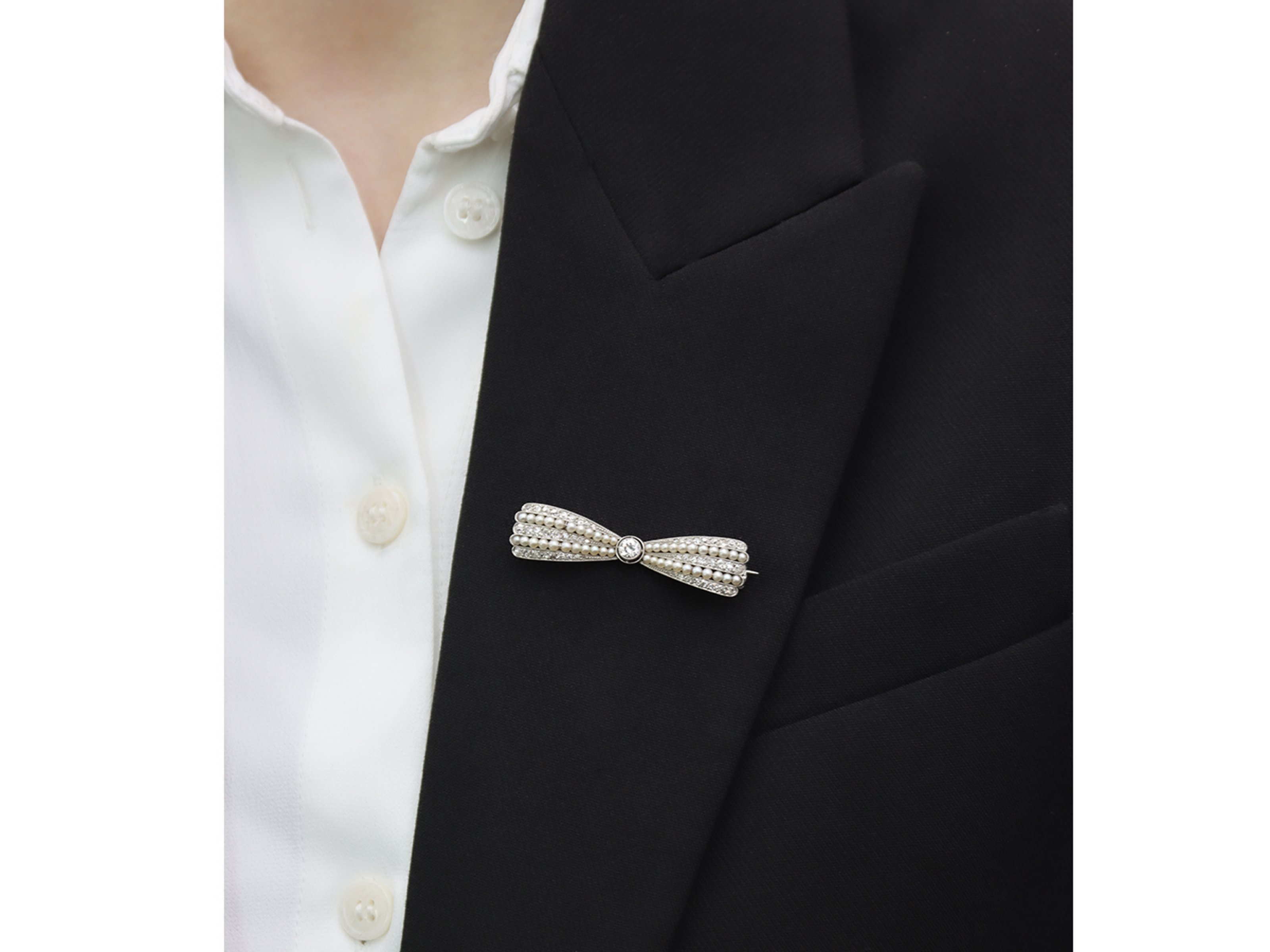Pearl and diamond bow brooch. Set with a central round old cut diamond in an open back rubover setting with an approximate weight of 0.25 carats, further decorated with fifty-four round old cut diamonds in open back grain settings with a combined weight of 1.50 carats and featuring forty four round pearls. The total approximate diamond weight is 1.75 carats, all to an elegant bow brooch with millegrain edging, a linear pierced gallery and open backholing, fitted to reverse with a secure pin and c-clasp, approximately 4.8cm long and 1.2cm in height. Tested platinum, circa 1905.