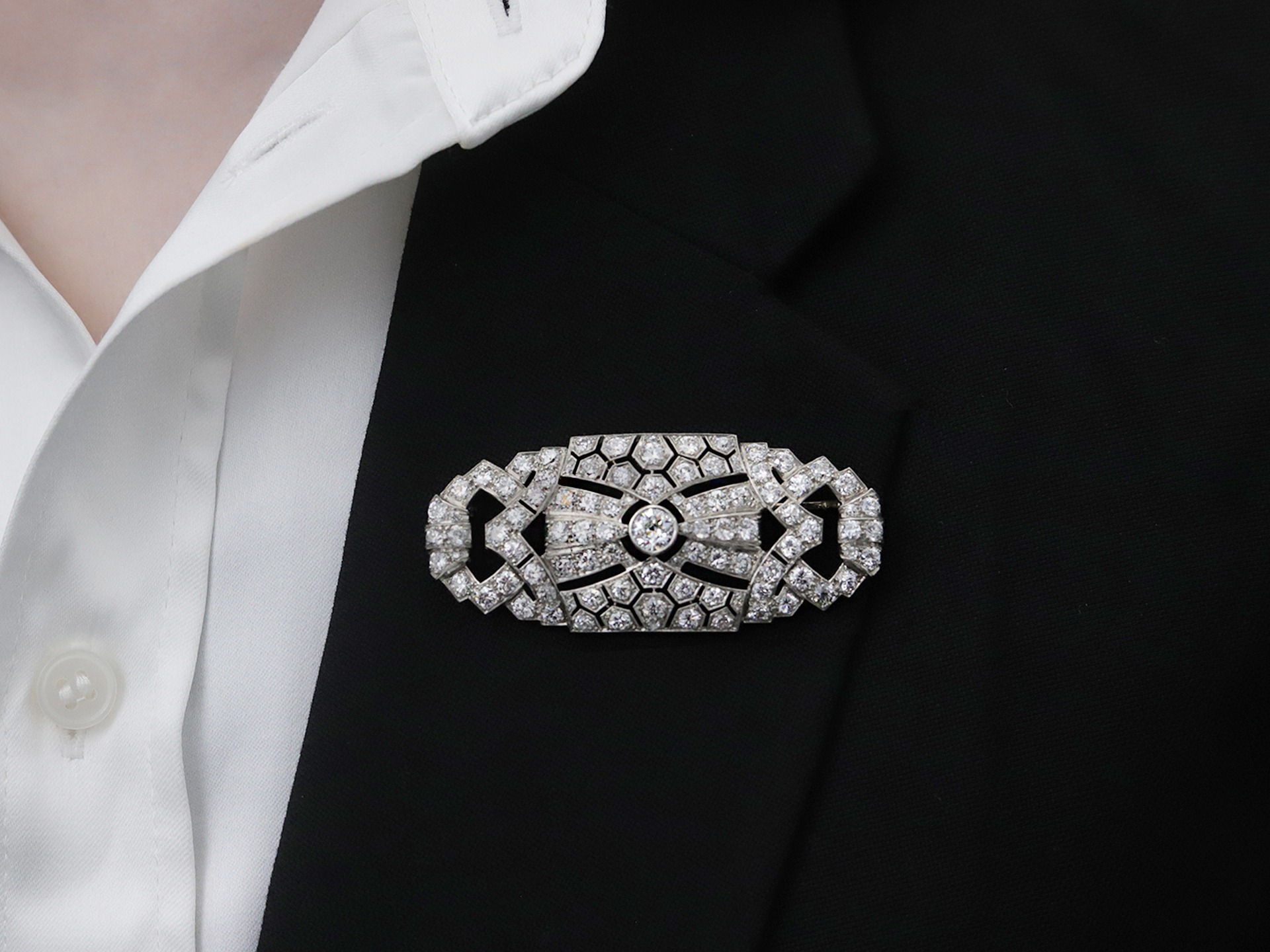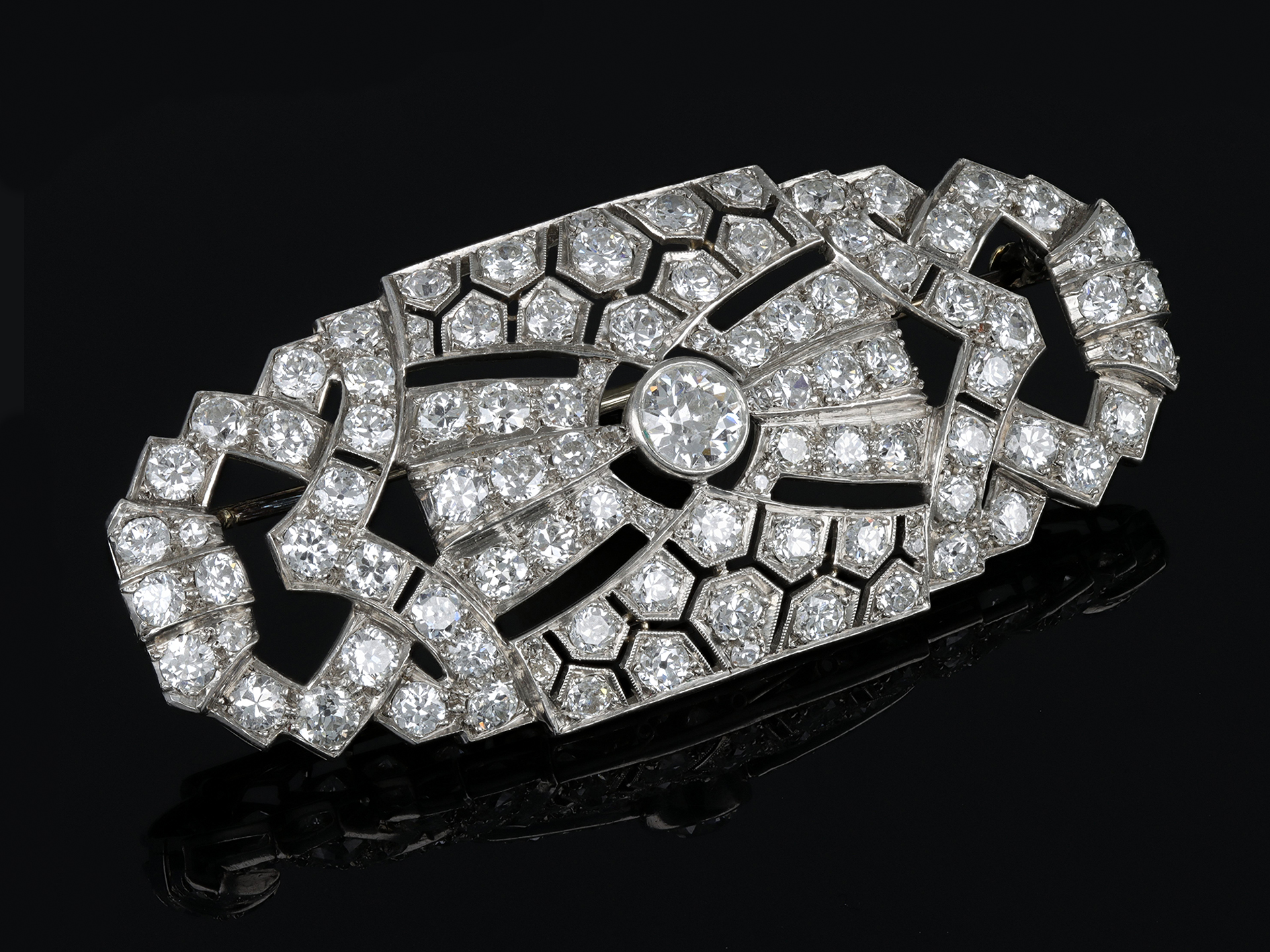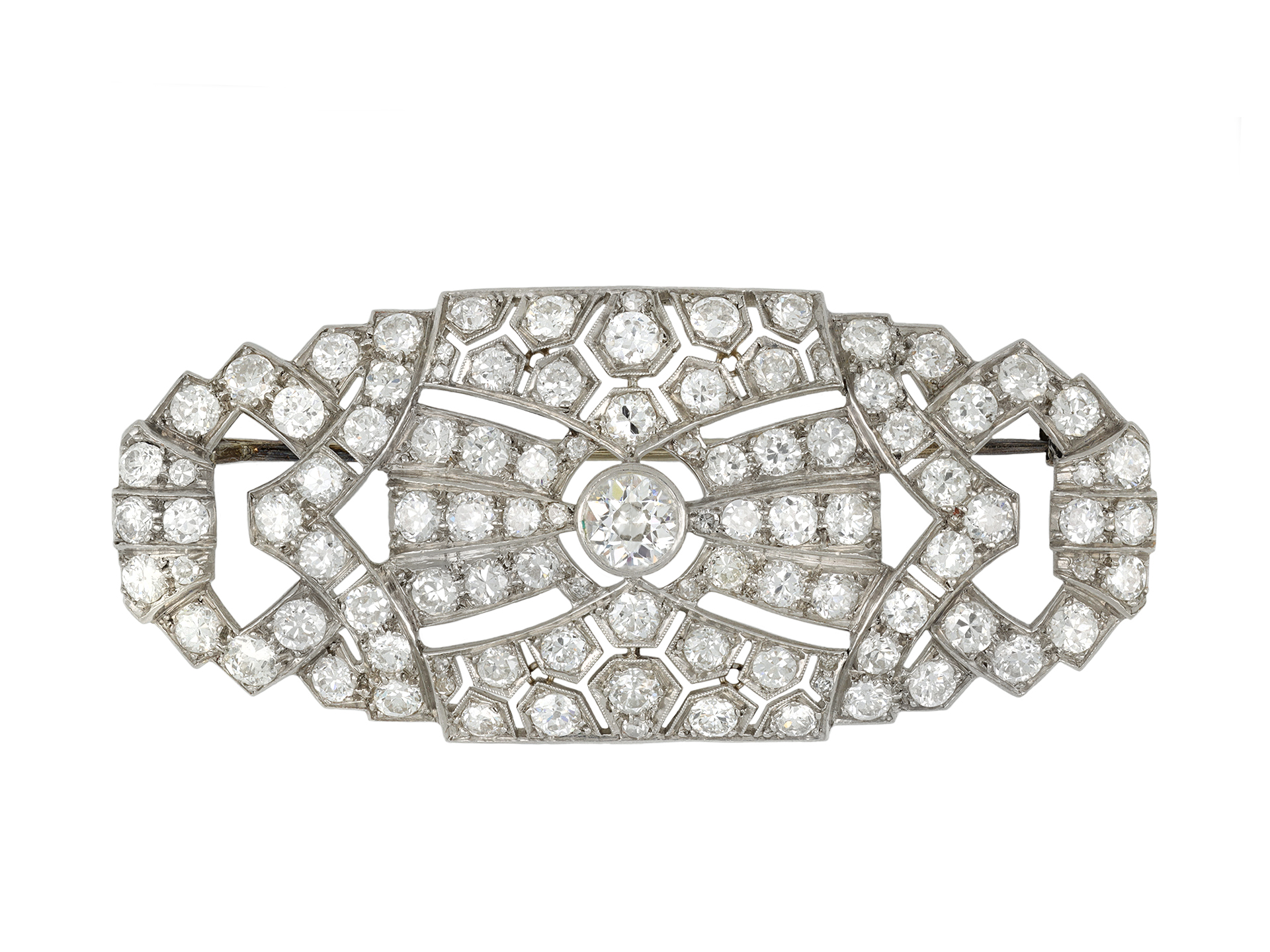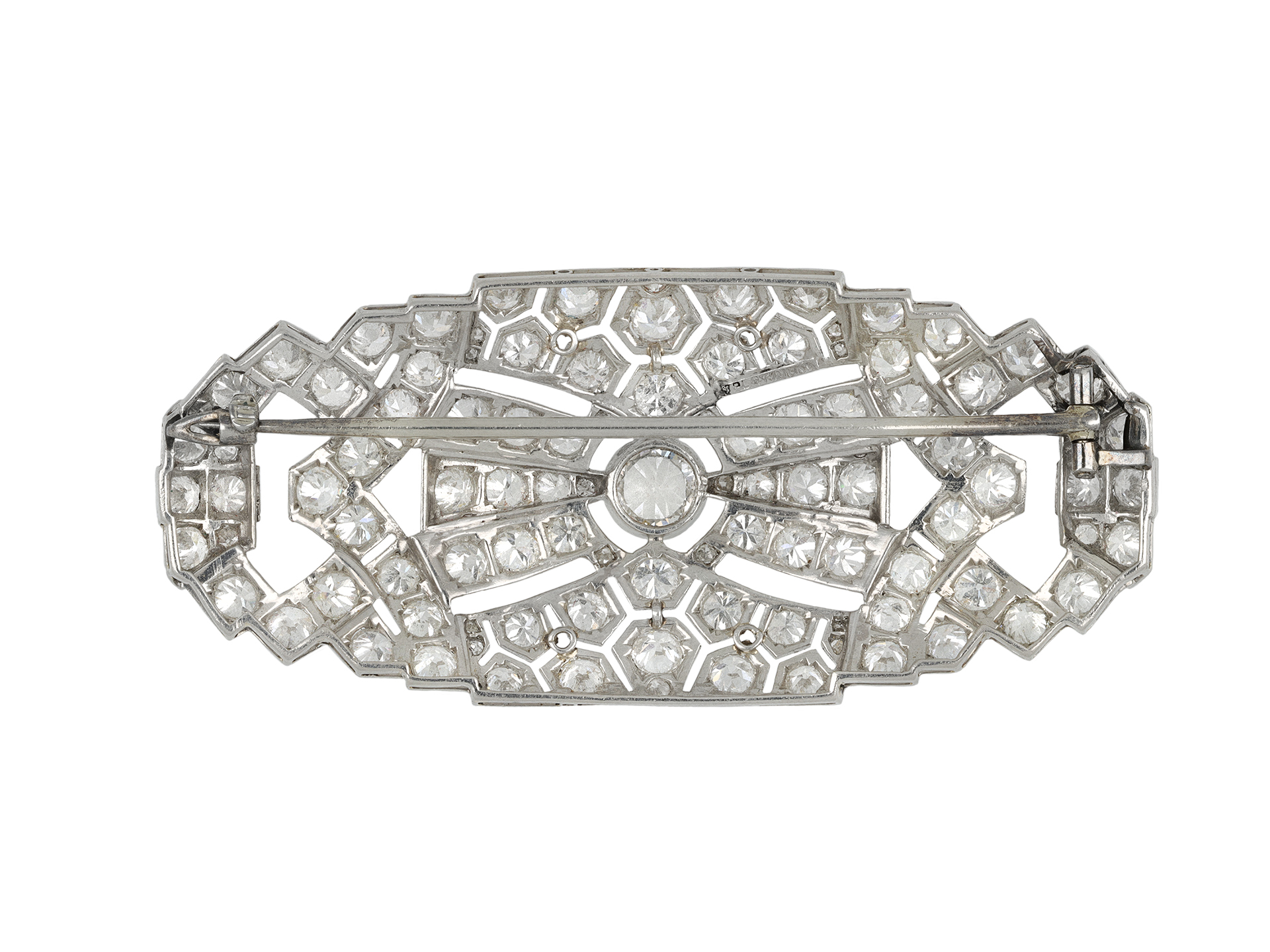 Art Deco diamond brooch. Set to centre with one round old cut diamond in an open back rubover setting with an approximate weight of 0.85 carats, adorned by 100 round mixed old cut diamonds in open back grain settings with an approximate weight of 8.30 carats. The total approximate diamond weight is 9.15 carats, to an impressive design featuring intricate openwork with millegrain edging throughout, an open gallery with chenier detailing and fancy open backholing, fitted to reverse with a secure pin and safety catch, approximately 6cm in length. Marked platinum, fittings tested white gold, circa 1920.