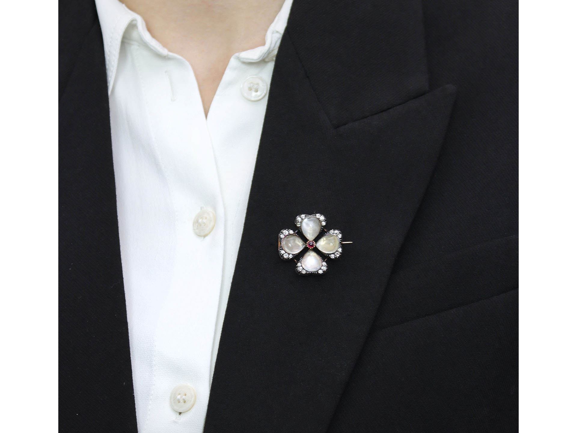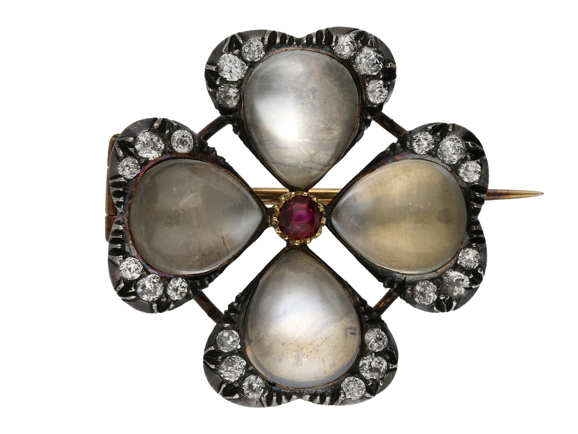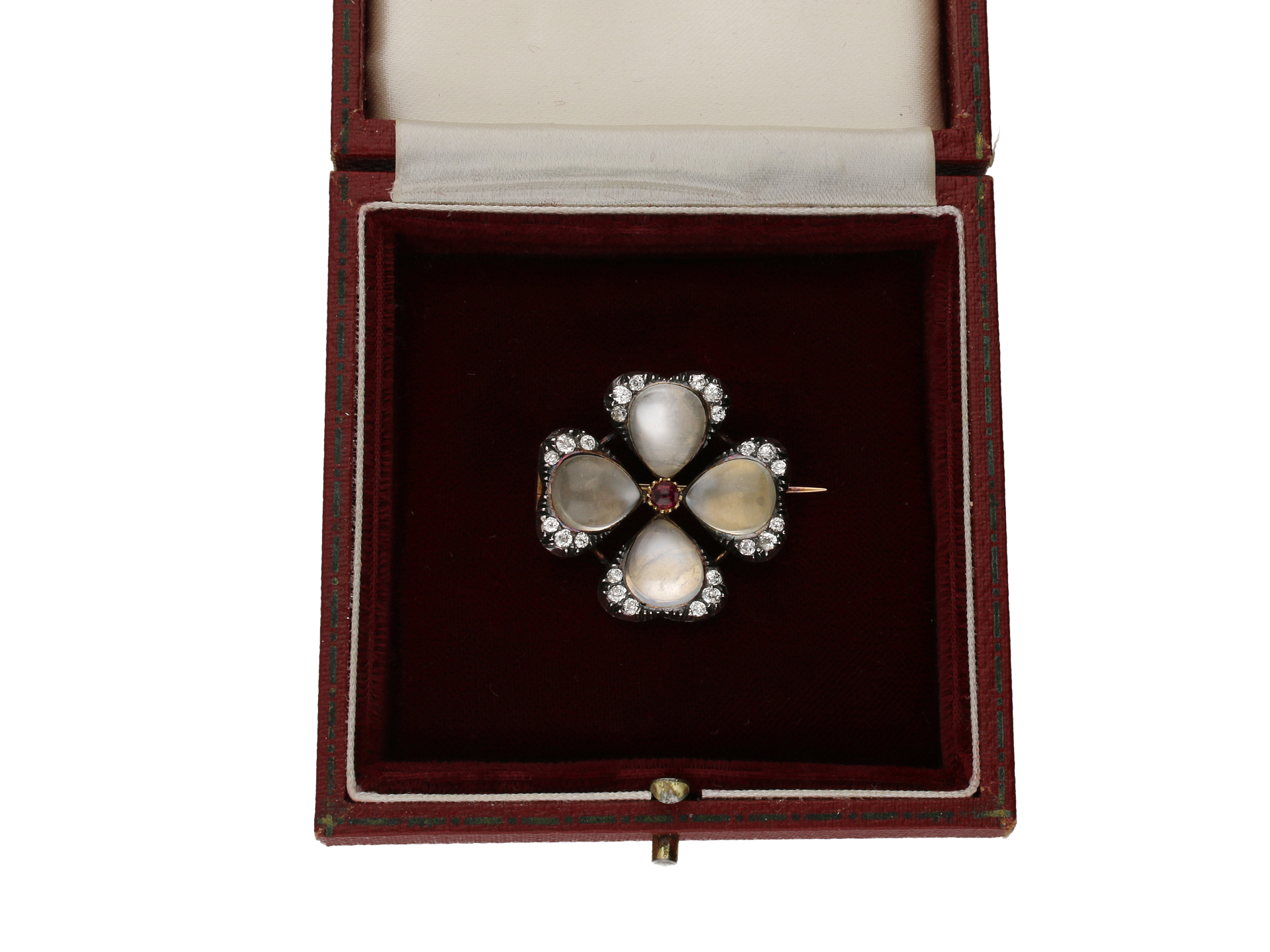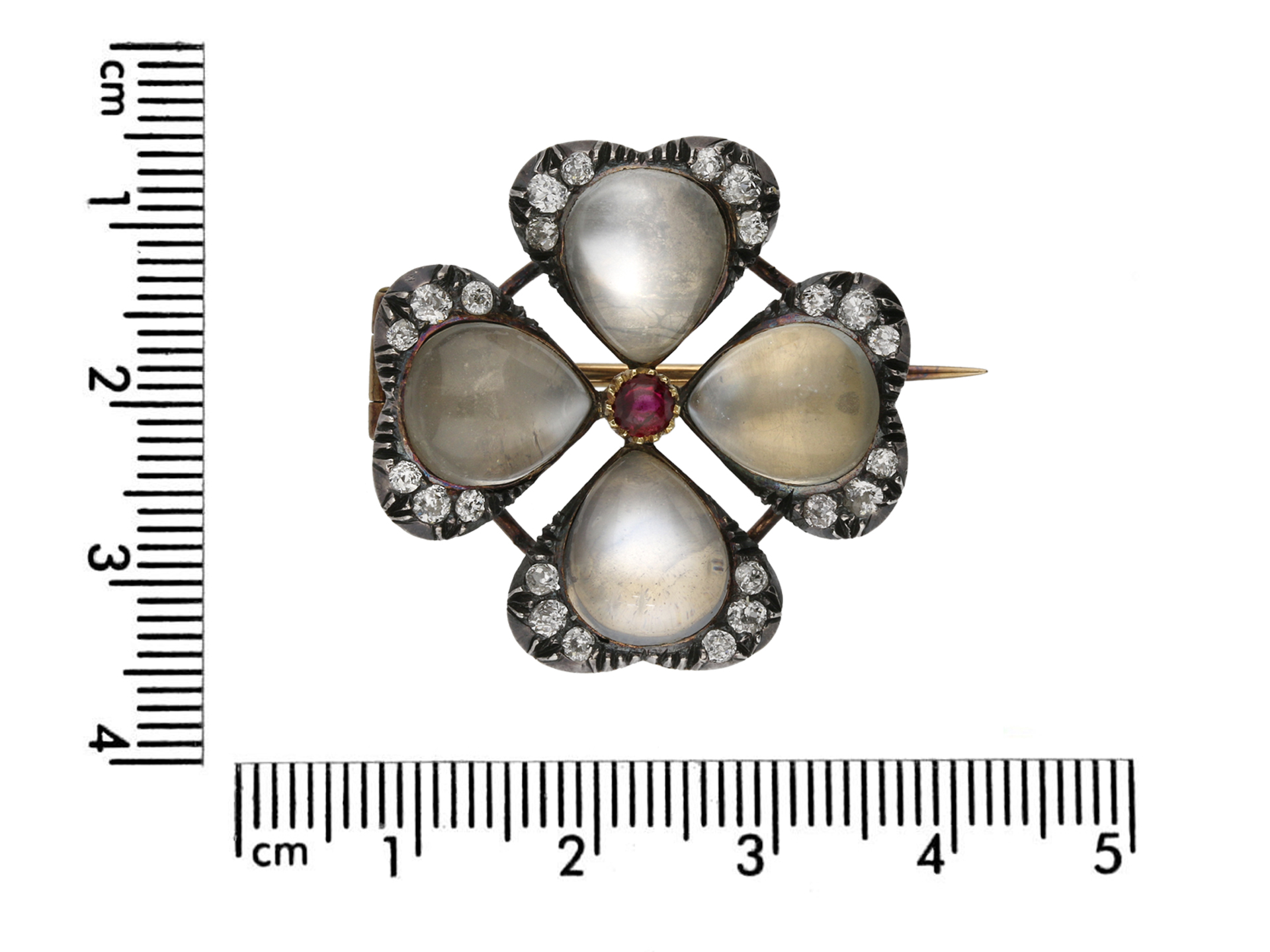 Carlo & Arthur Giuliano moonstone brooch. Set with four drop shape cabochon moonstones in closed back rubover settings with an approximate combined weight of 10.00cts, further set with twenty-four round old cut diamonds in open back clut-down settings with a combined approximate weight of 0.60 carats, and decorated with a round cabochon natural ruby in an open back claw settings with an approximate weight of 0.25 carats, all to a quatrefoil design with openwork detailing and closed and open backholing, fitted to reverse with a secure pin and c-clasp. Tested yellow gold with silver settings, approximately 8.8 grams in weight, maker's mark 'C&AG' for Carlo & Arthur Giuliano, circa 1890.