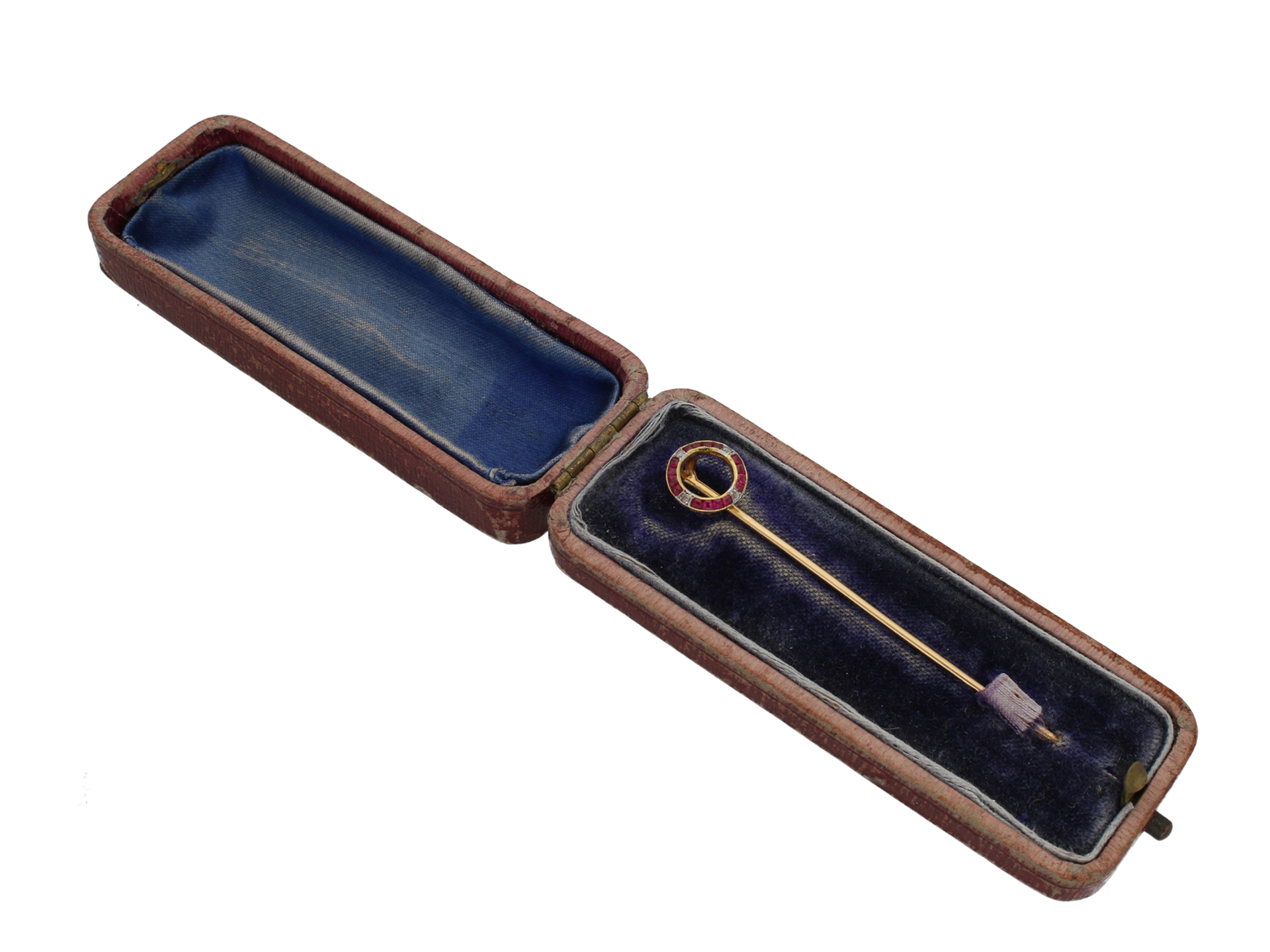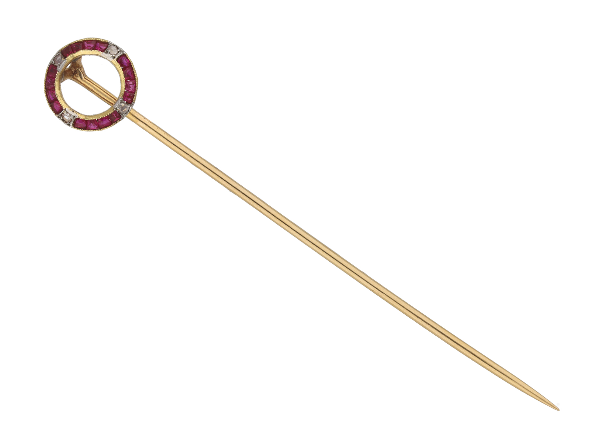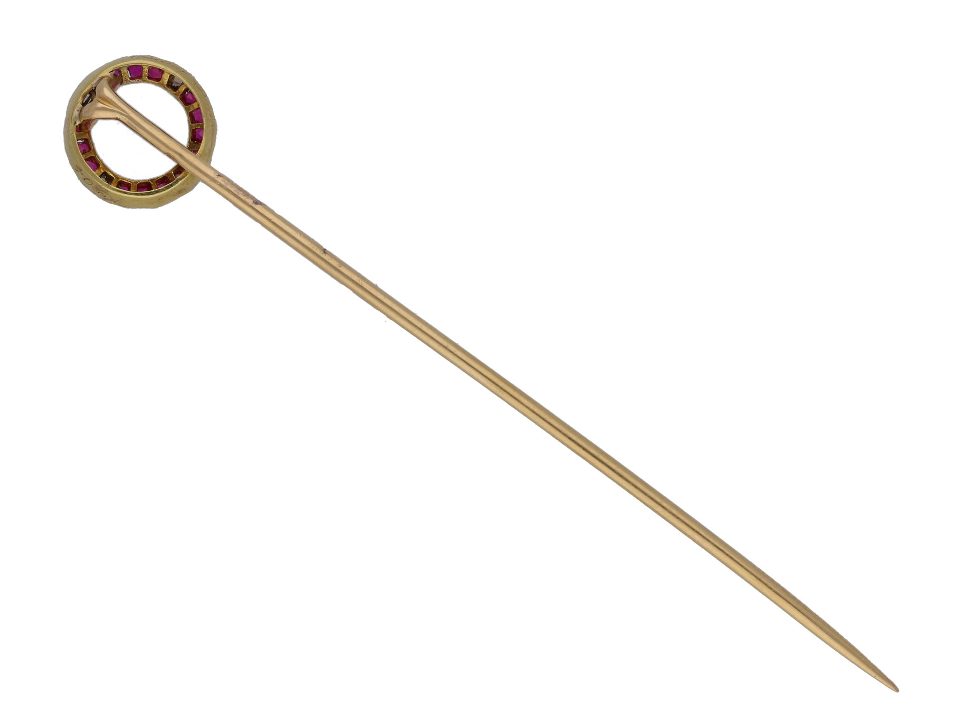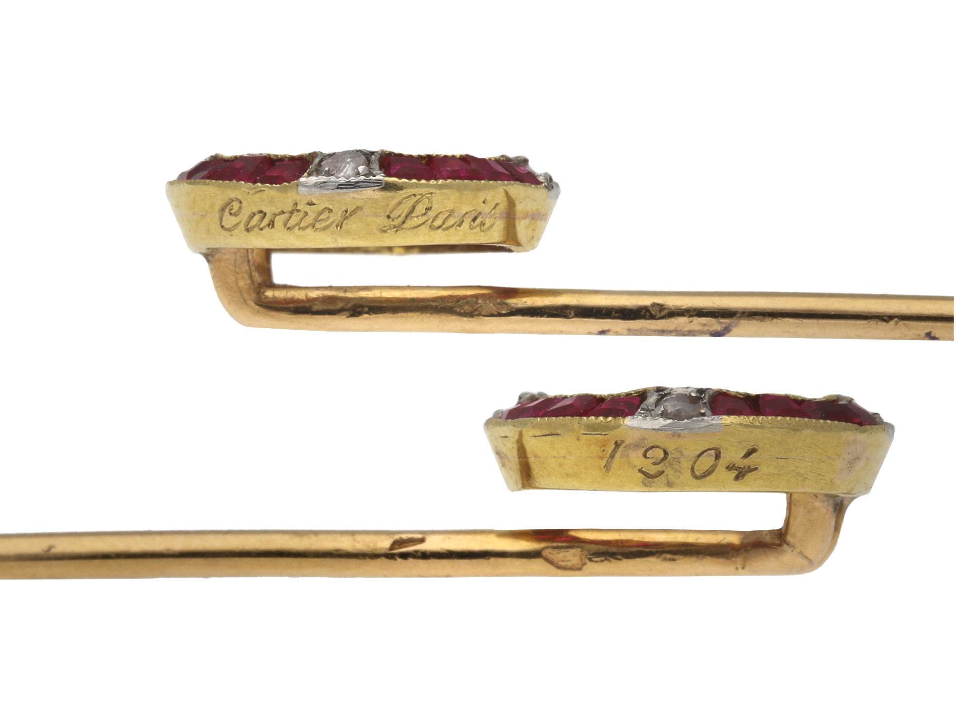 Cartier ruby and diamond winning post pin. Set with sixteen calibre cut natural unenhanced rubies in open back channel settings with an approximate combined weight of 0.50 carats, further enhanced by four round rose cut diamonds in open back grain settings with an approximate combined weight of 0.04 carats, to a hoop design with decorative millegrain borders and fancy backholing, leading to a fine pin bar, approximately 6.9cm in length. Marked 18 carat yellow gold, signed 'Cartier Paris', numbered '1204', French, circa 1910.