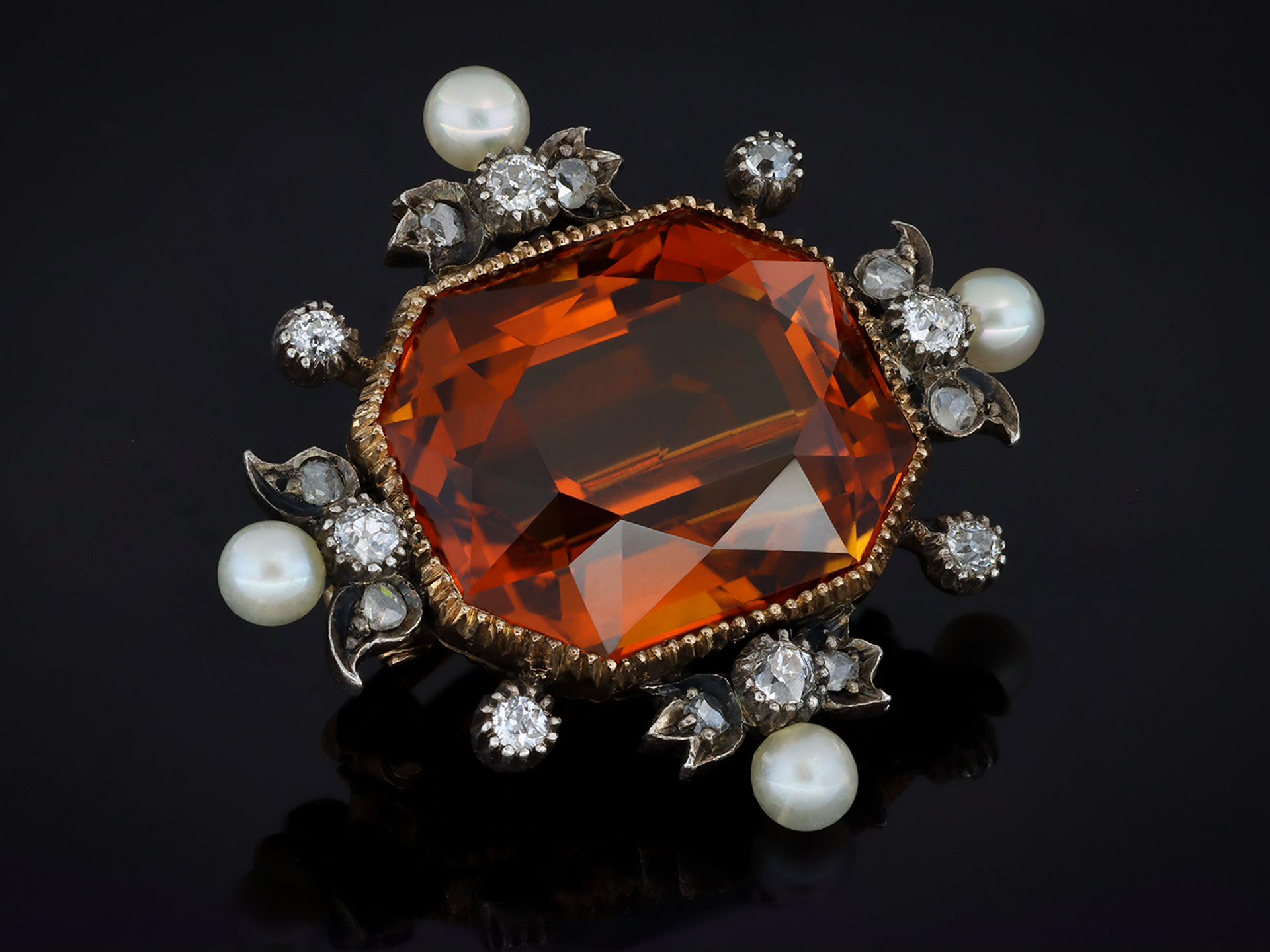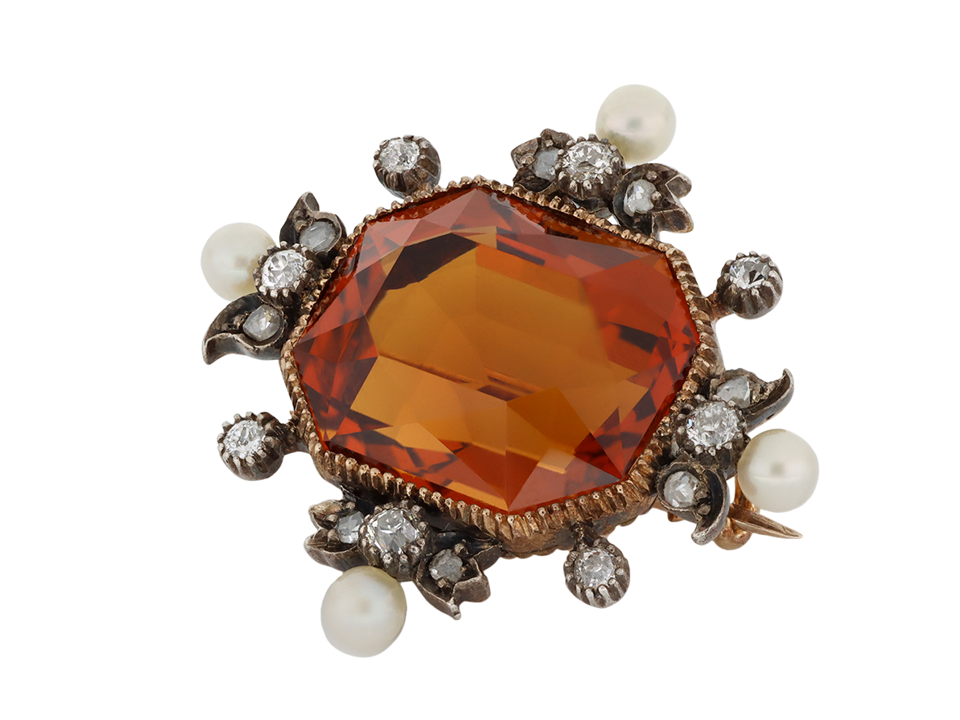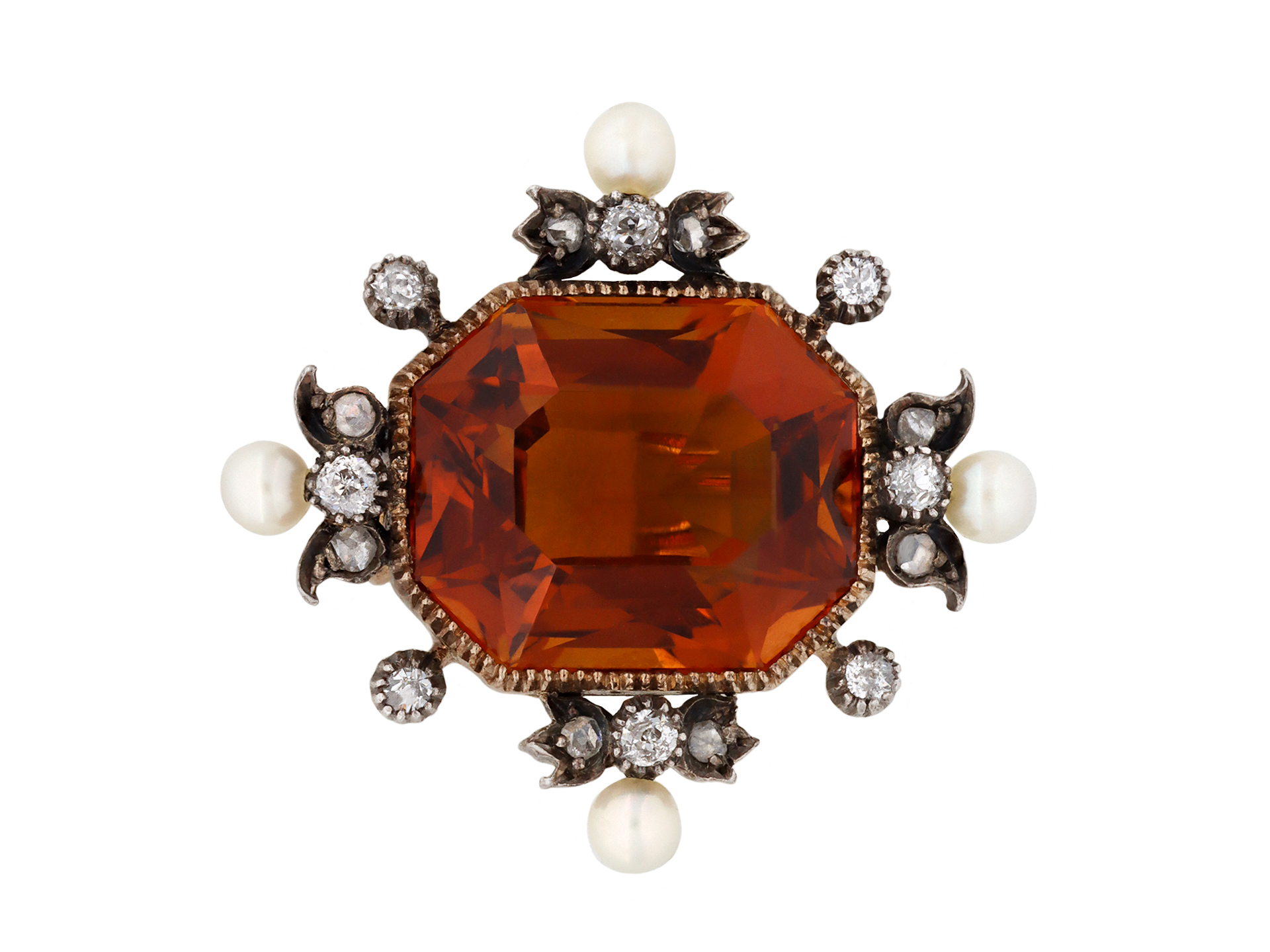 Citrine, pearl & diamond brooch. Set to centre with an octagonal old cut natural citrine in a open back rubover setting with an approximate weight of 11.35 carats, encircled by eight cushion shape old mine diamonds in open back rubover settings with a combined approximate weight of 0.35 carats, further adorned with eight round rose cut diamonds in open back grain settings with a combined weight of 0.08 carats, further set with four round natural pearls in closed back half drilled settings, approximately 3 x 3mm. The total approximate diamond weight is 0.43 carats, to an elegant brooch featuring millegrain edging, stylised foliate motifs and open backholing, fitted to reverse with a secure hinge pin and scroll clasp. Tested silver and rose gold, circa 1860.