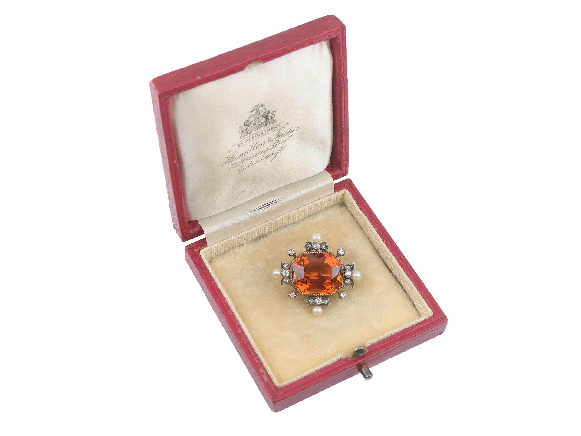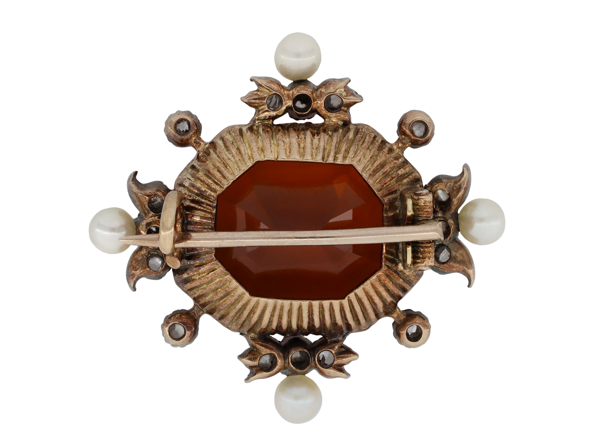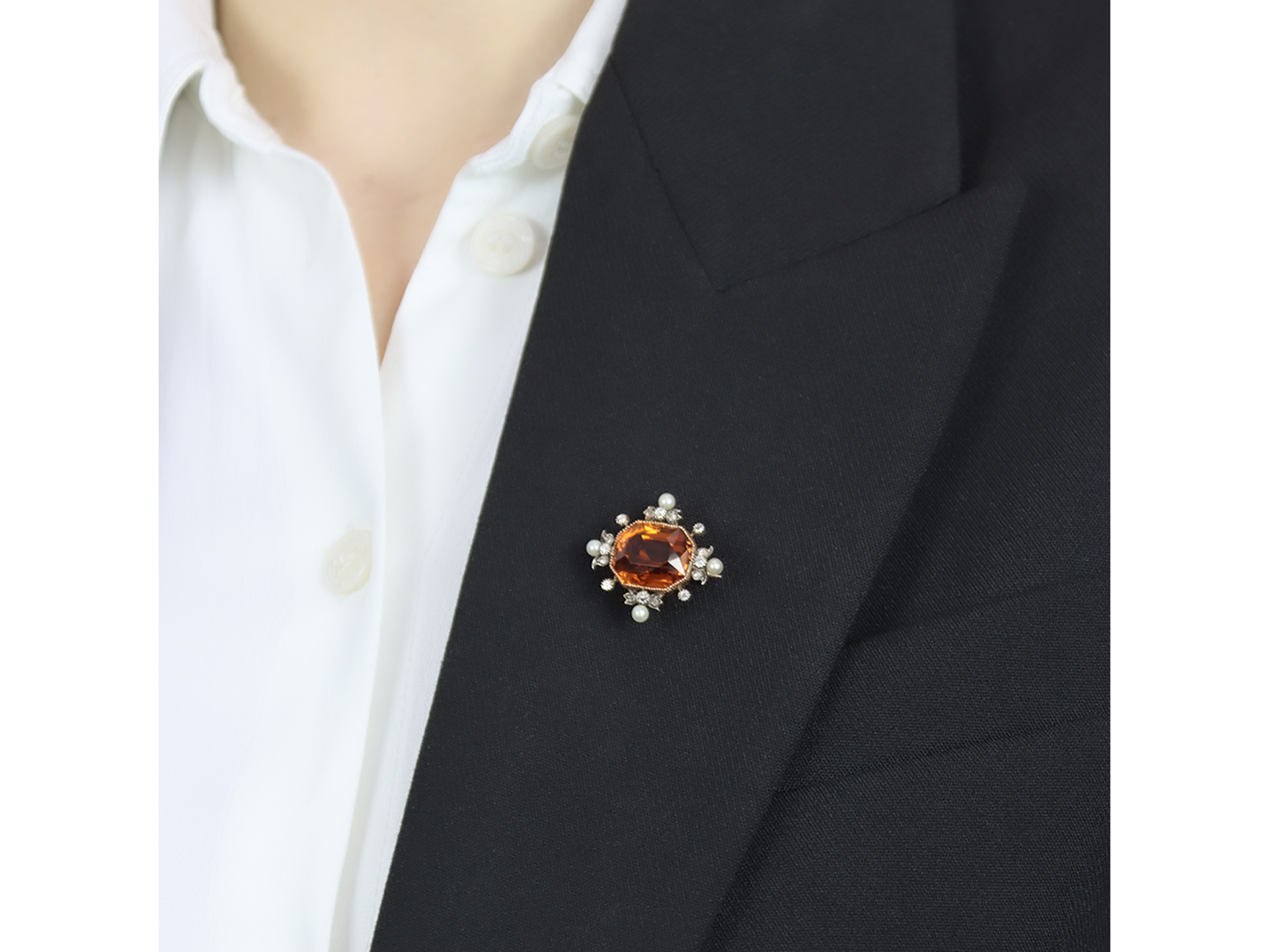 Citrine, pearl & diamond brooch. Set to centre with an octagonal old cut natural citrine in a open back rubover setting with an approximate weight of 11.35 carats, encircled by eight cushion shape old mine diamonds in open back rubover settings with a combined approximate weight of 0.35 carats, further adorned with eight round rose cut diamonds in open back grain settings with a combined weight of 0.08 carats, further set with four round natural pearls in closed back half drilled settings, approximately 3 x 3mm. The total approximate diamond weight is 0.43 carats, to an elegant brooch featuring millegrain edging, stylised foliate motifs and open backholing, fitted to reverse with a secure hinge pin and scroll clasp. Tested silver and rose gold, circa 1860.
