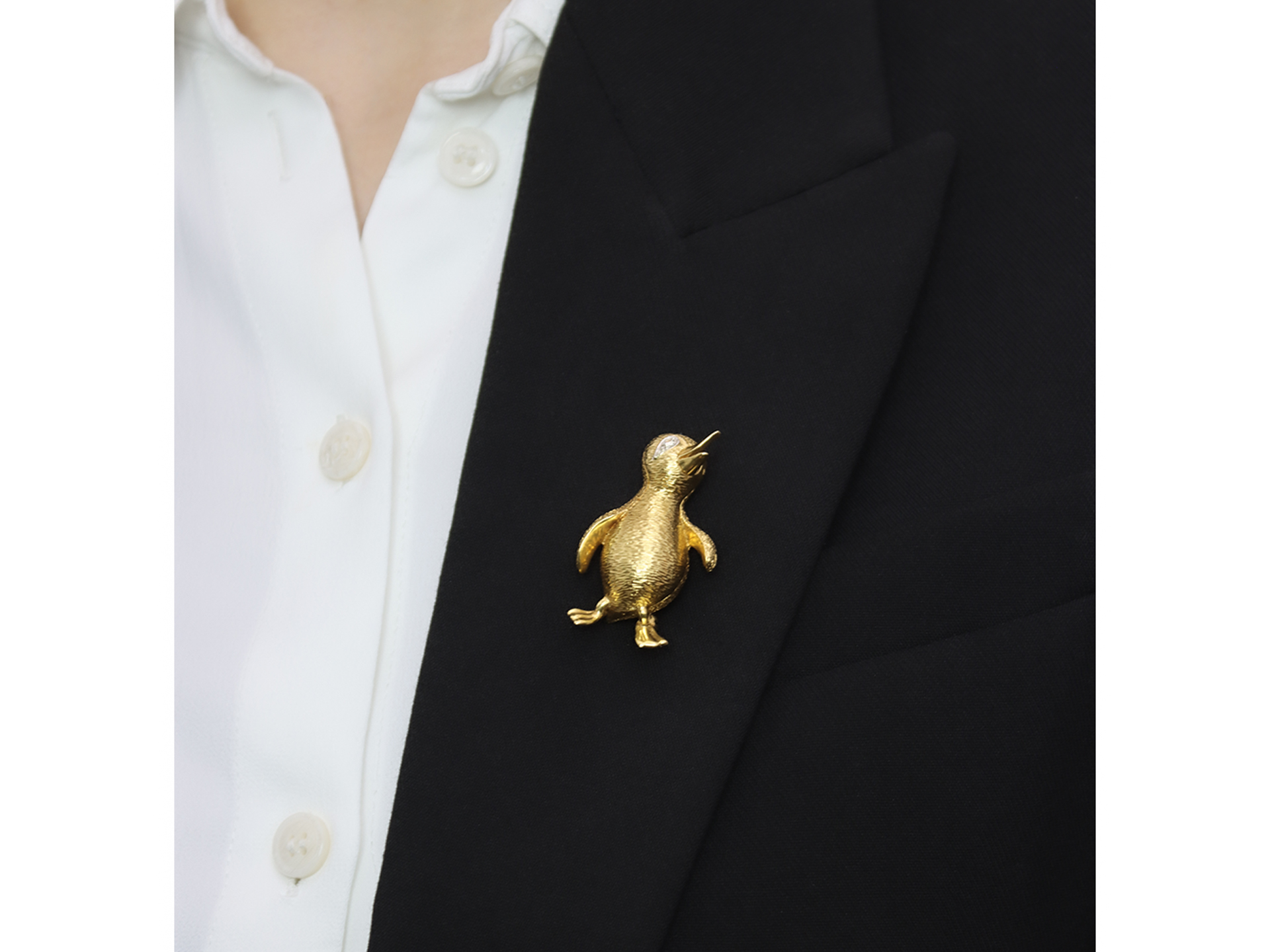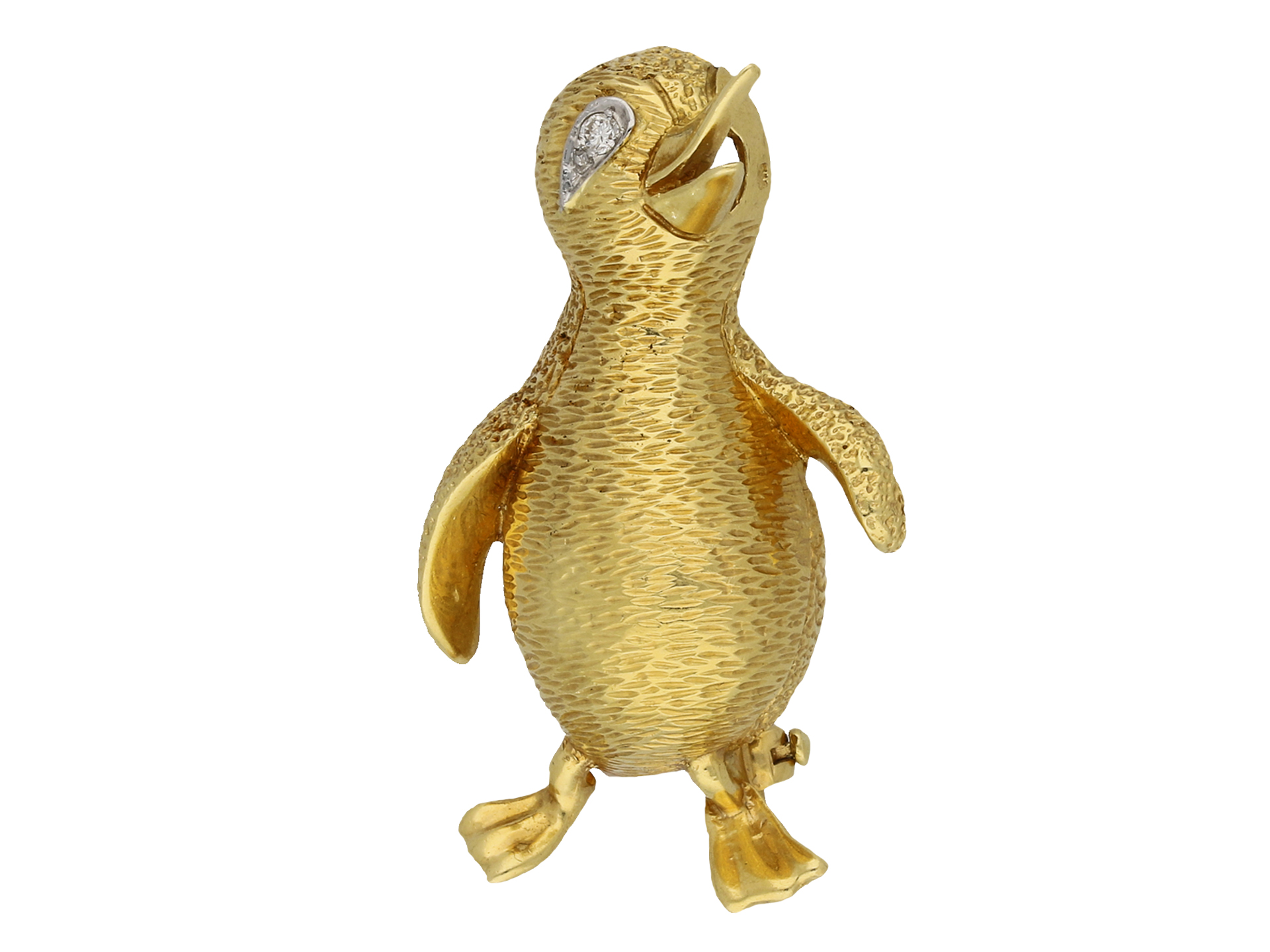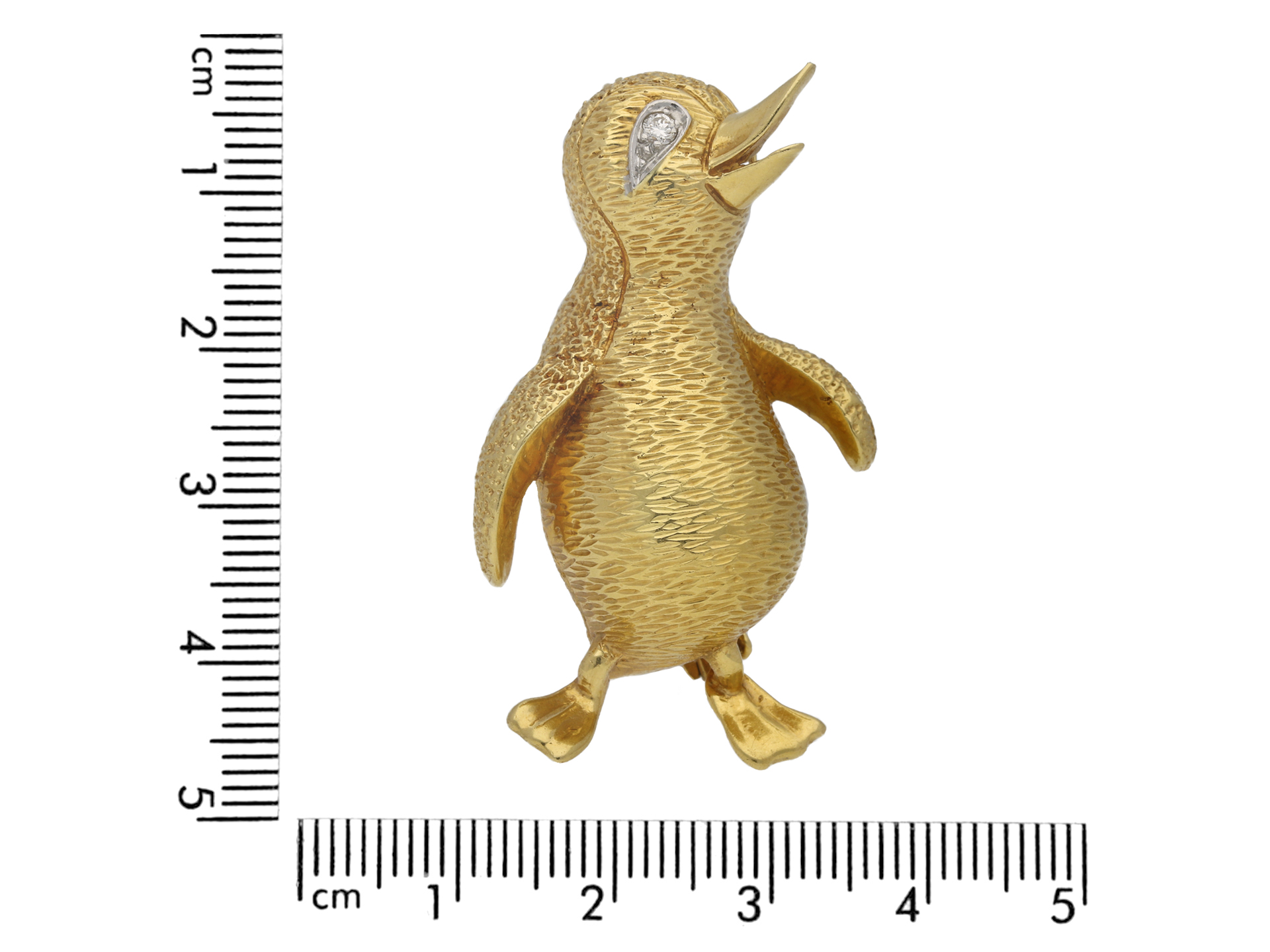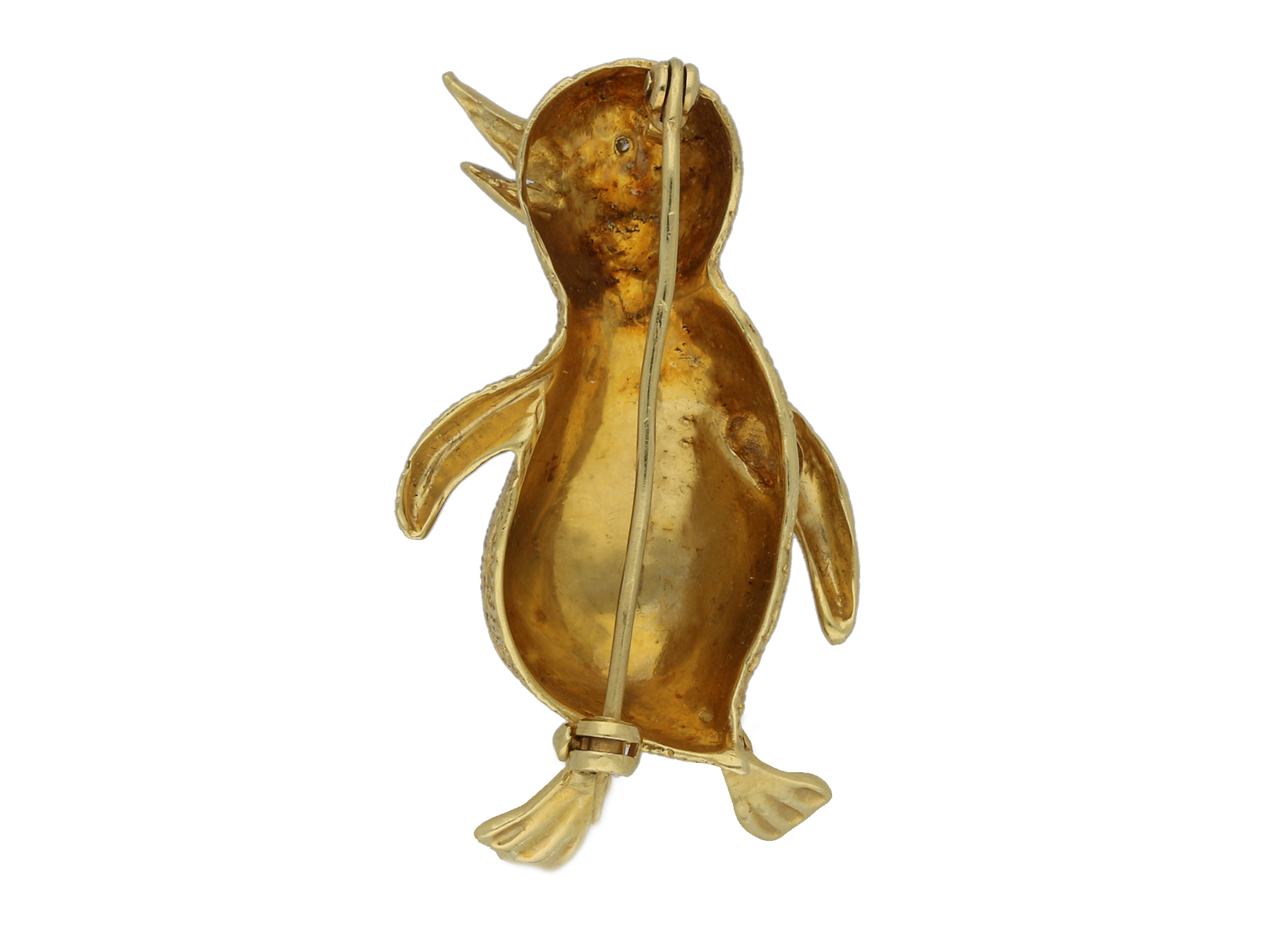 Diamond and gold penguin brooch. Set with a round brilliant cut diamond in an open back grain and rubover setting with an approximate weight of 0.05 carats, to a yellow gold penguin brooch featuring an engraved textured finish and fitted to the reverse with a secure hinged pin and clasp. Tested yellow gold and platinum, Austrian import mark, circa 1960.