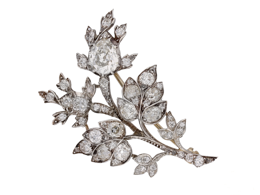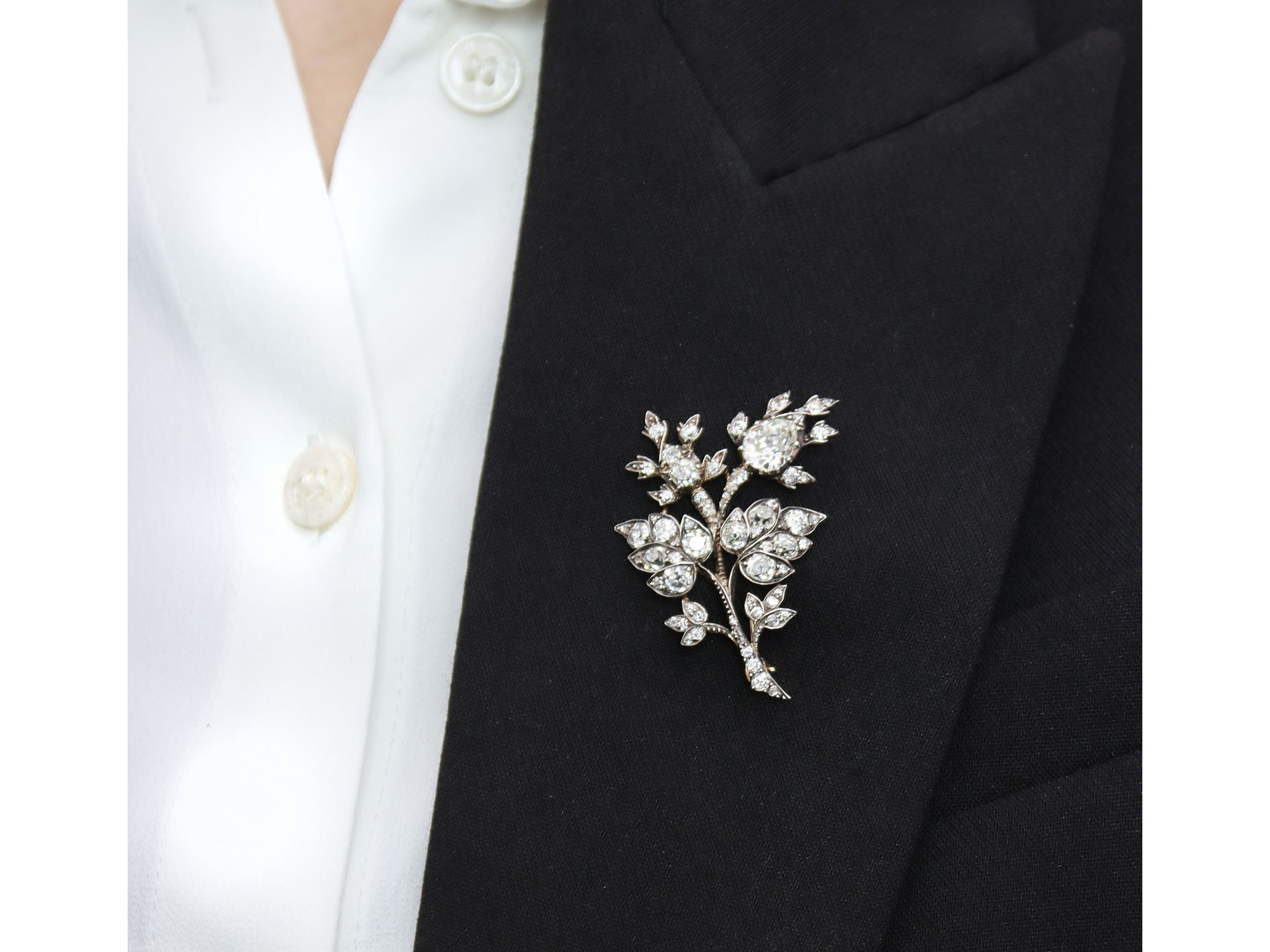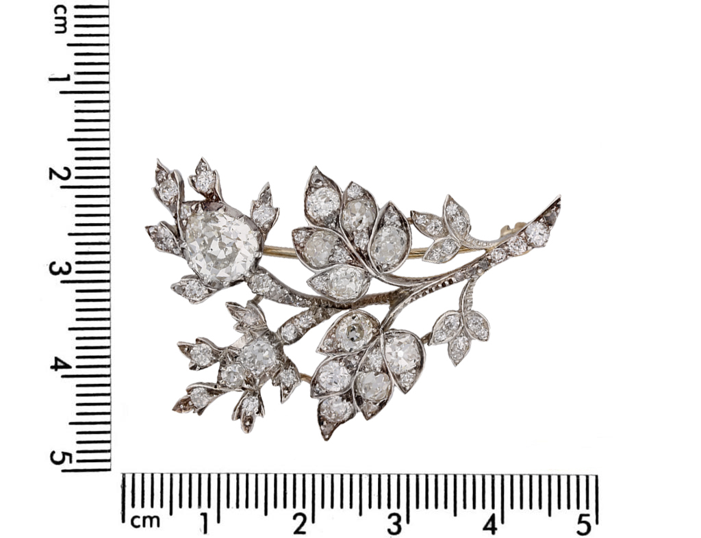 Diamond floral spray brooch. Set with one drop shape old mine diamond in an open back cutdown setting with a weight of 1.80 carats, and fifty one cushion shape old mine diamonds in open back cutdown and grain settings with a combined weight of 3.90 carats, and ten round single cut diamonds in open back grain settings with a combined weight of 0.15 carats and further set with seven round rose cut diamonds in open back grain settings with a combined weight of 0.15 carats. The total approximate diamond weight is 6.00 carats, to an elegant nature inspired brooch, with a finely modeled spray of flowers and leaves with fancy shaped backholing and secure hinged pin and C-clasp fitting to reverse, approximately 4.5cm in length. Tested yellow gold and silver settings, English, circa 1850.