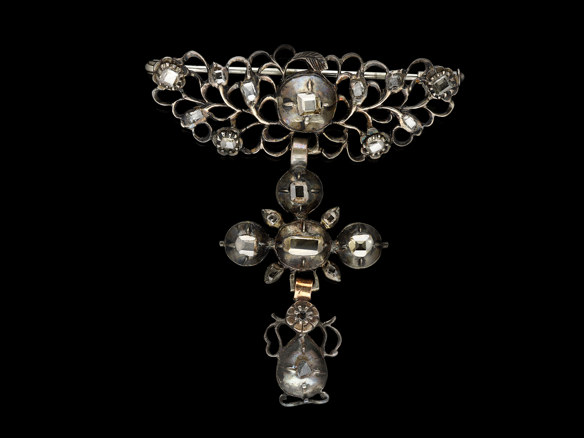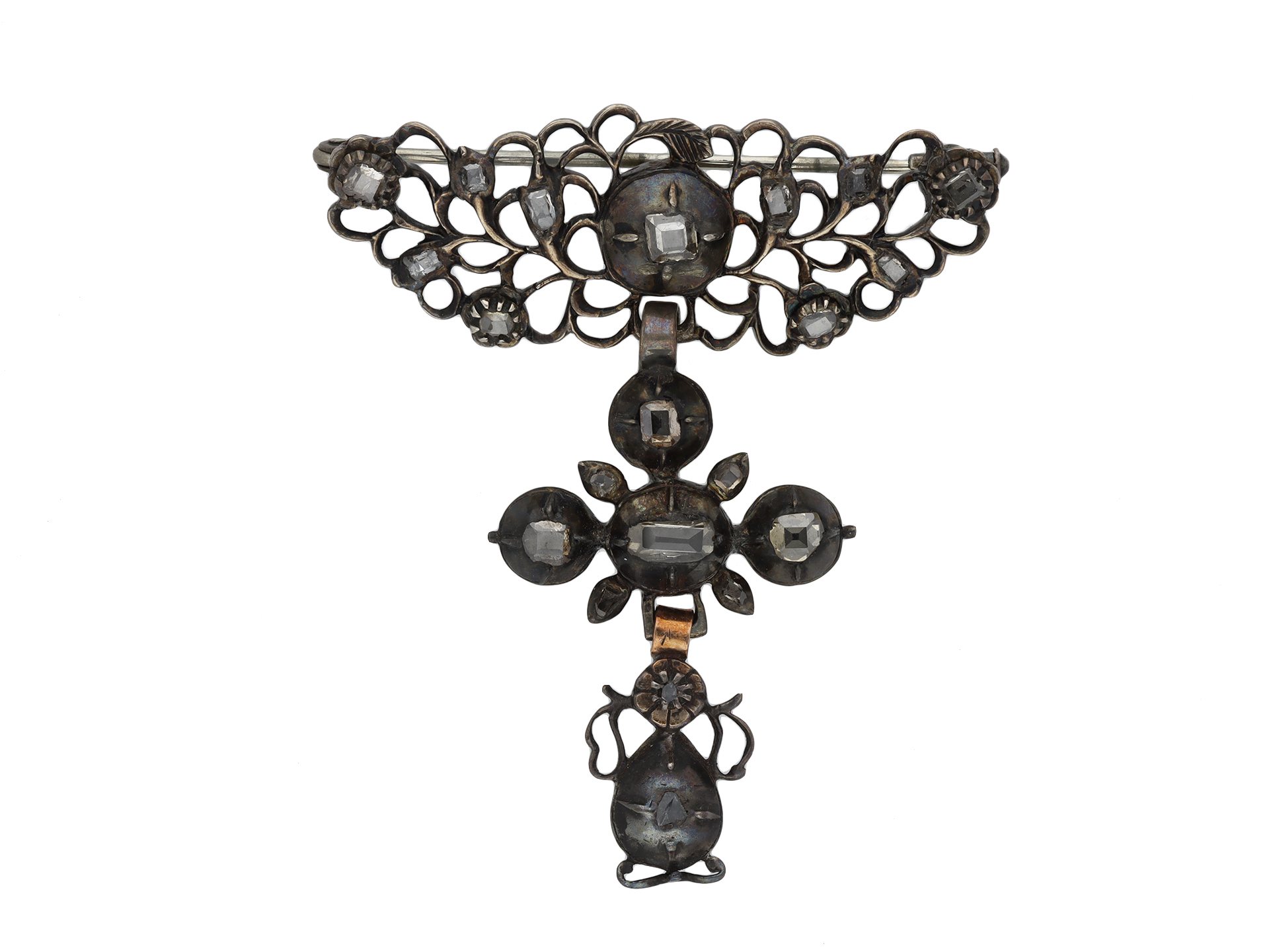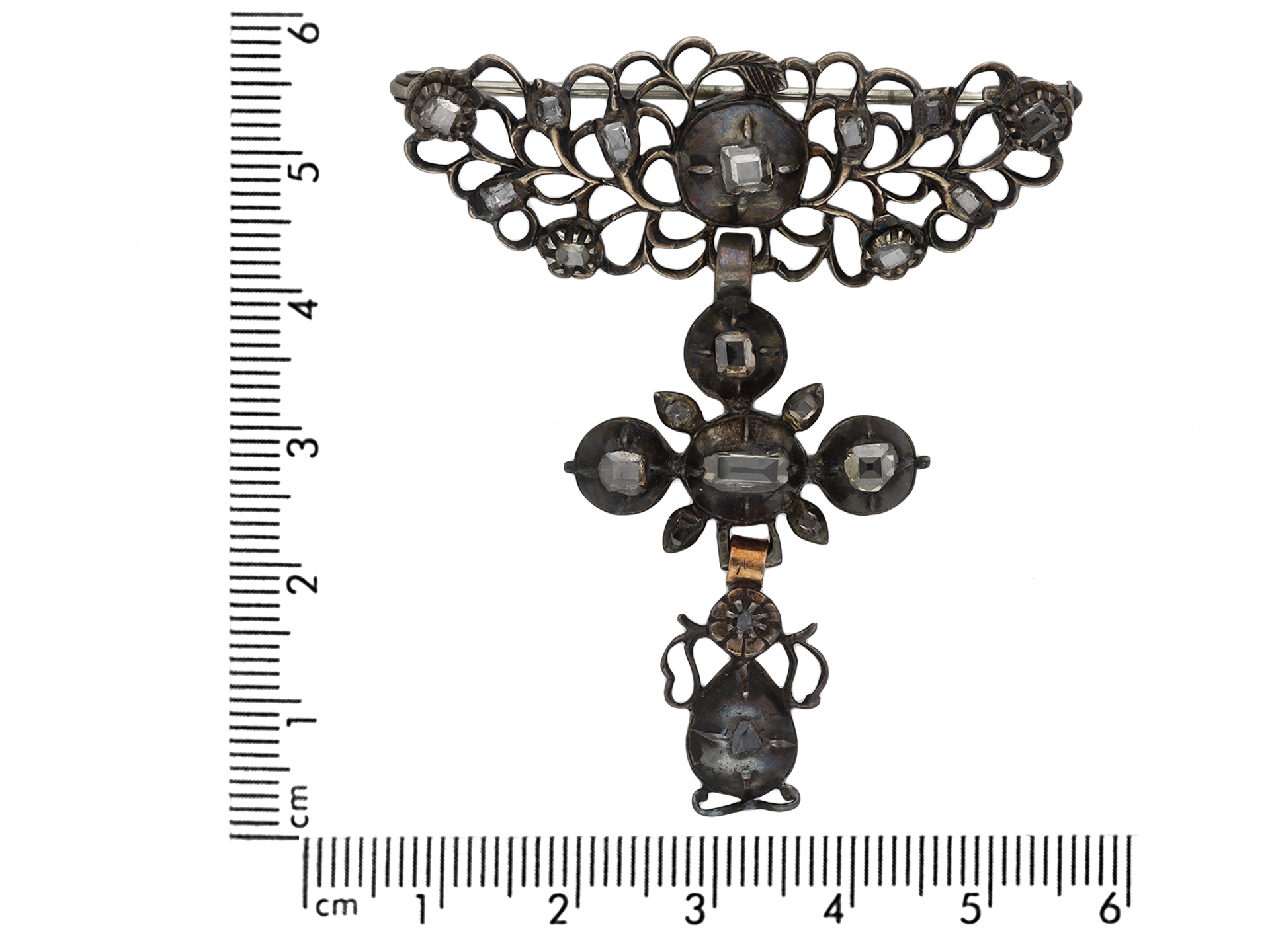 Georgian diamond brooch. Set with twenty one table cut diamonds in closed back cut down settings with an approximate combined weight of 0.80 carats, to an elegant brooch design featuring an open work upper section with foliate motifs, suspending a cross form with further foliate and petal detailing below, fitted to reverse with a secure pin. Tested silver, circa 18th century.