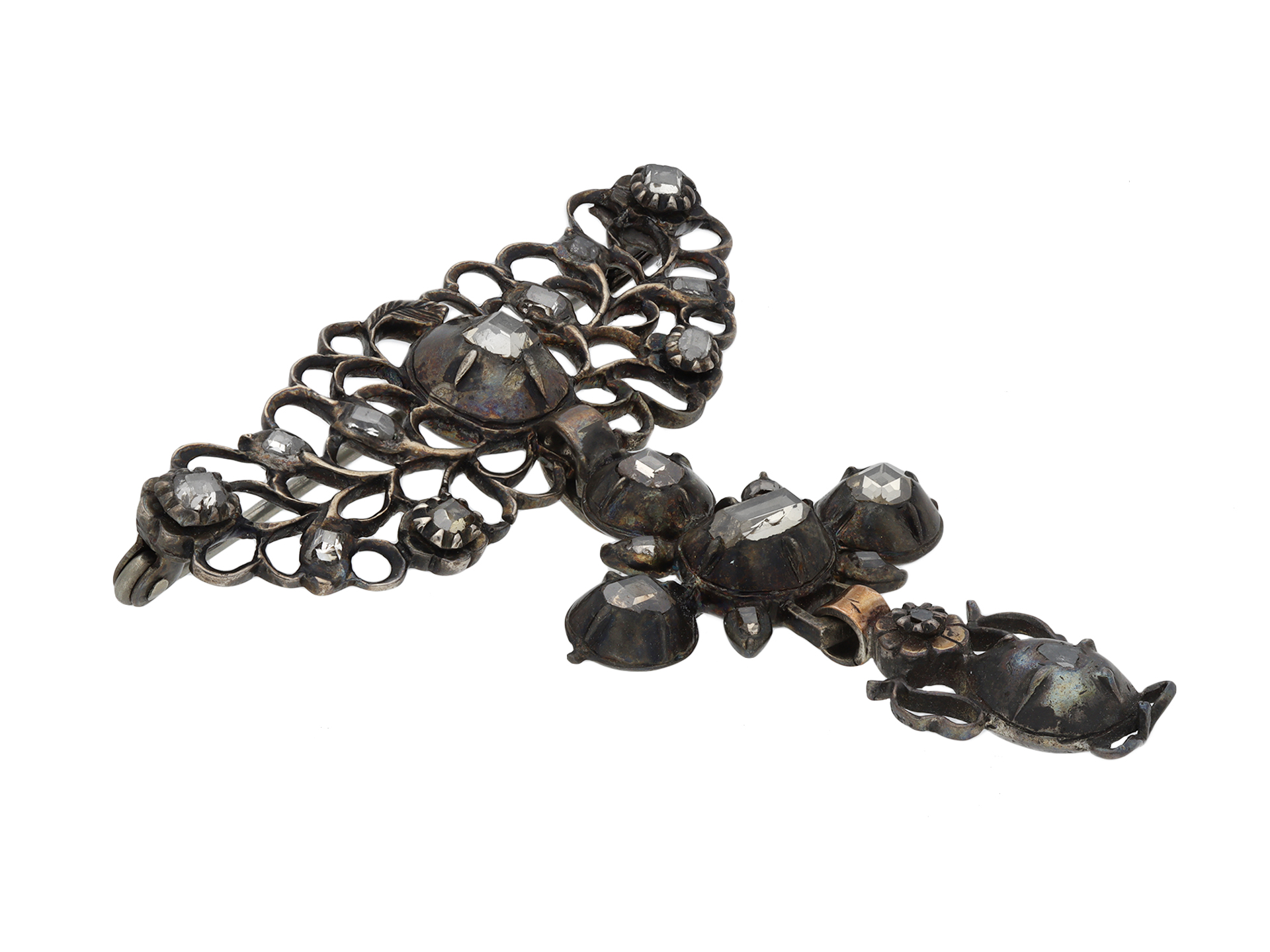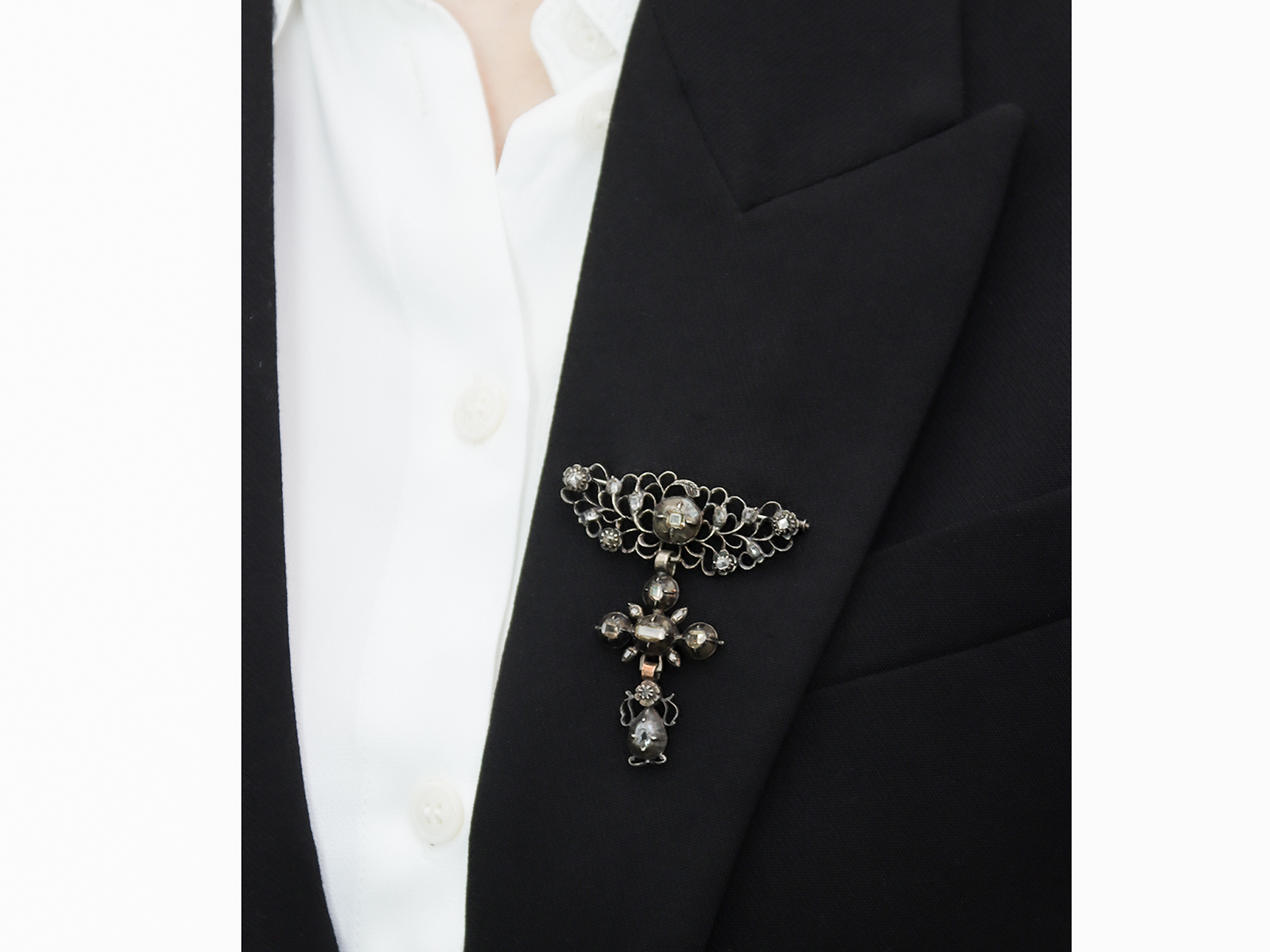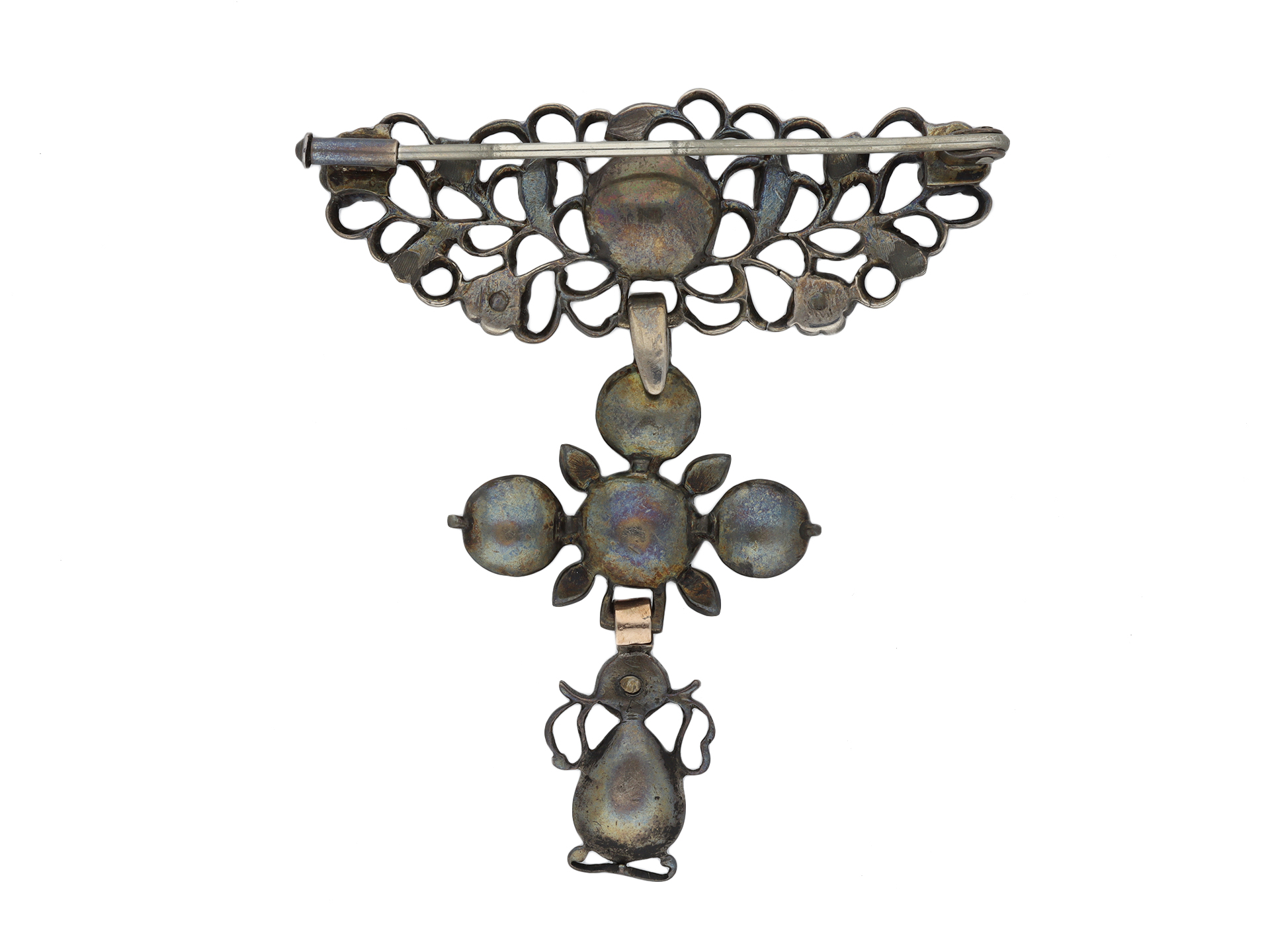 Georgian diamond brooch. Set with twenty one table cut diamonds in closed back cut down settings with an approximate combined weight of 0.80 carats, to an elegant brooch design featuring an open work upper section with foliate motifs, suspending a cross form with further foliate and petal detailing below, fitted to reverse with a secure pin. Tested silver, circa 18th century.