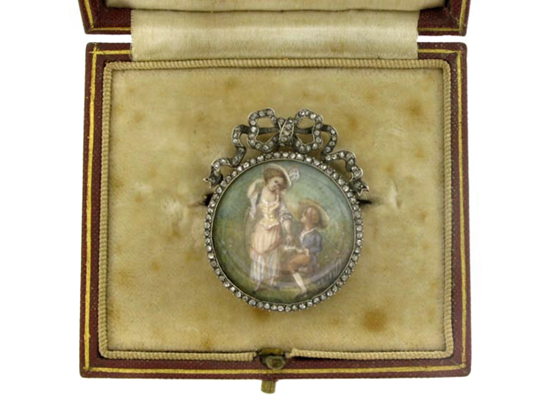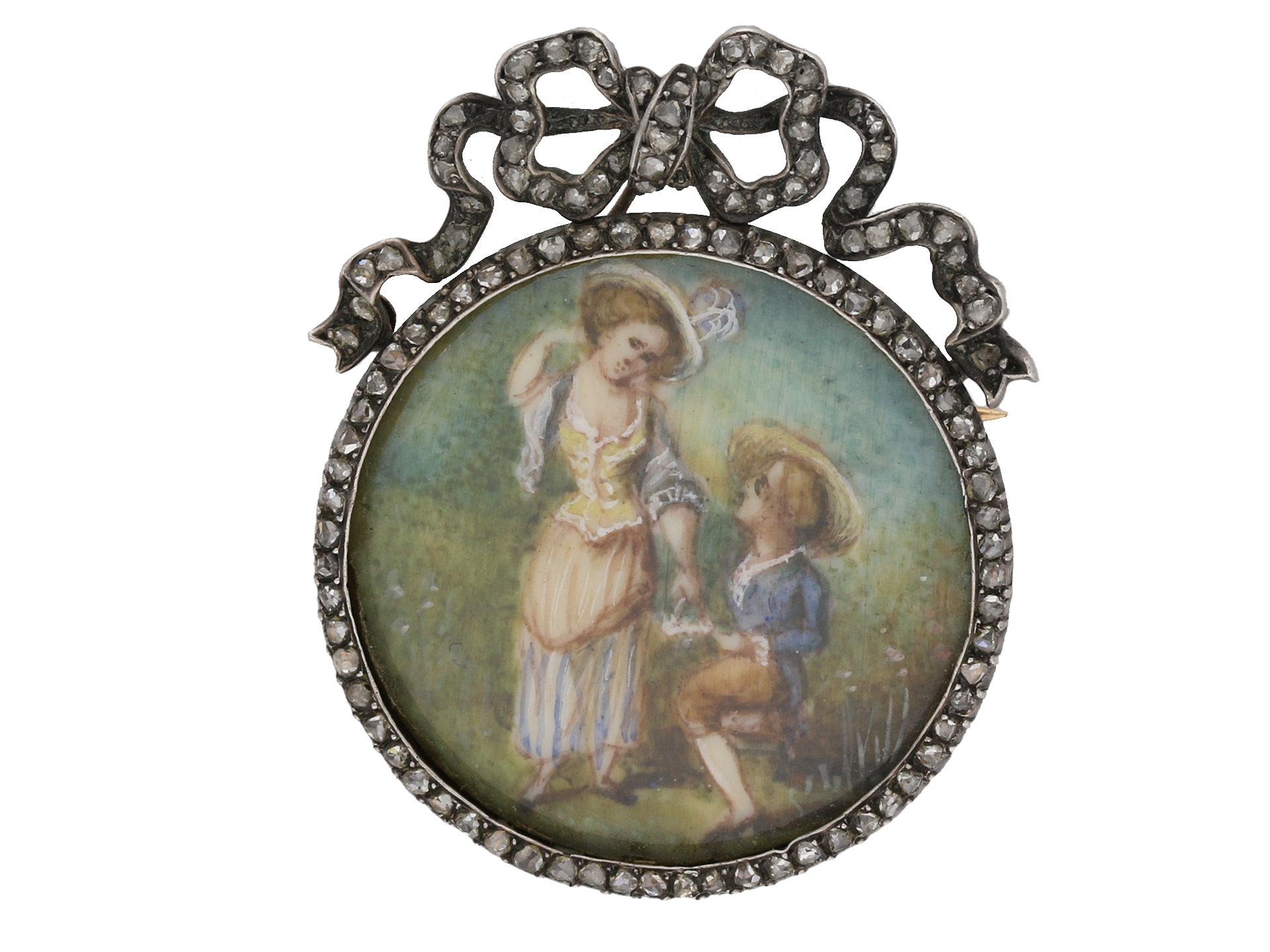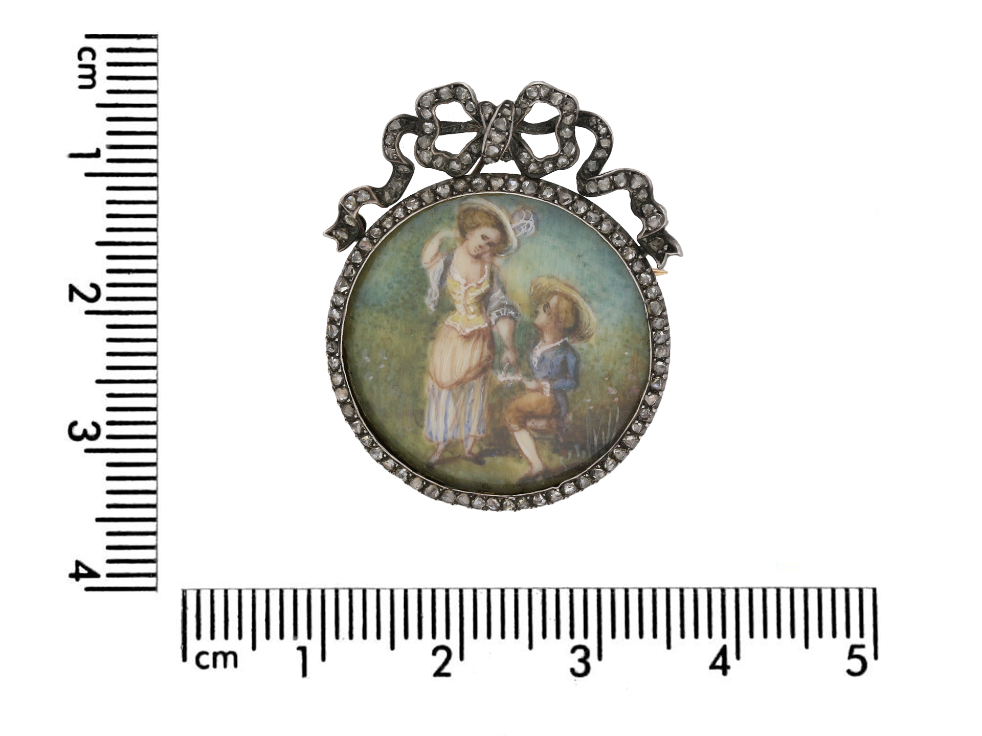 Georgian miniature and diamond brooch. Set with a fine picture of a young country girl with a boy in a closed back rubover setting, bordered by a single row of cushion shape rose cut diamonds in closed back grain settings, one hundred and eighteen in total, with an approximate combined weight of 1.00 carats, to an elegant decorative brooch featuring a ribbon style bow to top and fitted to reverse with a secure hinged pin and clasp, approximately 1.5" in diameter. Marked 18 carat rose gold and tested silver, maker's mark 'E M', French, circa 18th century.