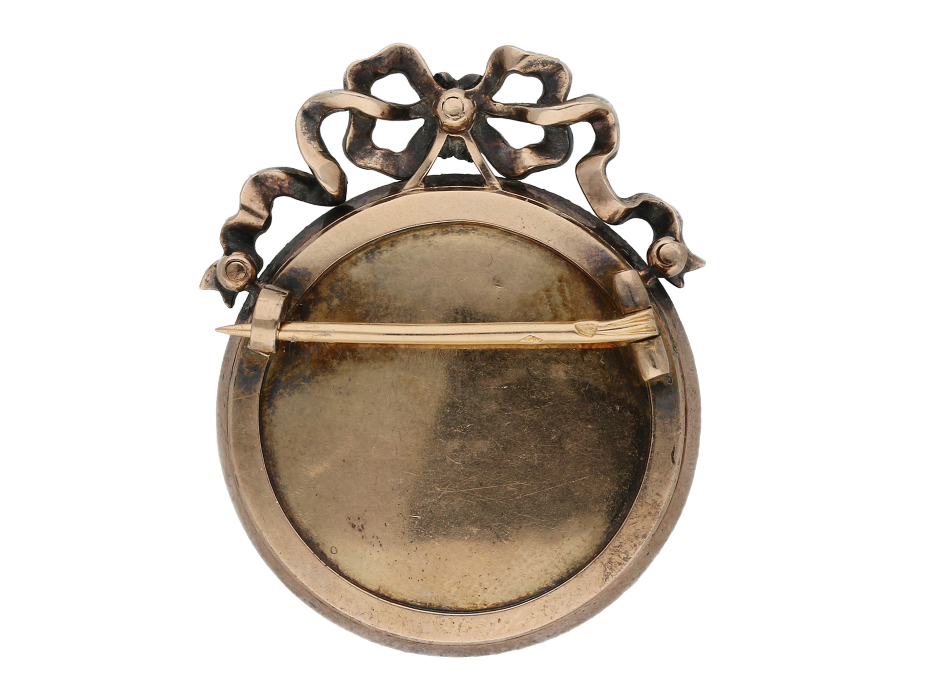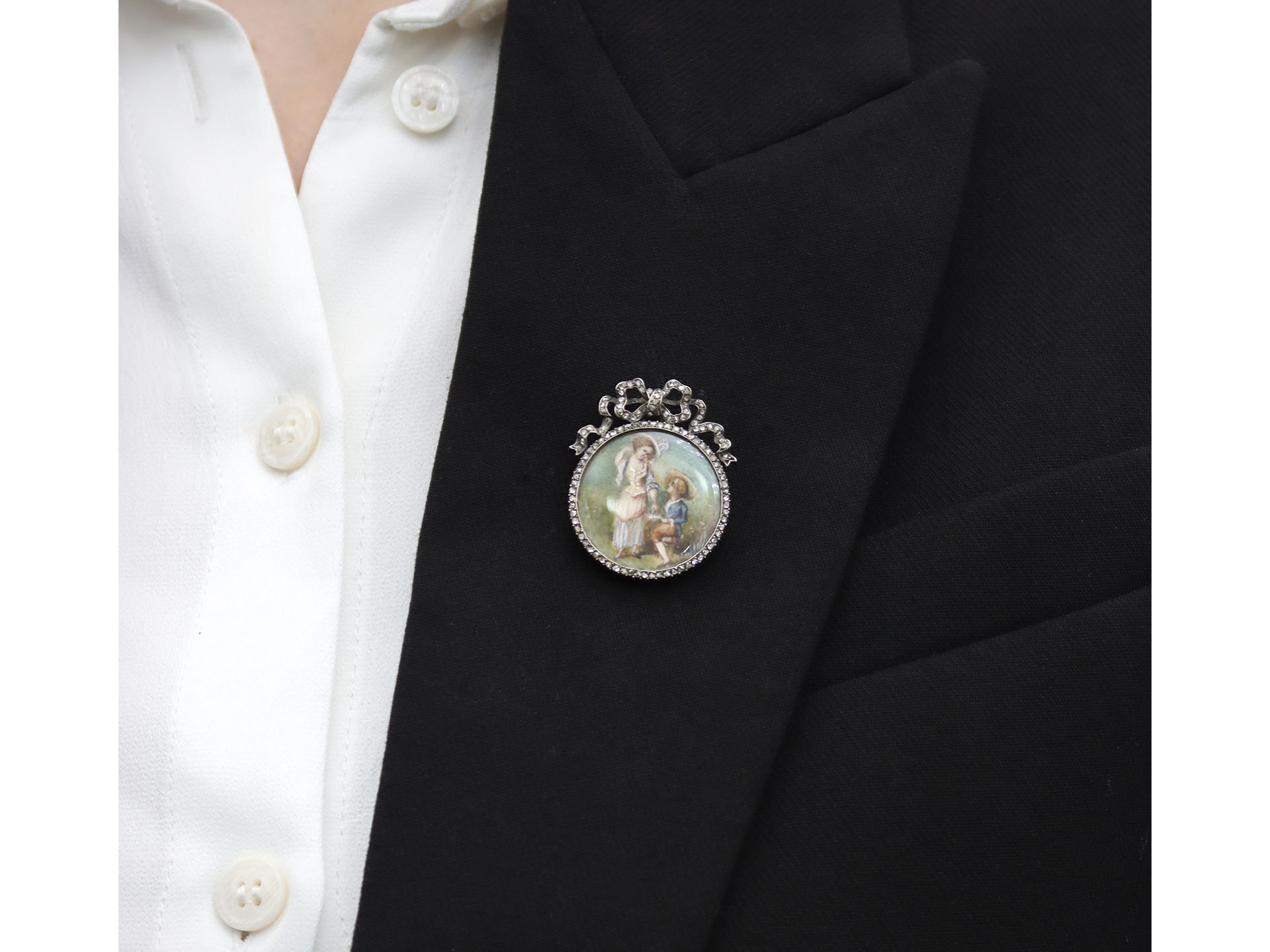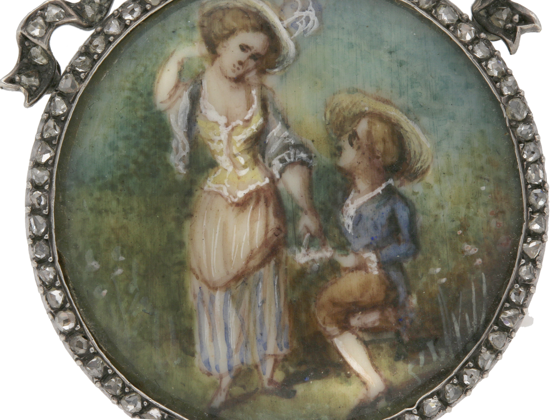 Georgian miniature and diamond brooch. Set with a fine picture of a young country girl with a boy in a closed back rubover setting, bordered by a single row of cushion shape rose cut diamonds in closed back grain settings, one hundred and eighteen in total, with an approximate combined weight of 1.00 carats, to an elegant decorative brooch featuring a ribbon style bow to top and fitted to reverse with a secure hinged pin and clasp, approximately 1.5" in diameter. Marked 18 carat rose gold and tested silver, maker's mark 'E M', French, circa 18th century.