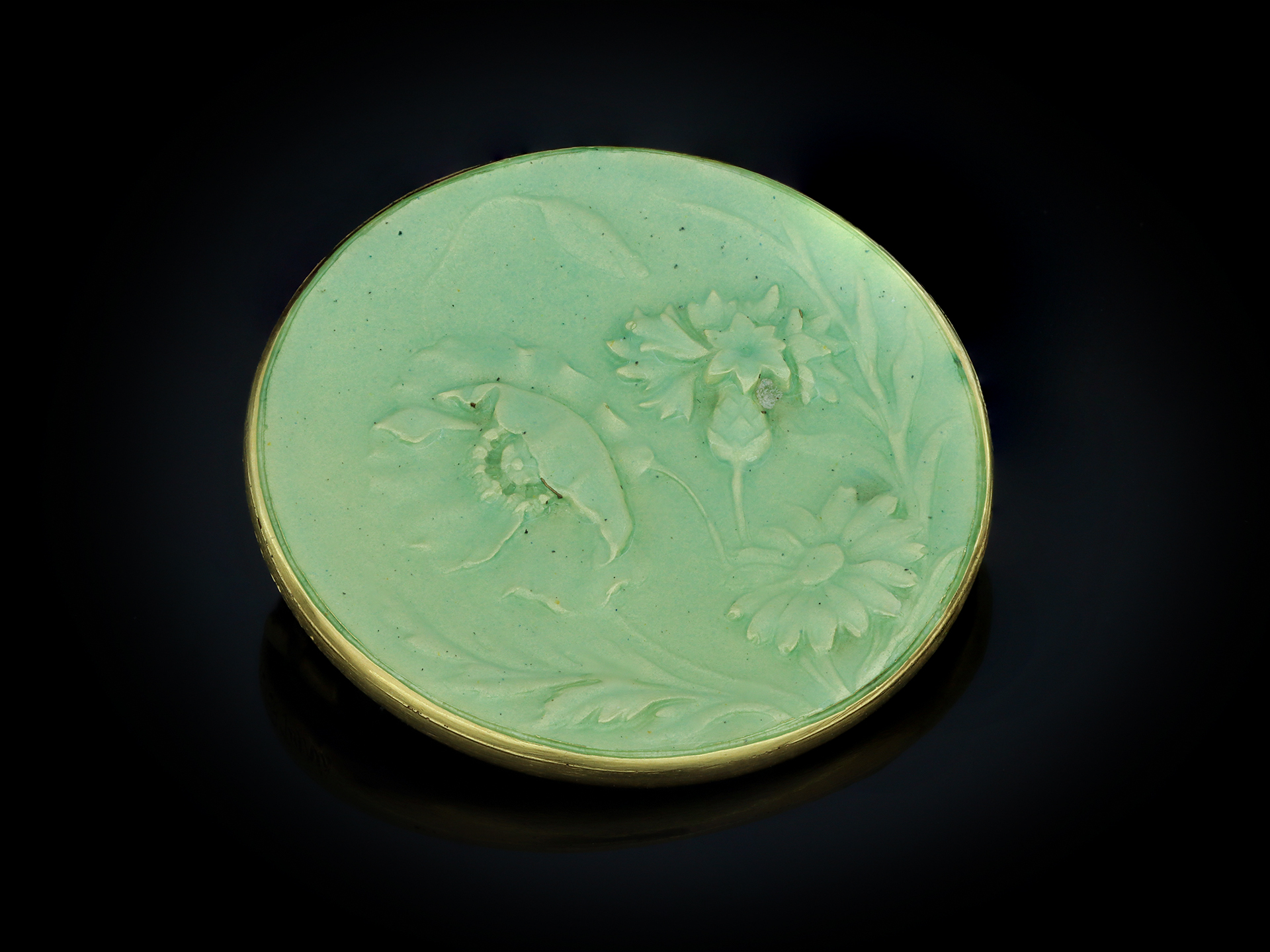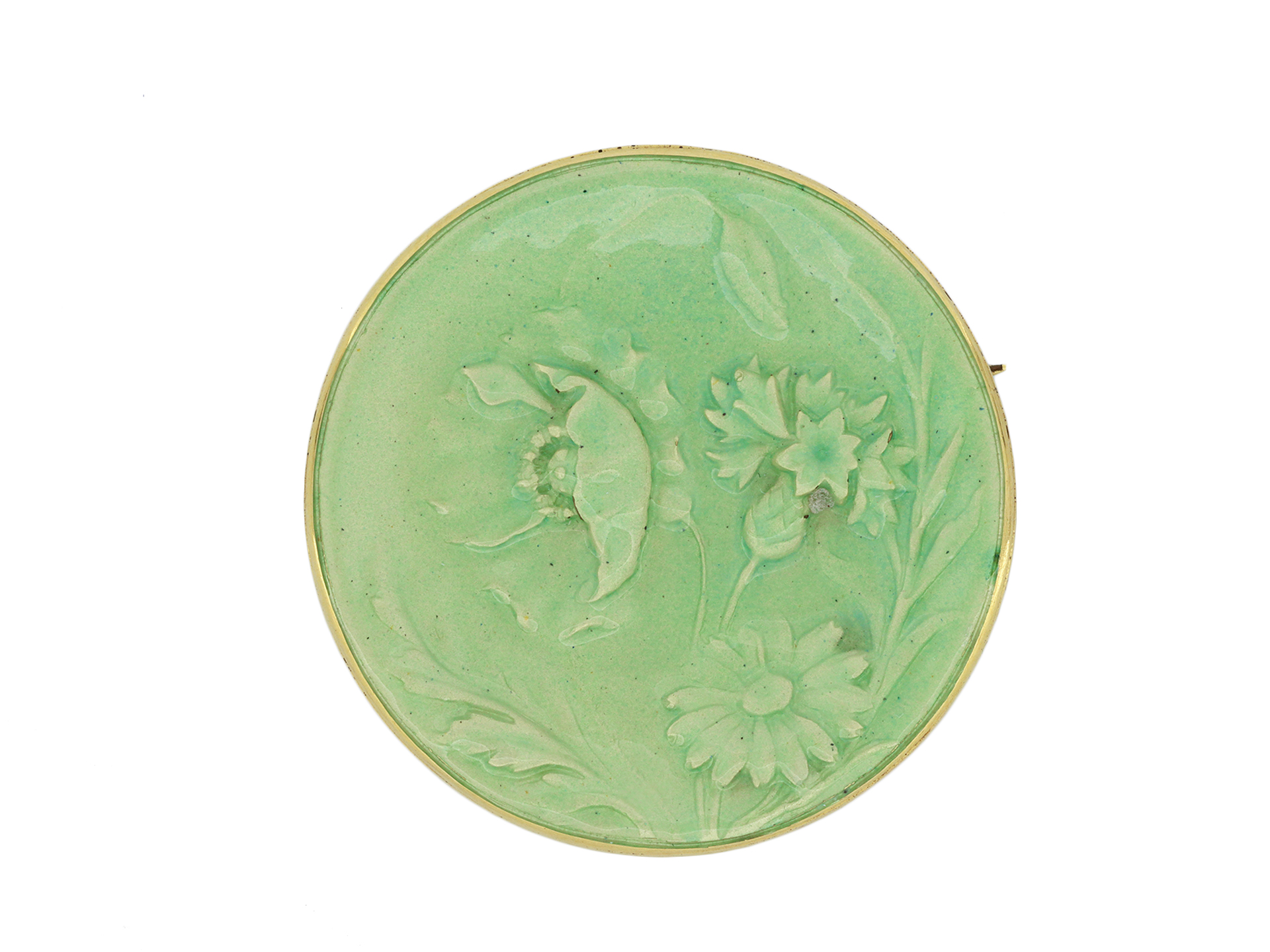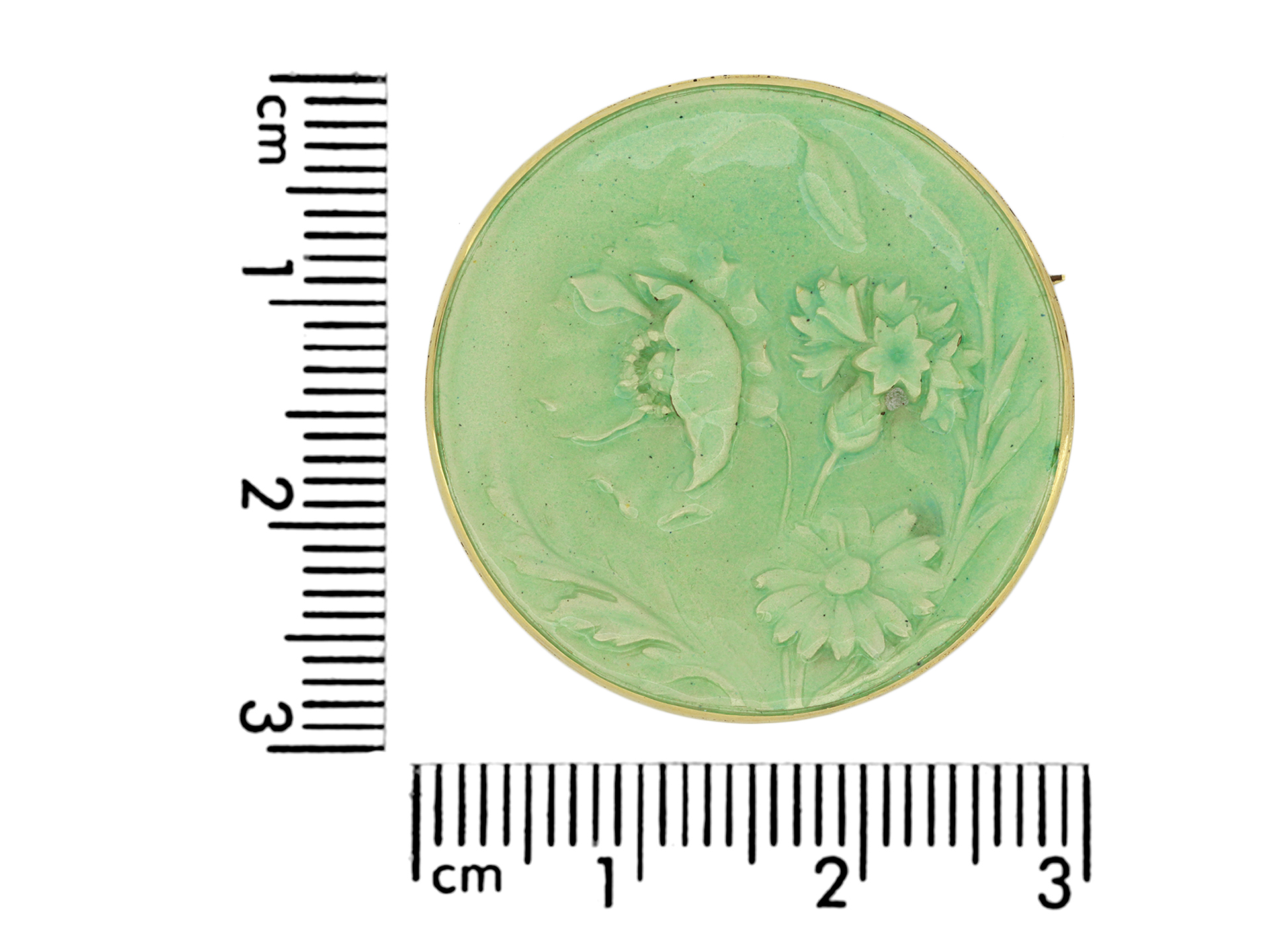 Enamel and gold brooch by Maison Vever Paris. A brooch in the form of a circular shallow concave disk decorated in relief with a poppy, a daisy and a cornflower surrounded by foliage all in pale green enamel, the reverse mounted with a secure hinged pin and scroll clasp. Marked 18 carat yellow gold, signed ‘VEVER Paris’, French, circa 1900.
