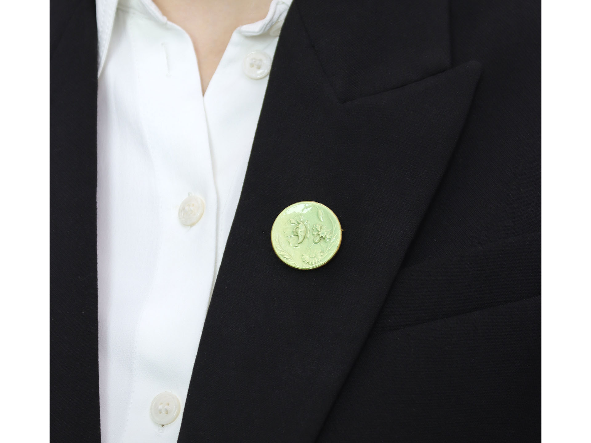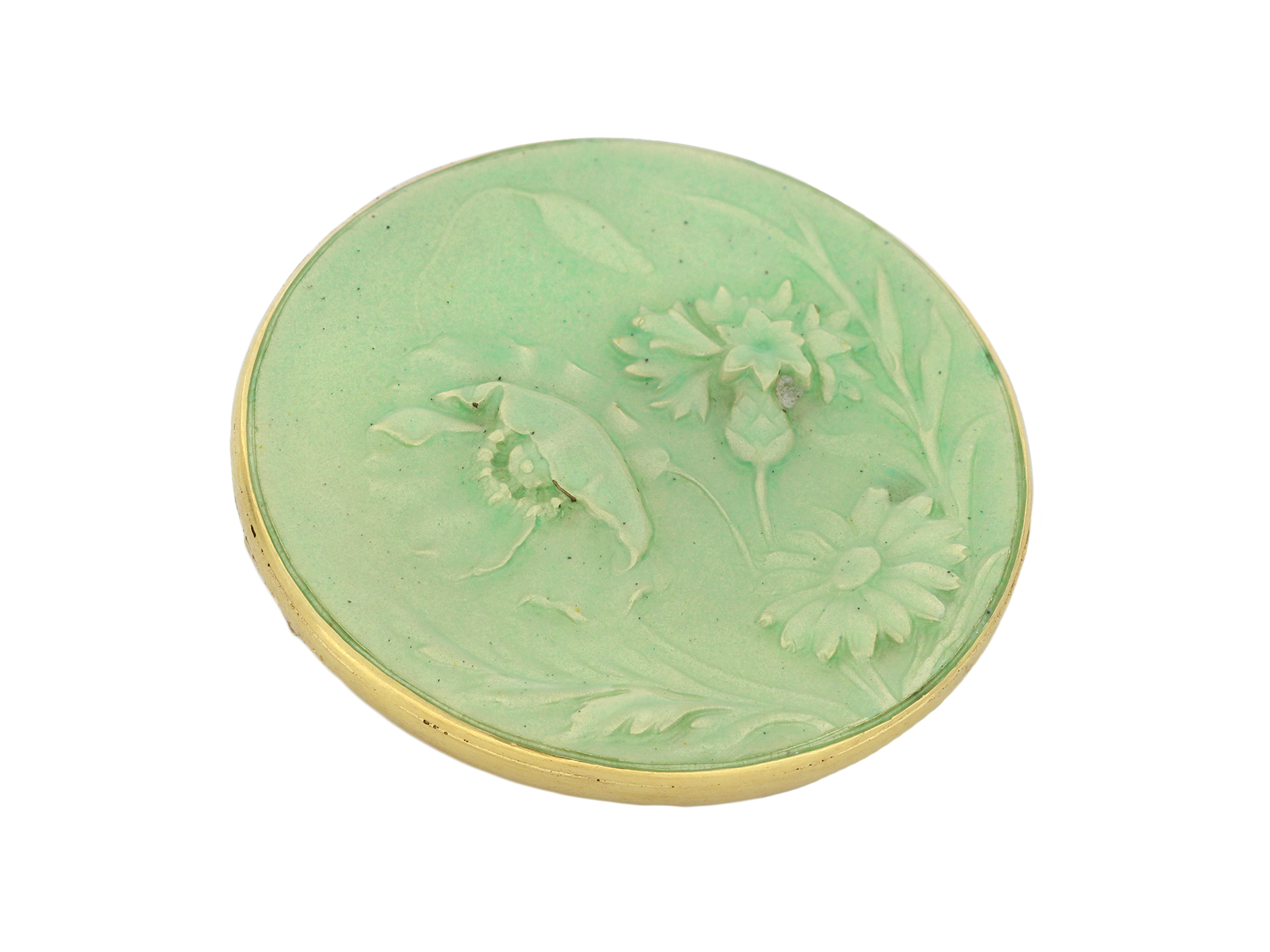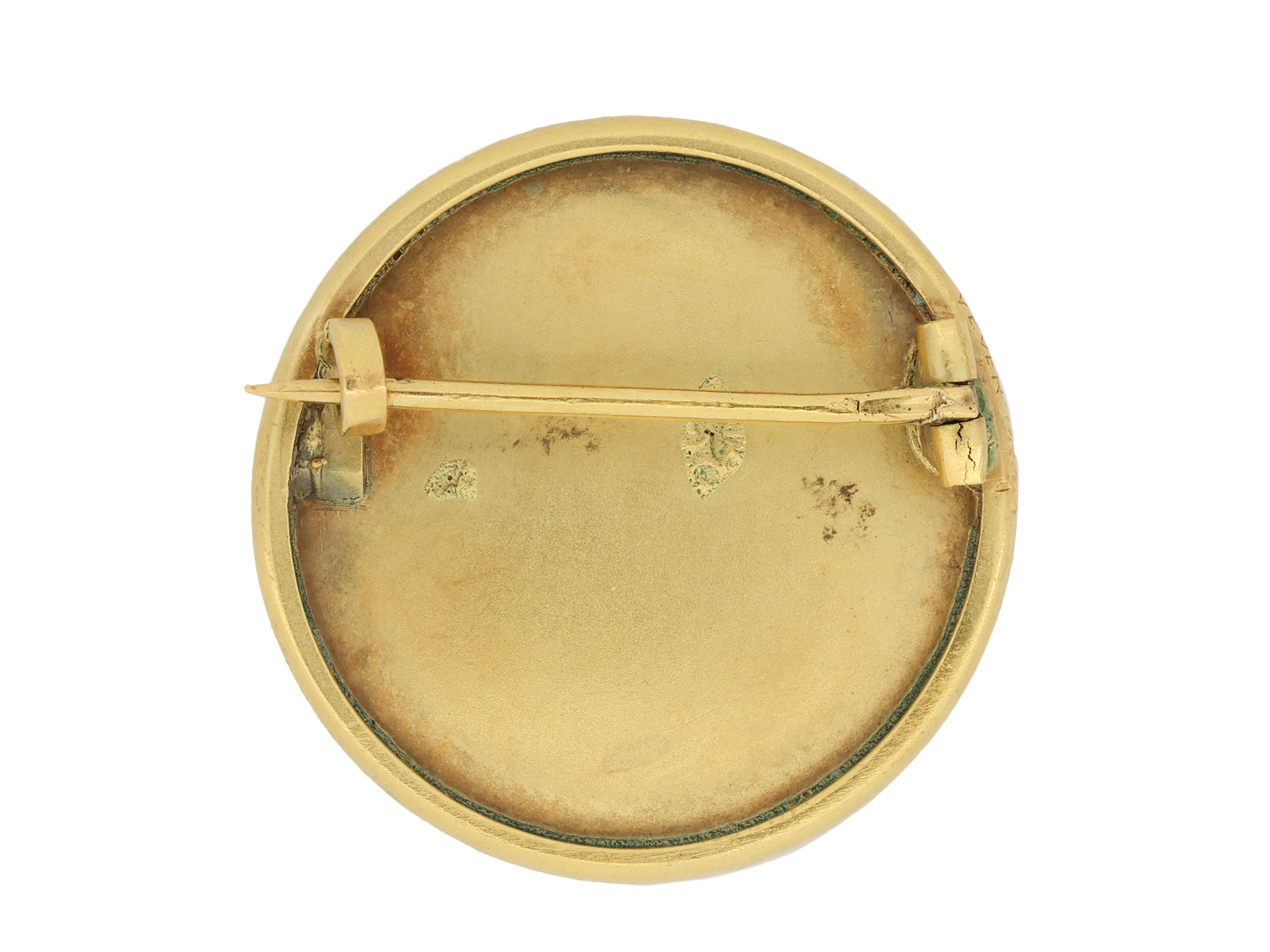 Enamel and gold brooch by Maison Vever Paris. A brooch in the form of a circular shallow concave disk decorated in relief with a poppy, a daisy and a cornflower surrounded by foliage all in pale green enamel, the reverse mounted with a secure hinged pin and scroll clasp. Marked 18 carat yellow gold, signed ‘VEVER Paris’, French, circa 1900.