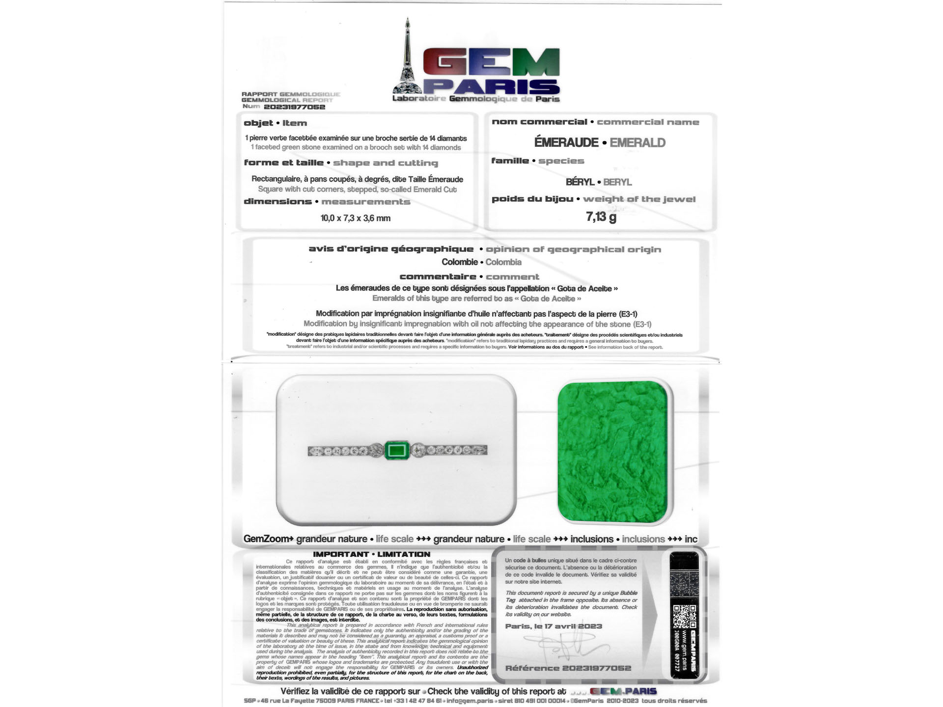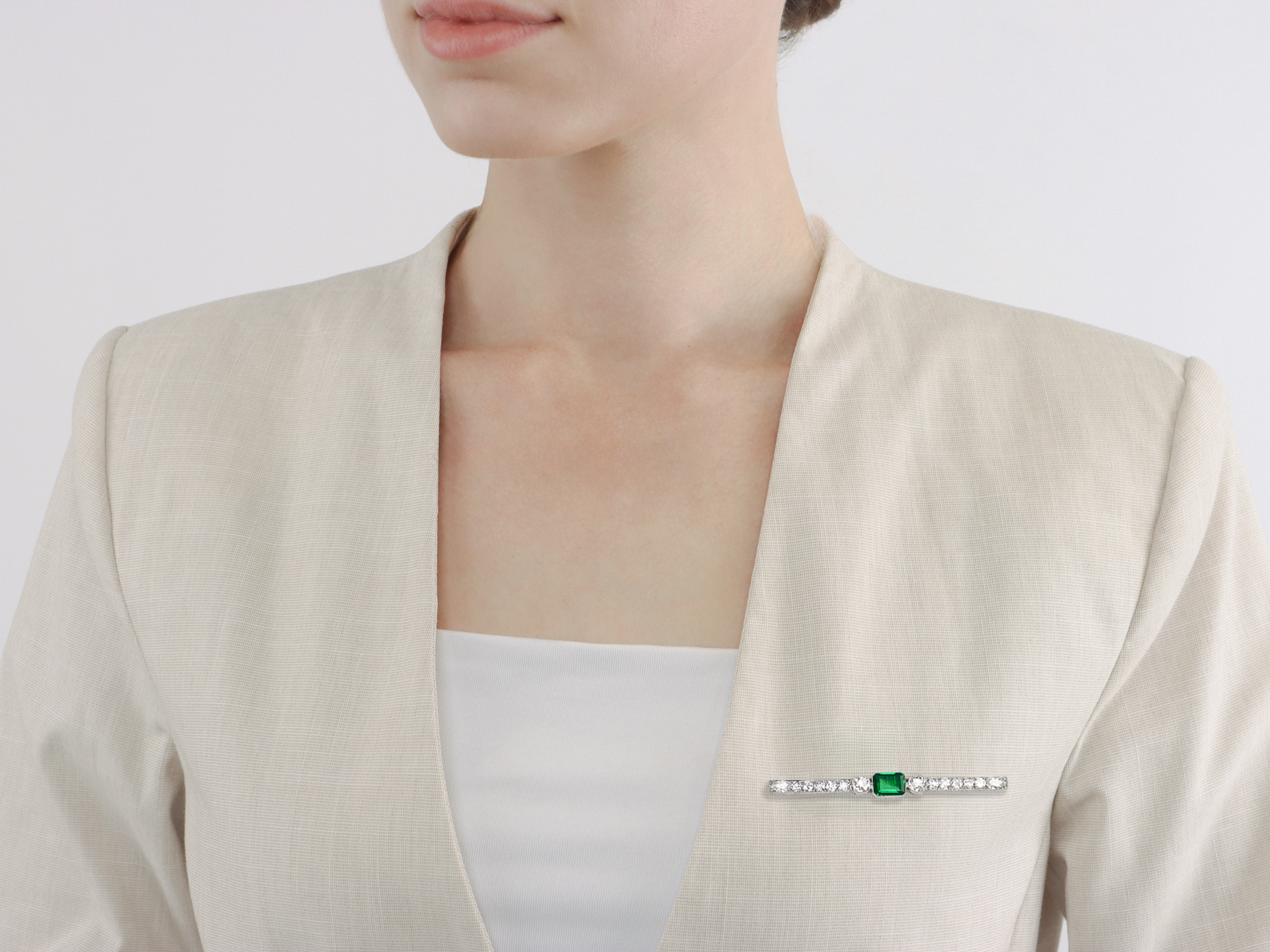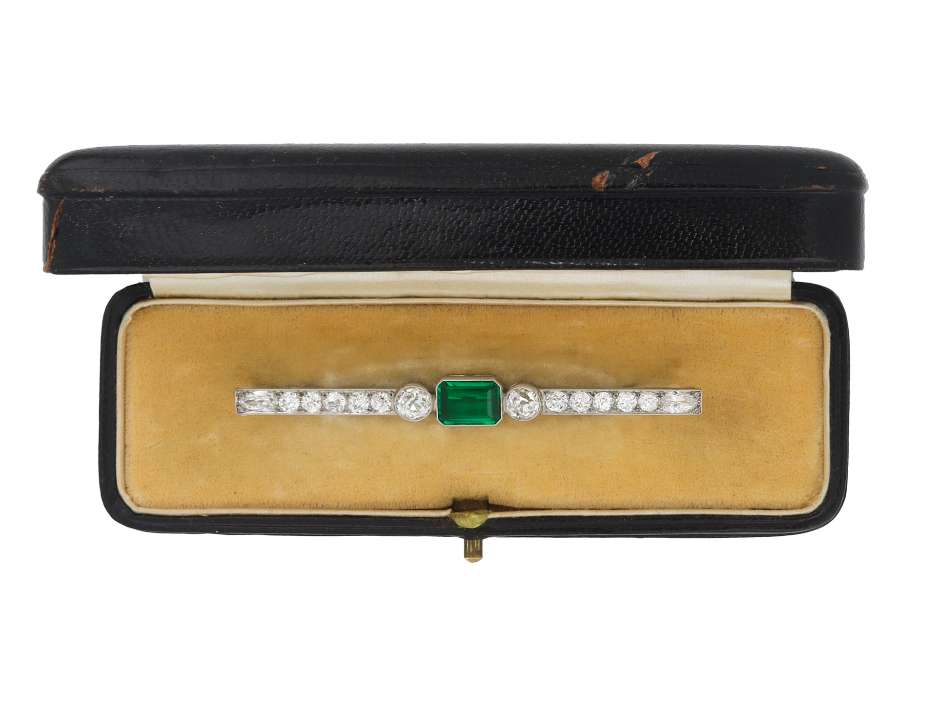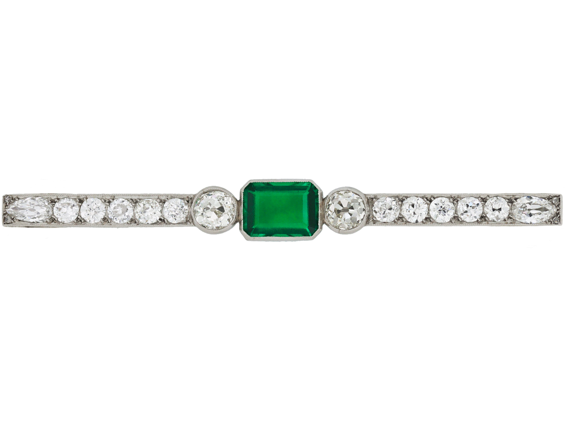 Colombian emerald and diamond bar brooch. Set to centre with an octagonal-emerald cut natural Colombian emerald with insignificant oil and rare 'gota de aceite' effect, in an open back rubover setting with an approximate weight of 1.90 carats, flanked by two cushion shape old mine diamonds in open back rubover settings with a combined approximate weight of 1.65 carats, and further set with ten round old cut diamonds in open back grain settings with a combined weight of 1.75 carats, terminating in two drop shape old cut diamonds in open back grain settings with a combined weight of 0.50 carats and four round rose cut diamonds in open back grain settings with a combined weight of 0.04 carats. The total approximate diamond weight is 3.94 carats, to an exceptional bar brooch featuring millegrain edging, a pierced linear gallery and fancy shape open backholing, fitted to reverse with a secure pin and barrel safety clasp, approximately 7.3cm in length. Marked platinum, clasp tested white gold, French import mark, circa 1920, accompanied by Laboratoire Gemmologique de Paris report #20231977052 and fitted box.