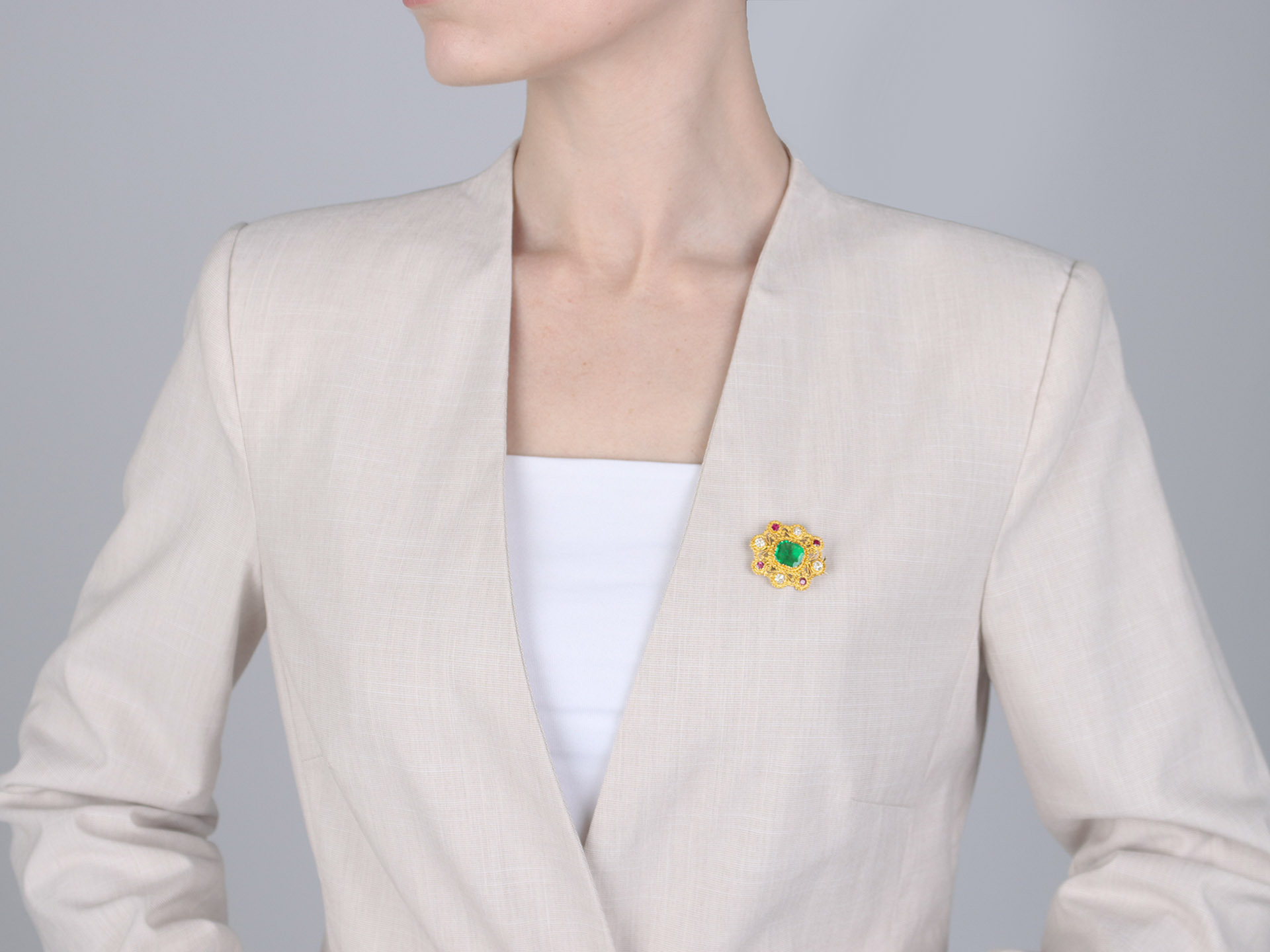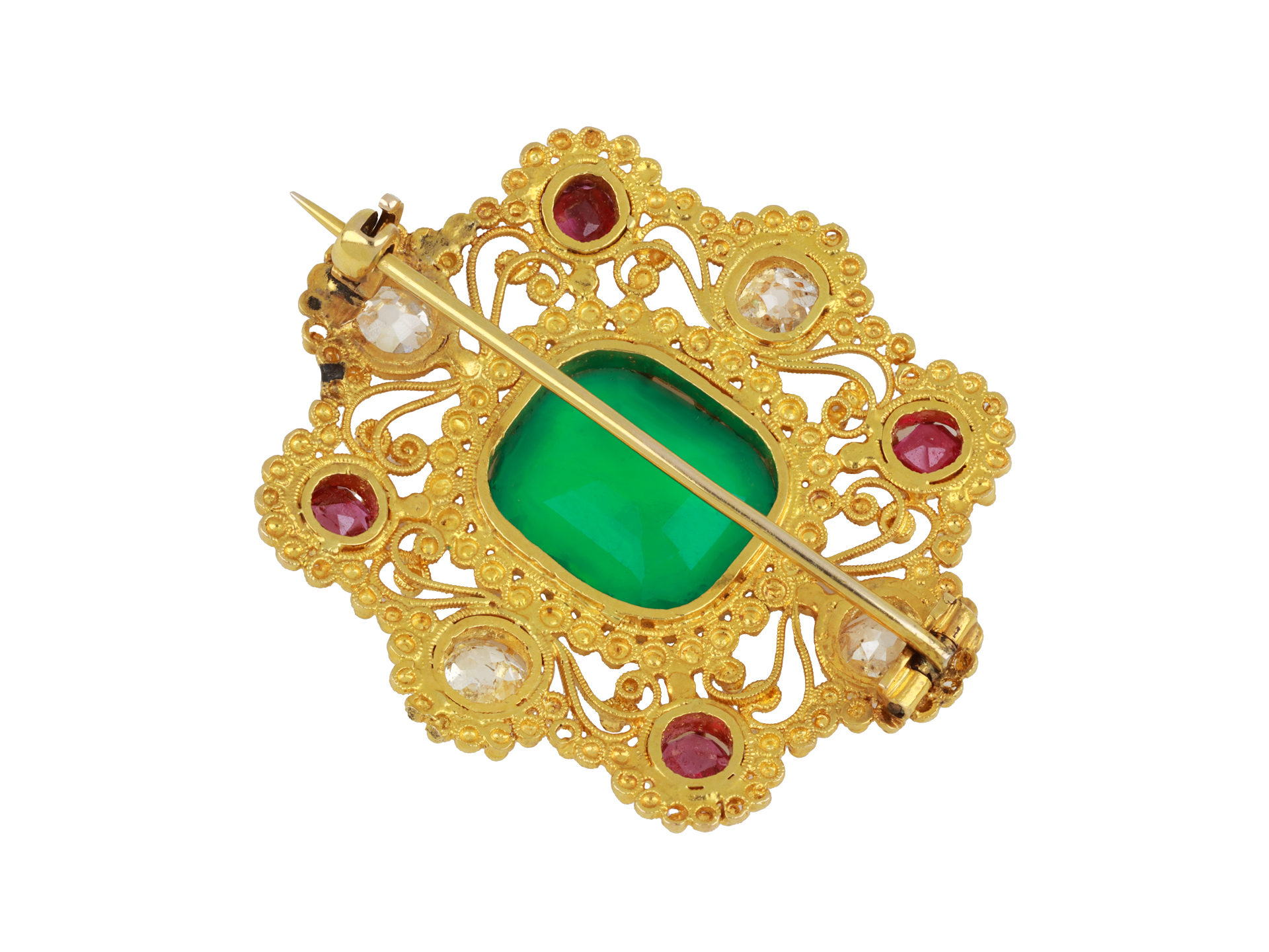 Colombian emerald, diamond and ruby cannetille brooch, circa 1830.