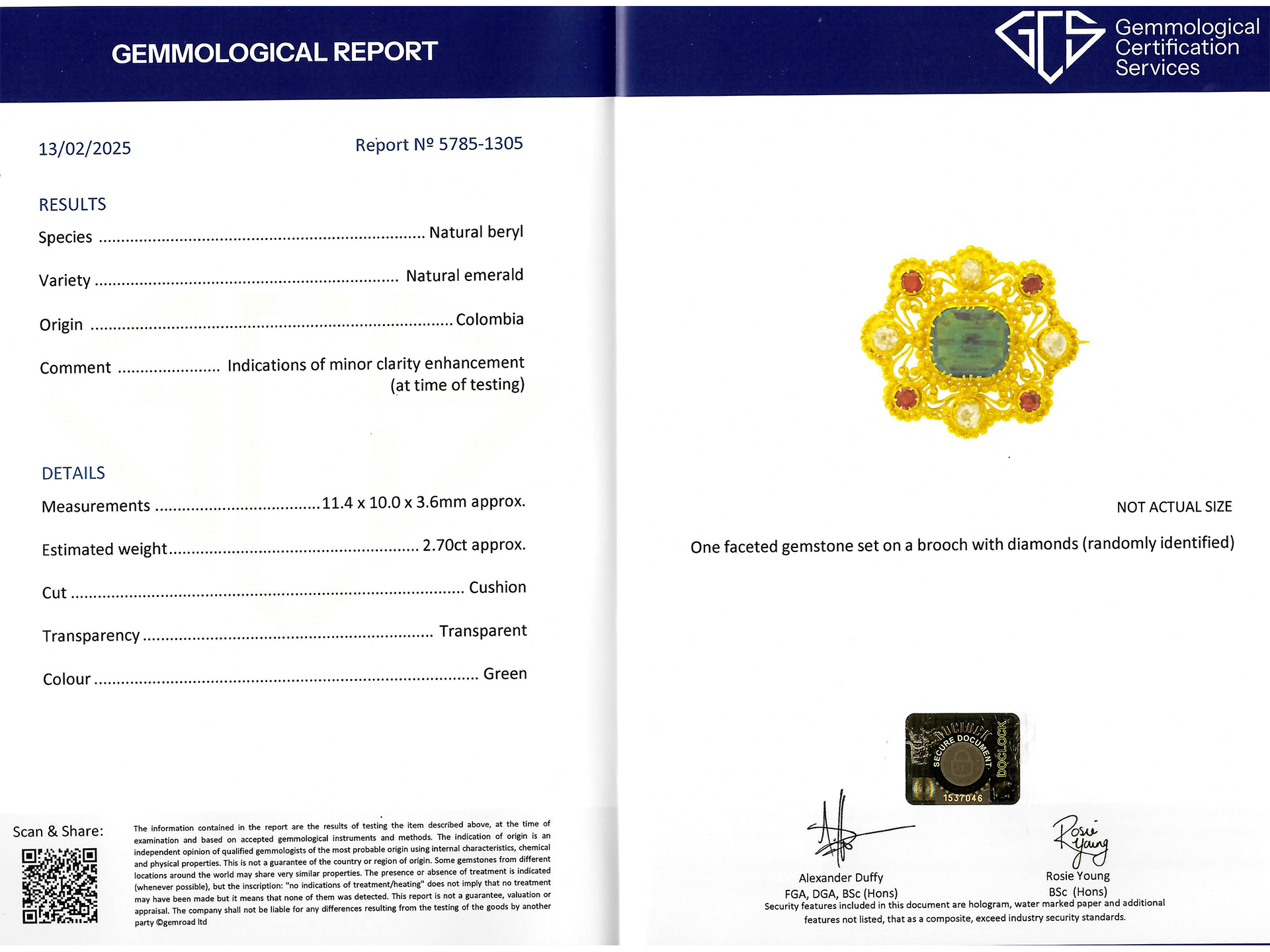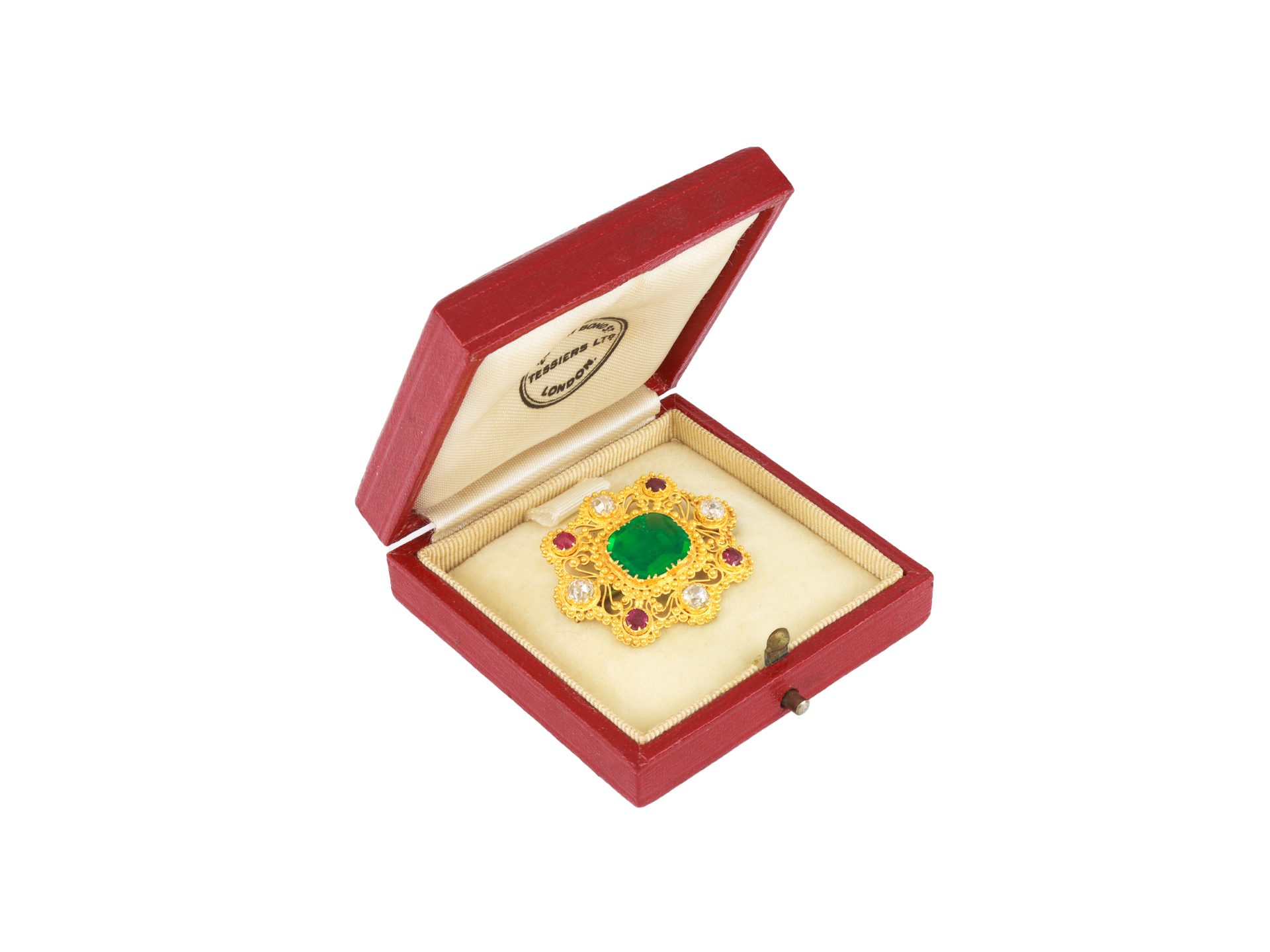 Colombian emerald, diamond and ruby cannetille brooch. Set to centre with a cushion shape old cut natural Colombian emerald with minor oil with a weight of 2.70 carats in an open back claw setting, encircled by four cushion shape old mine diamonds in open back claw settings with a combined approximate weight of 1.00 carats and four cushion shape old cut natural rubies in open back claw settings with an approximate combined weight of 0.40 carats, to an impressive cannetille design with intricate openwork and granulation throughout, fancy open backholing and fitted to reverse with a secure pin and C-clasp, approximately 3.2cm in length. Tested yellow gold, circa 1830, accompanied by Tessiers Ltd fitted case and Gemmological Certification Services report #5785-1305.