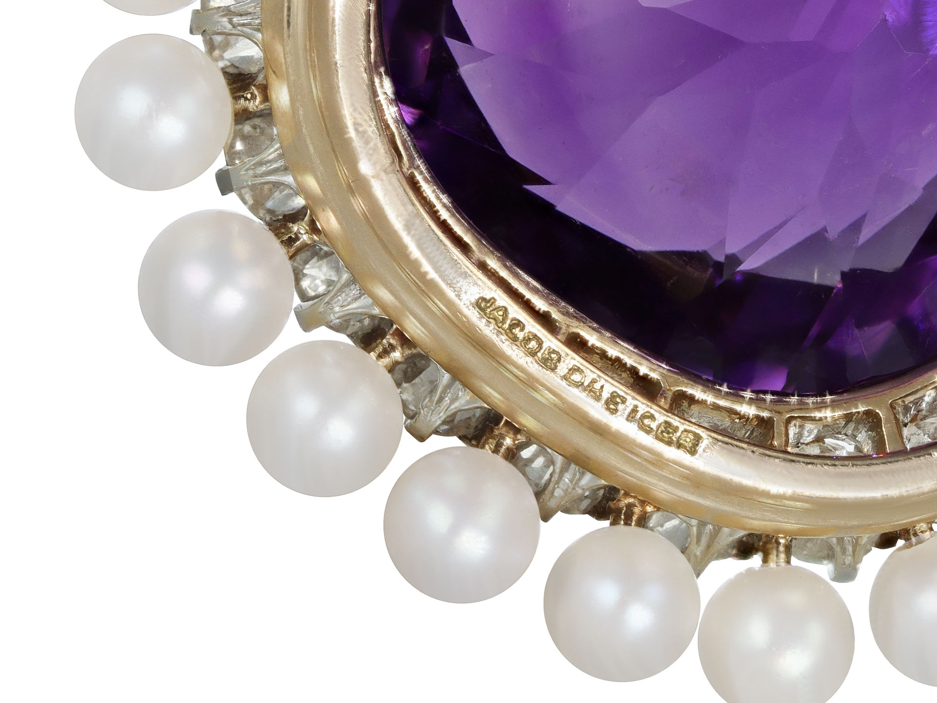 Dreicer & Co. amethyst, pearl and diamond pendant/brooch. Set to centre with a cushion shape old cut natural amethyst in an open back claw setting with an approximate weight of 44.00 carats, encircled by twenty four cushion shape old mine diamonds in open back claw settings with a combined approximate weight of 3.50 carats and further decorated with twenty four pearls in closed back part drilled settings, all to an impressive cluster brooch featuring curving claws, and fancy open backholing, fitted to reverse with a secure hinge pin and C-clasp, and hinged bail, and accompanied by removable chain, pendant/brooch approximately 4cm in length, chain approximately 26.7" in length. Pendant/brooch tested gold and platinum, chain marked 9 carat rose gold, signed 'Jacob Dreicer' for Dreicer & Co., American, circa 1900.