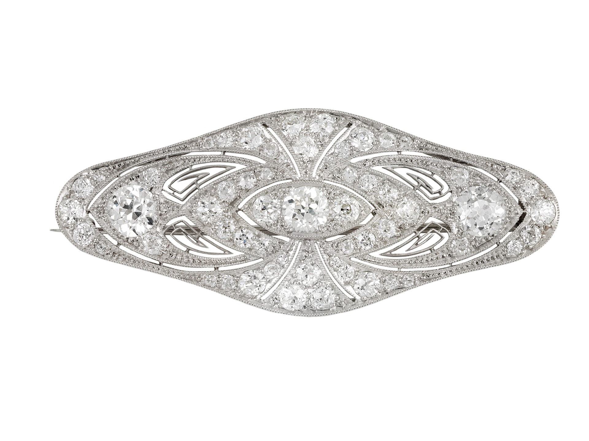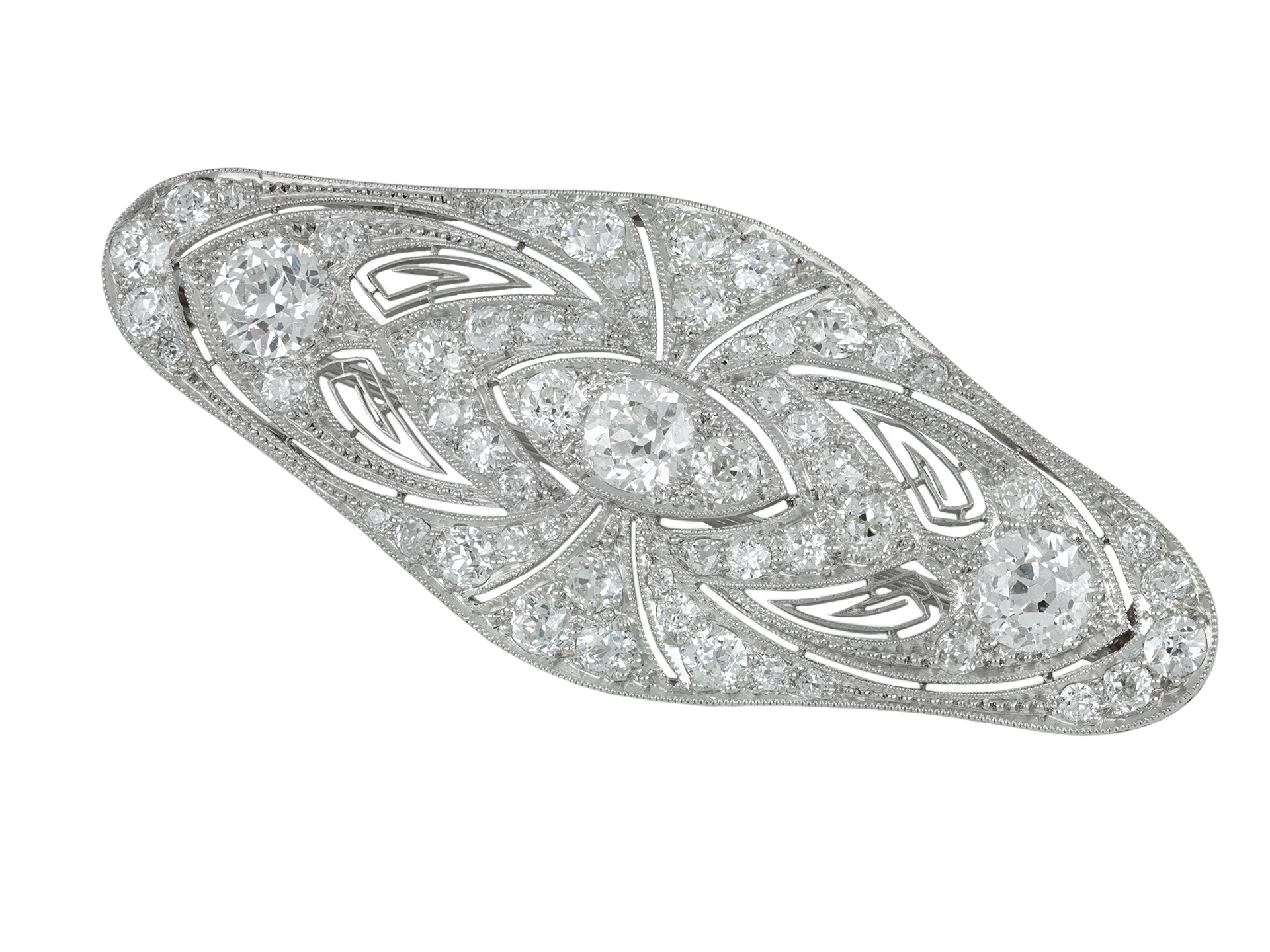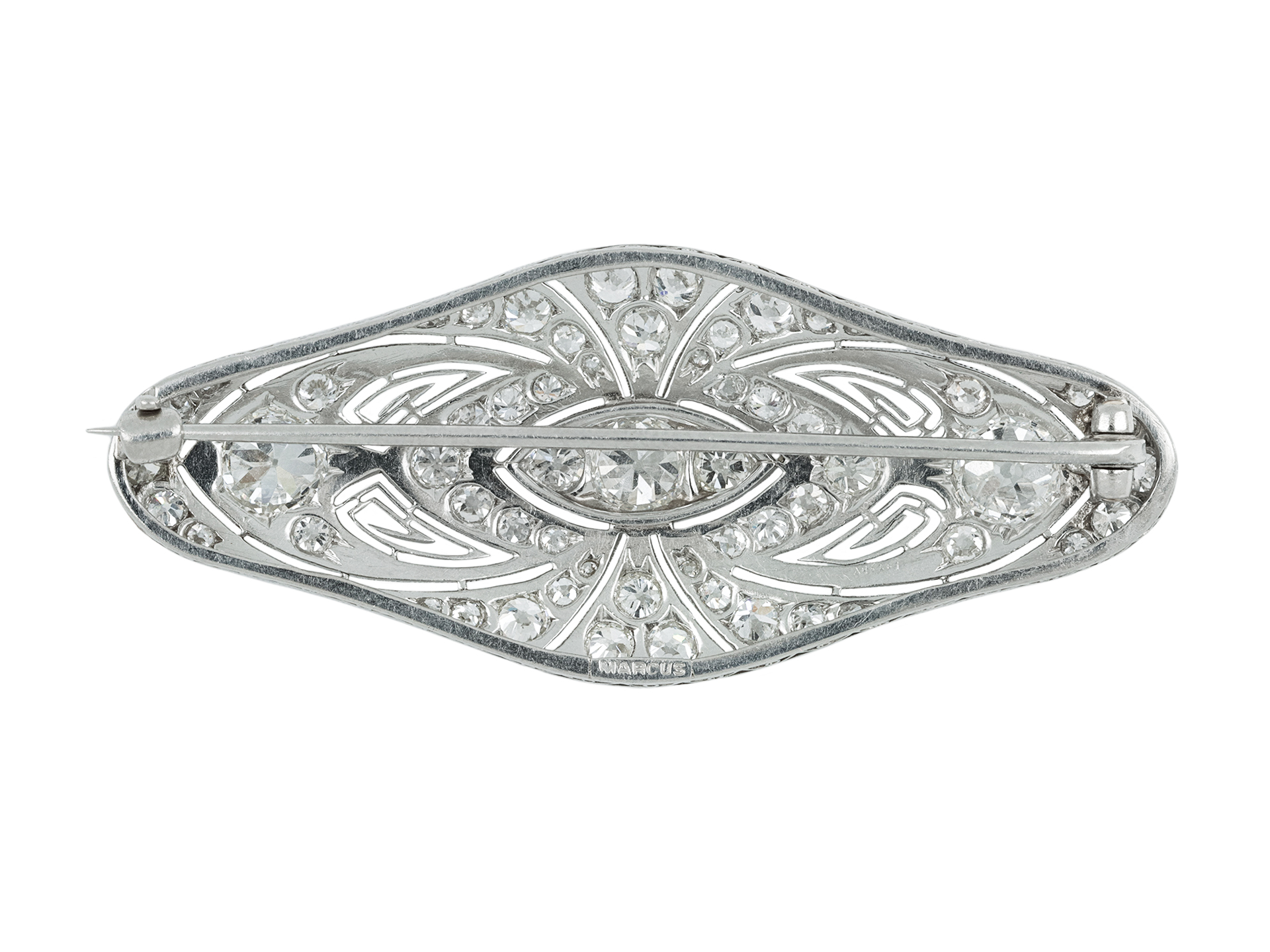 Marcus and Co. diamond brooch. Set to centre with one round old cut diamond in an open back grain setting with an approximate weight of 0.40 carats, further adorned by sixty round mixed old cut diamonds in open back grain settings with a combined weight of 2.45 carats. The total approximate diamond weight is 2.85 carats, to an elegant brooch featuring intricate filigree work with millegrain edging throughout, a decorative gallery with scalloped and chenier detailing, and fancy open shape backholing, fitted to reverse with a secure pin and safety catch, approximately 6cm in length. Tested platinum and iridium, signed 'MARCUS' for Marcus & Co., American, circa 1915, accompanied by original Marcus and Co. box.