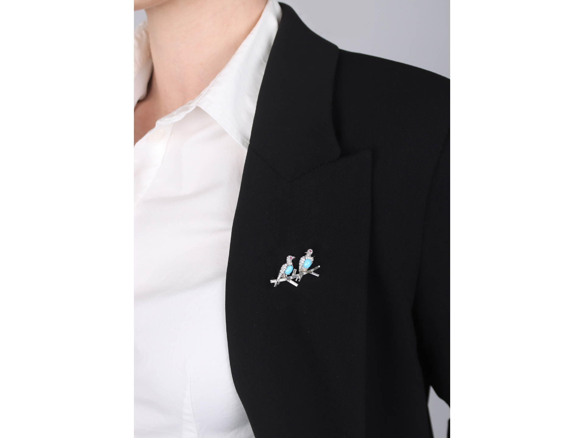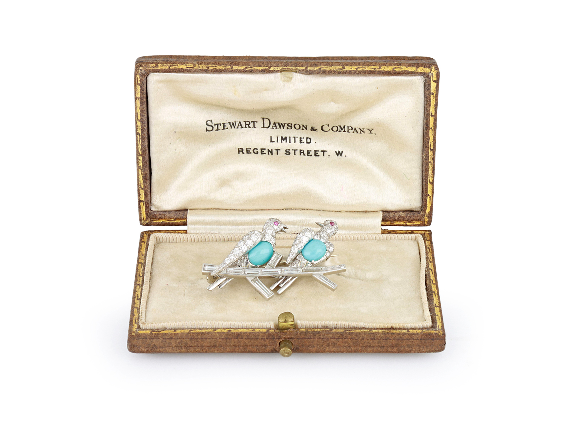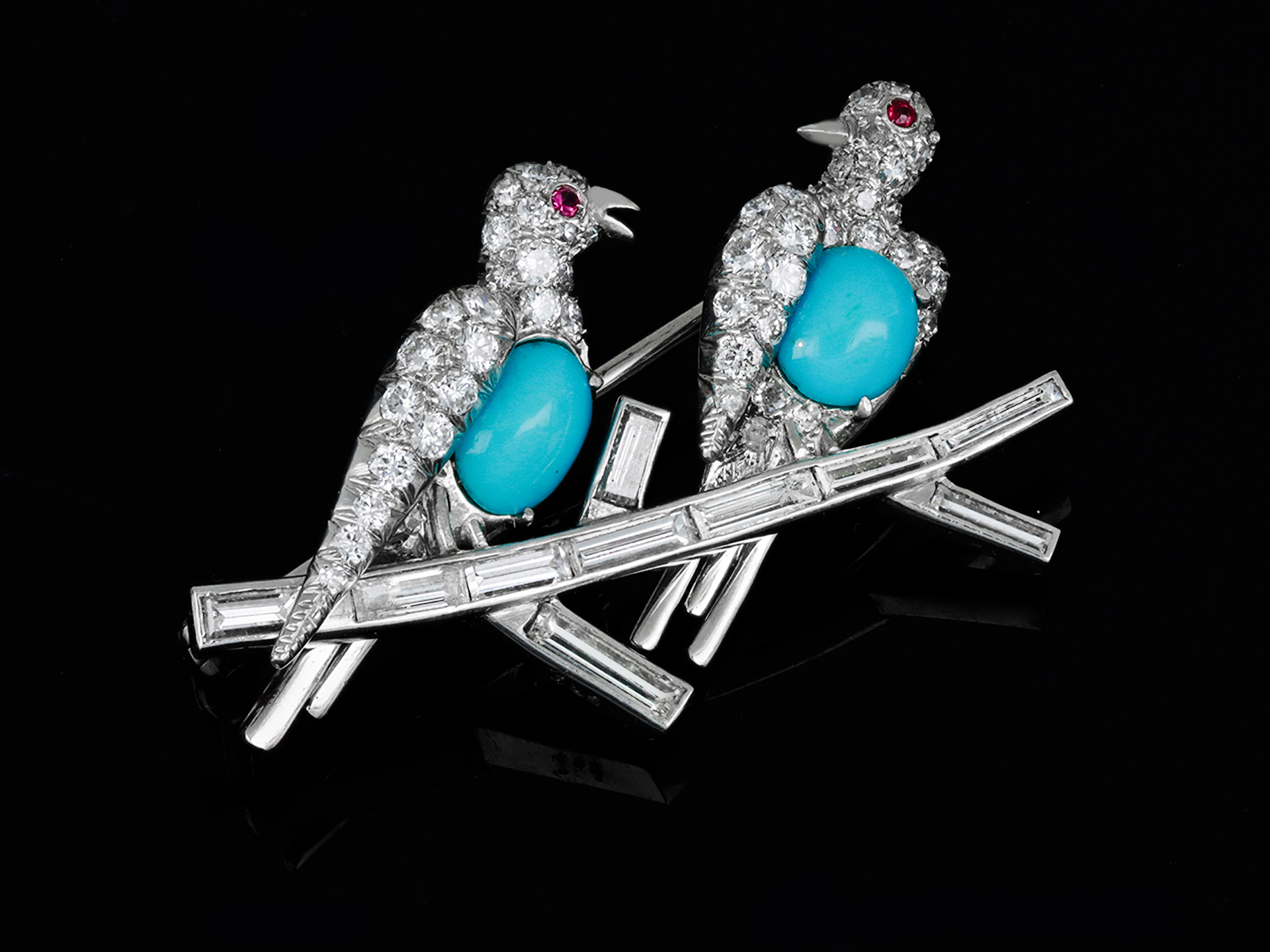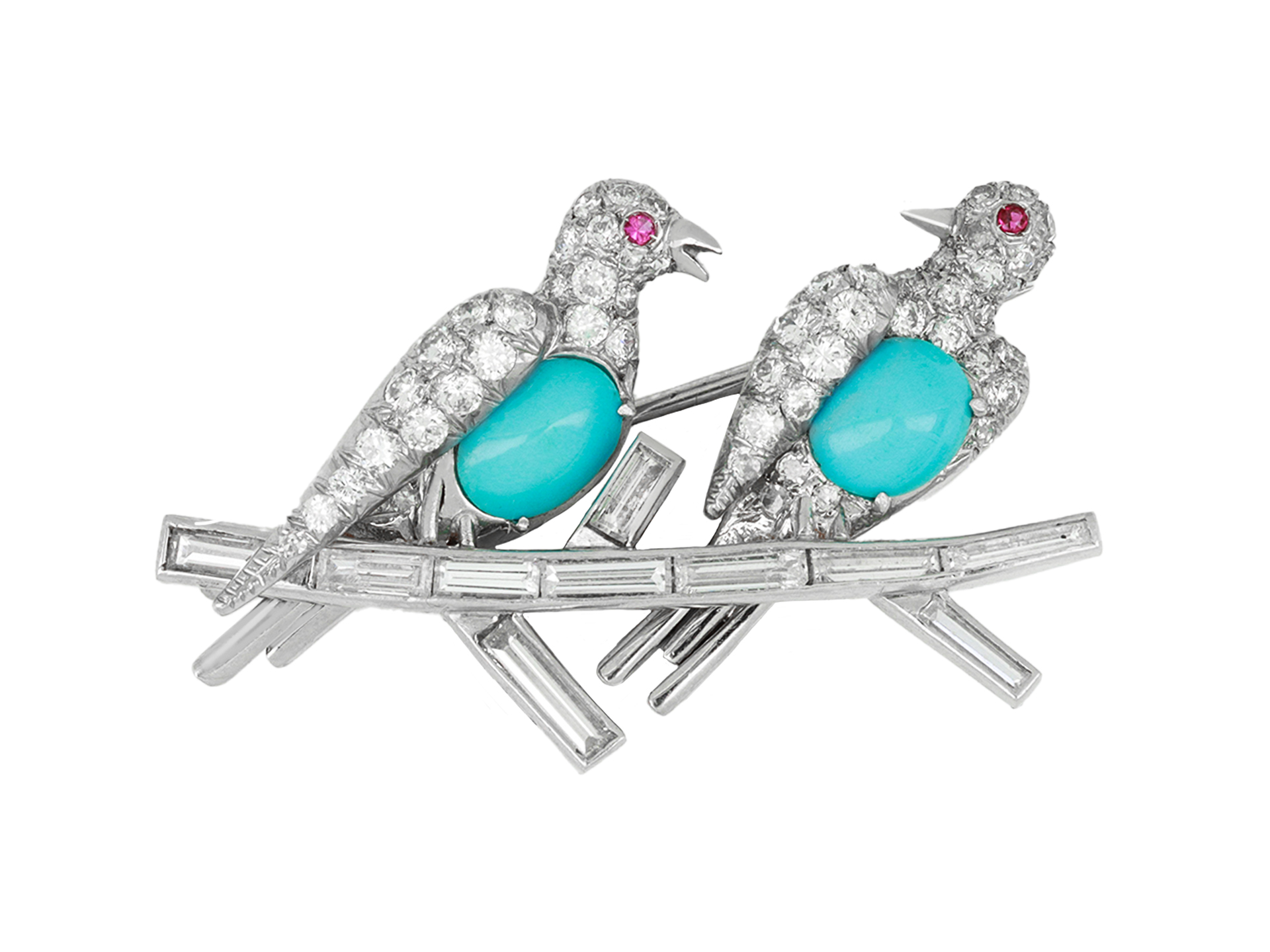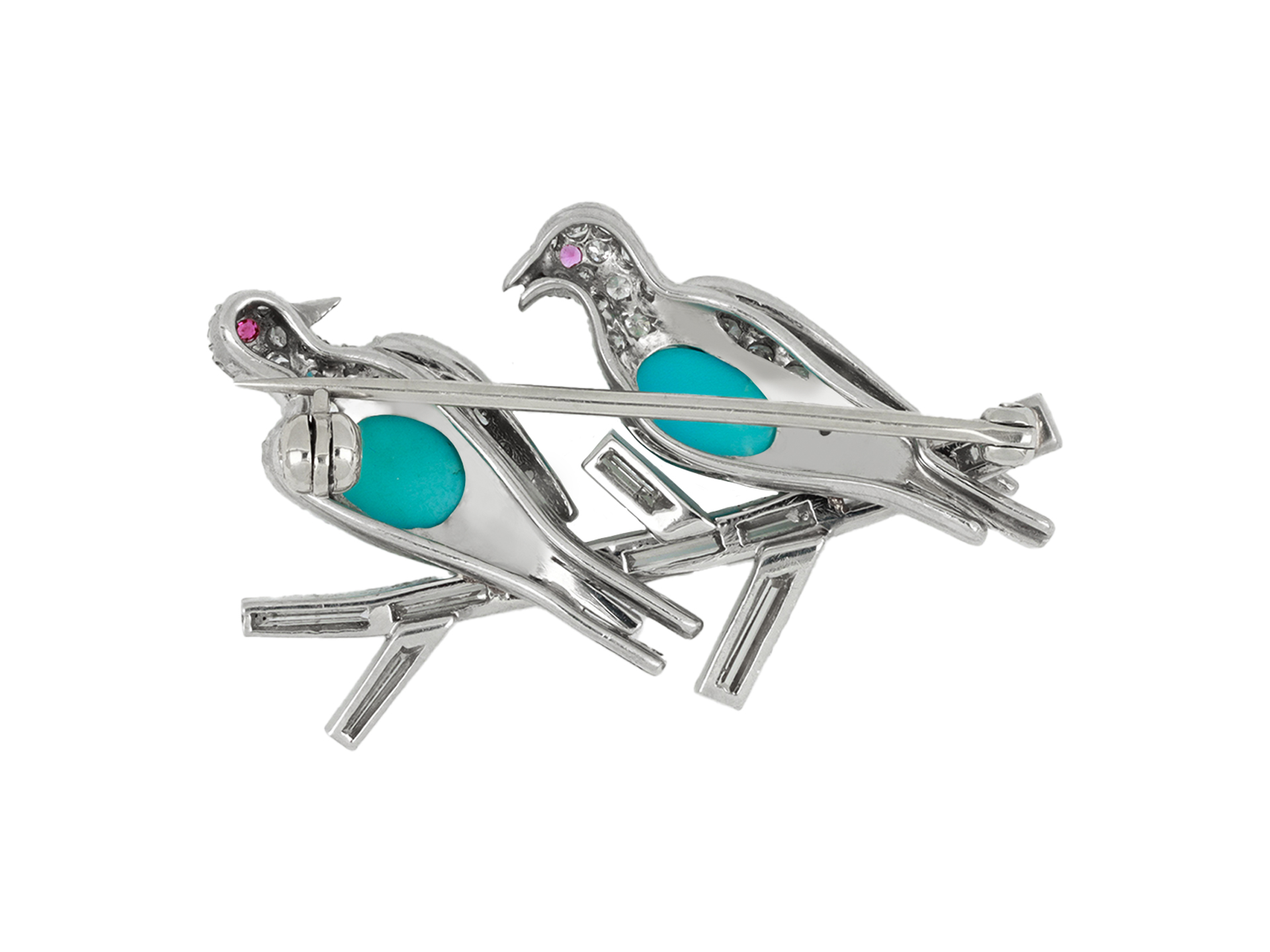 Lovebird Brooch. Set with two oval cabochon natural turquoise in open back claw settings with a combined weight of approximately 0.80 carats, further set throughout with fifty-four round brilliant cut diamonds in open back claw and cut-down settings with a combined approximate weight of 0.80 carats and decorated with ten rectangular baguette-cut diamonds in open back rubover settings with a combined weight of 0.65 carats. The total approximate diamond weight is 1.45 carats, to an ornate brooch featuring two lovebirds with ruby set eyes perched on a branch, with polished edges and open backholing, fitted to reverse with a a secure hinged pin, approximately 3.3cm in length. Marked 18 carat white gold and tested platinum, circa 1960, accompanied by vintage box.