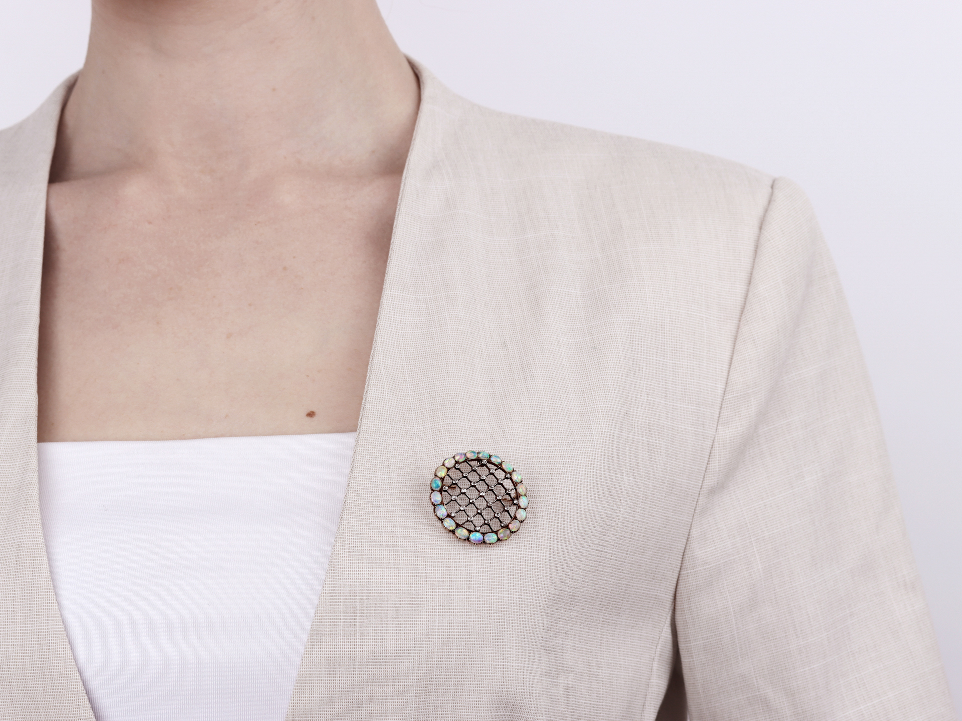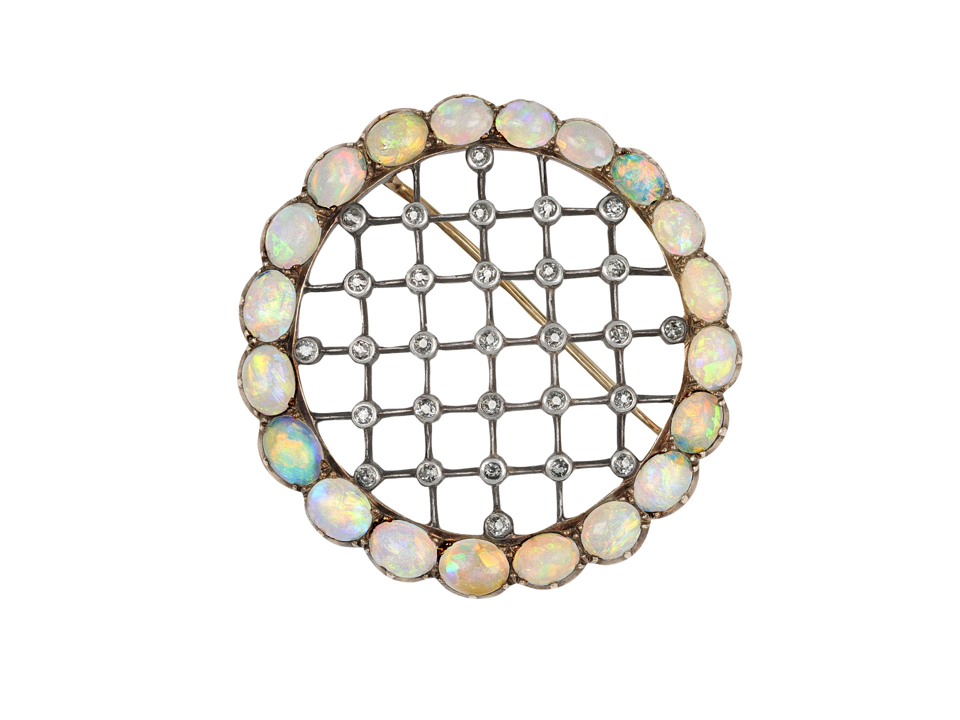 Victorian opal and diamond lattice brooch. Set around the circumference with twenty oval cabochon natural white opals in open back cut-down settings with a combined approximate weight of 3.00 carats, and further decorated with twenty-nine round eight cut diamonds in open back rubover settings with a combined approximate weight of 0.60 carats, to an elegant circular brooch design featuring intricate openwork with polished edges and fancy shape open backholing, fitted to reverse with a secure pin and hinged bail, approximately 3.5cm in width. Tested rose gold and silver, circa 1900.