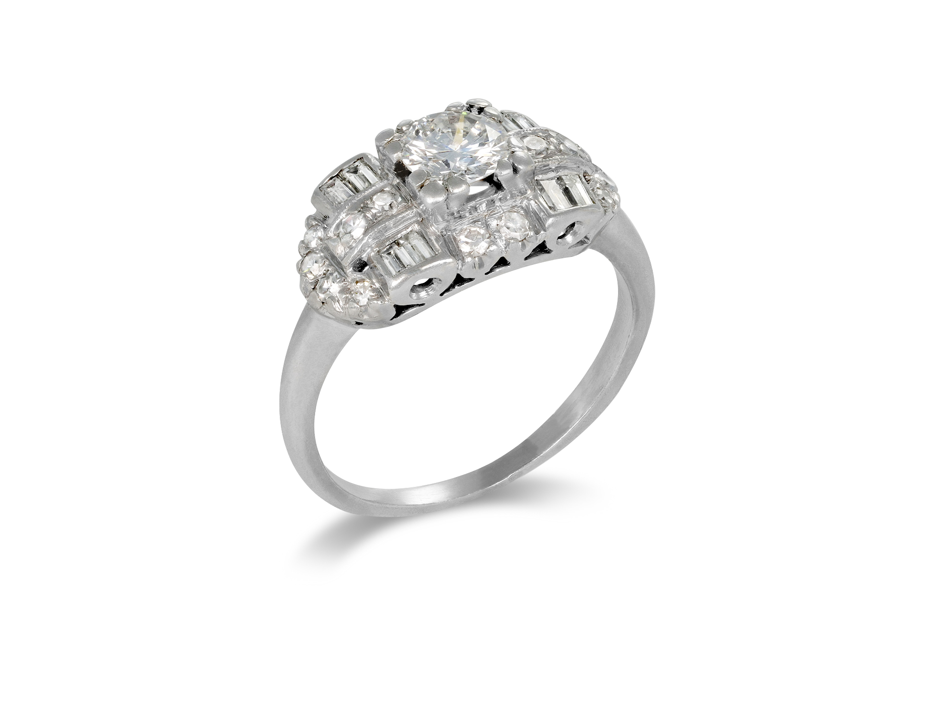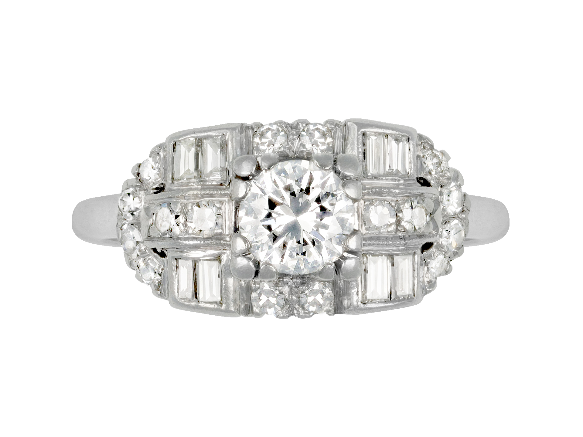 Vintage diamond cluster ring. Set to centre with a round brilliant cut diamond in an open back claw setting with an approximate weight of 0.60 carats, further set with eight rectangular baguette cut diamonds in open back rubover and channel settings with a combined weight of 0.40 carats, further adorned with sixteen round eight cut diamonds in open back grain settings with a combined weight of 0.40 carats. The total approximate diamond weight is 1.40 carats, to a curving cluster form with polished edges, a scrolling gallery and open backholing, the slightly raised shoulders leading to a solid D-shape shank. Marked platinum and iridium, American, circa 1950.