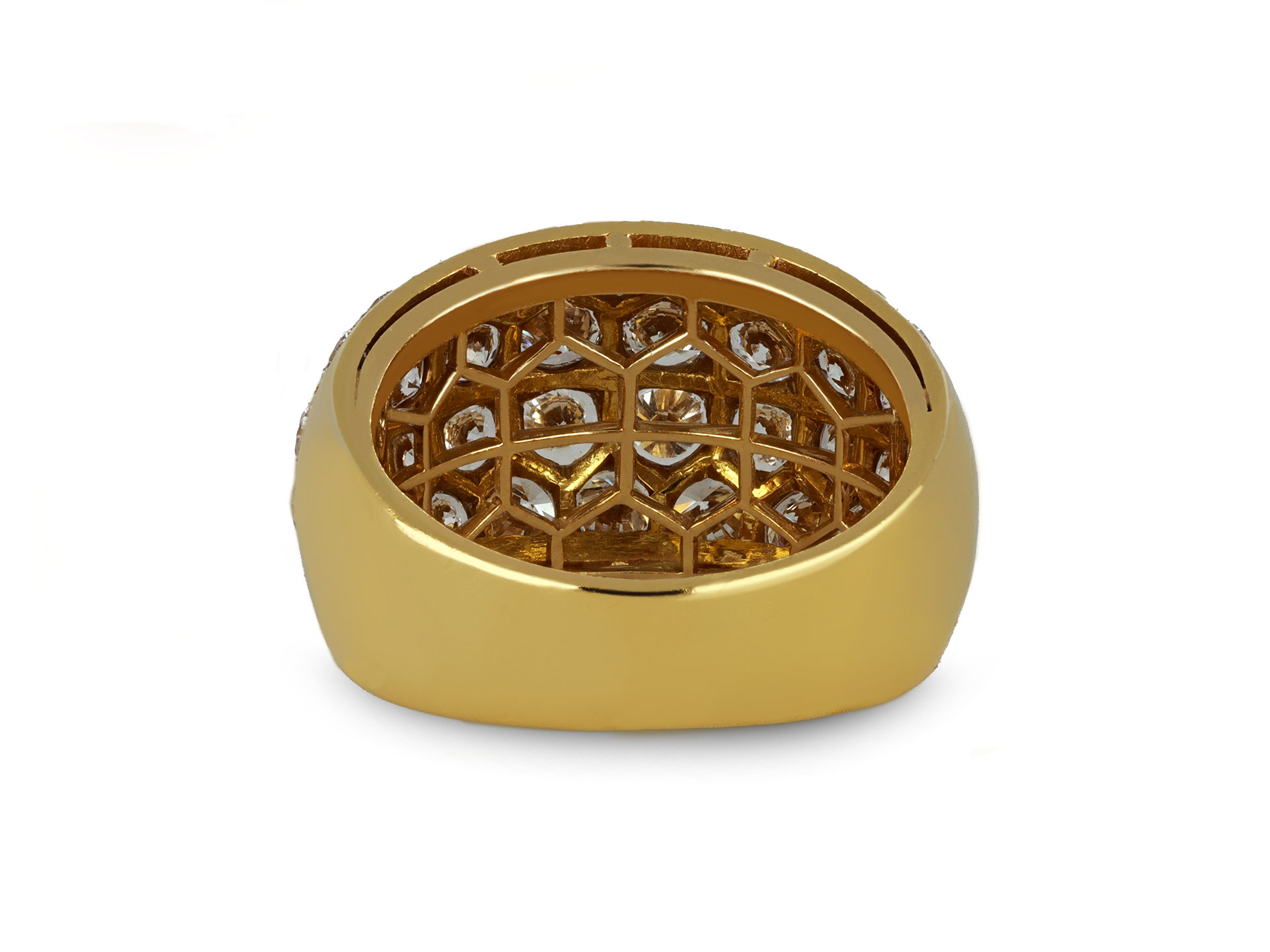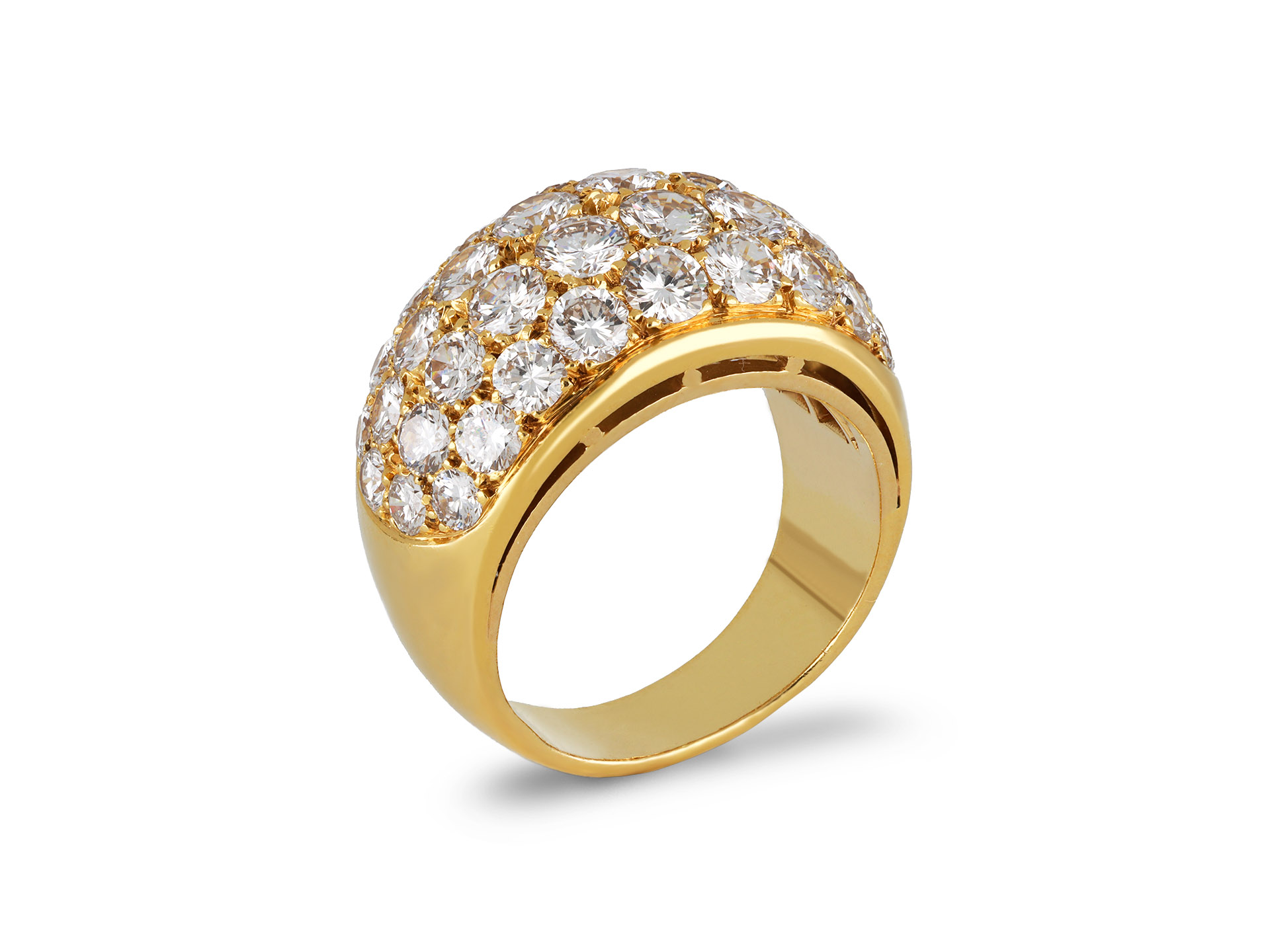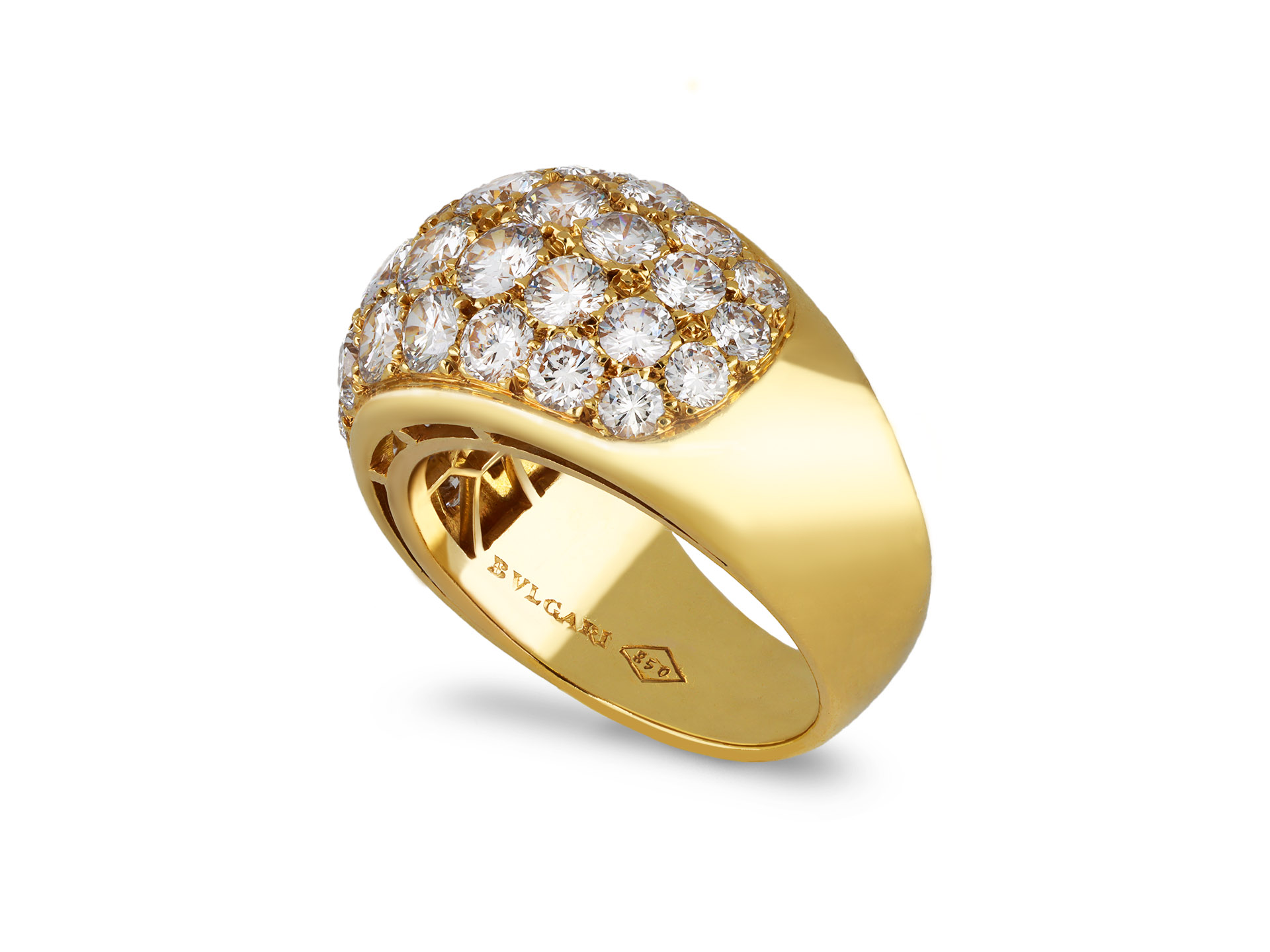 Bulgari bombé diamond cluster ring. Set with thirty eight round brilliant cut diamonds in open back grain settings with an approximate combined weight of 2.00 carats, to a heavy bombé design featuring polished borders, a linear gallery and fancy open backholing, leading to smooth integrated shoulders and flowing through to a solid half round shank. Marked 18 carat yellow gold, signed 'BVLGARI', Italian, circa 1945.