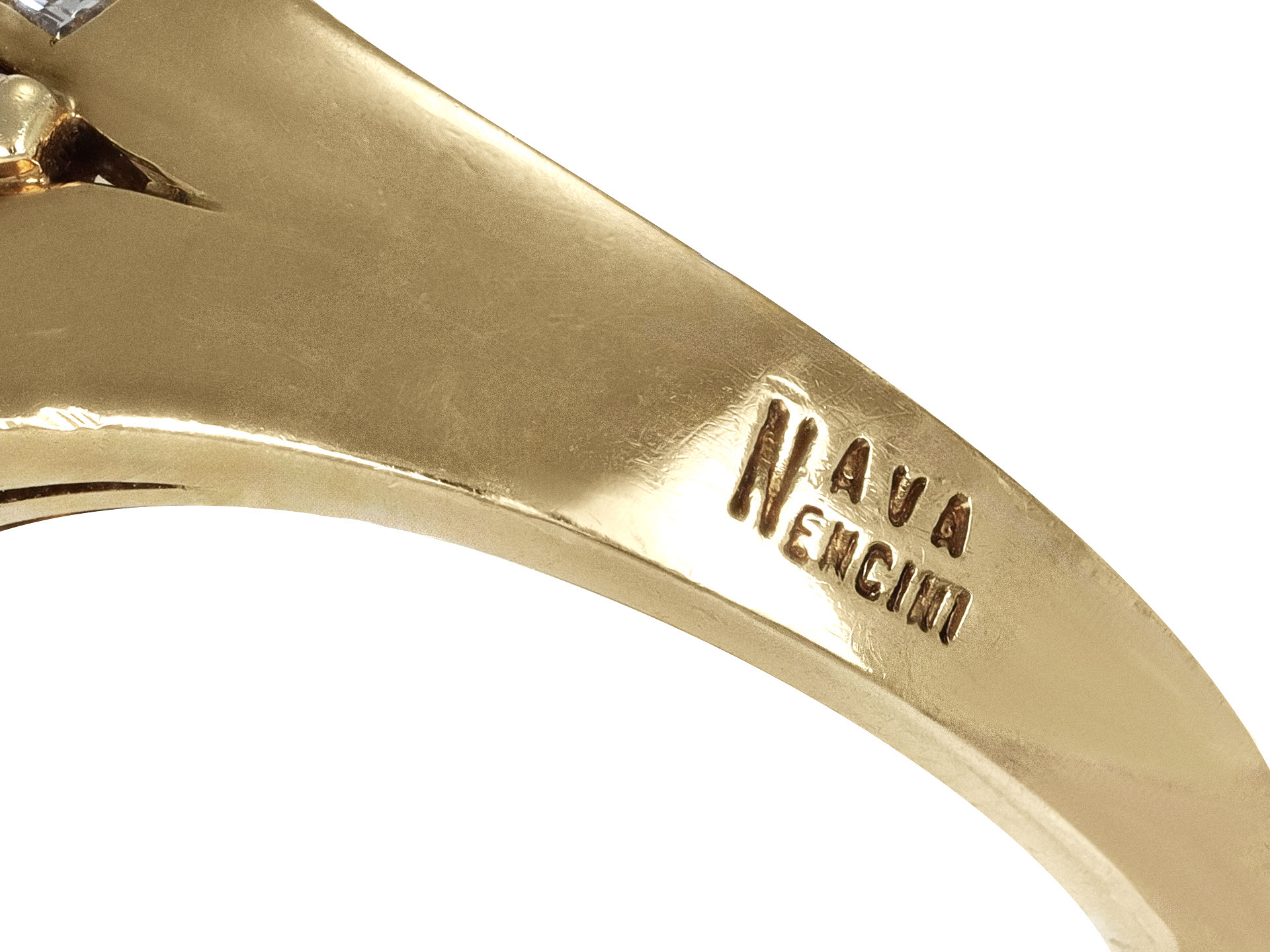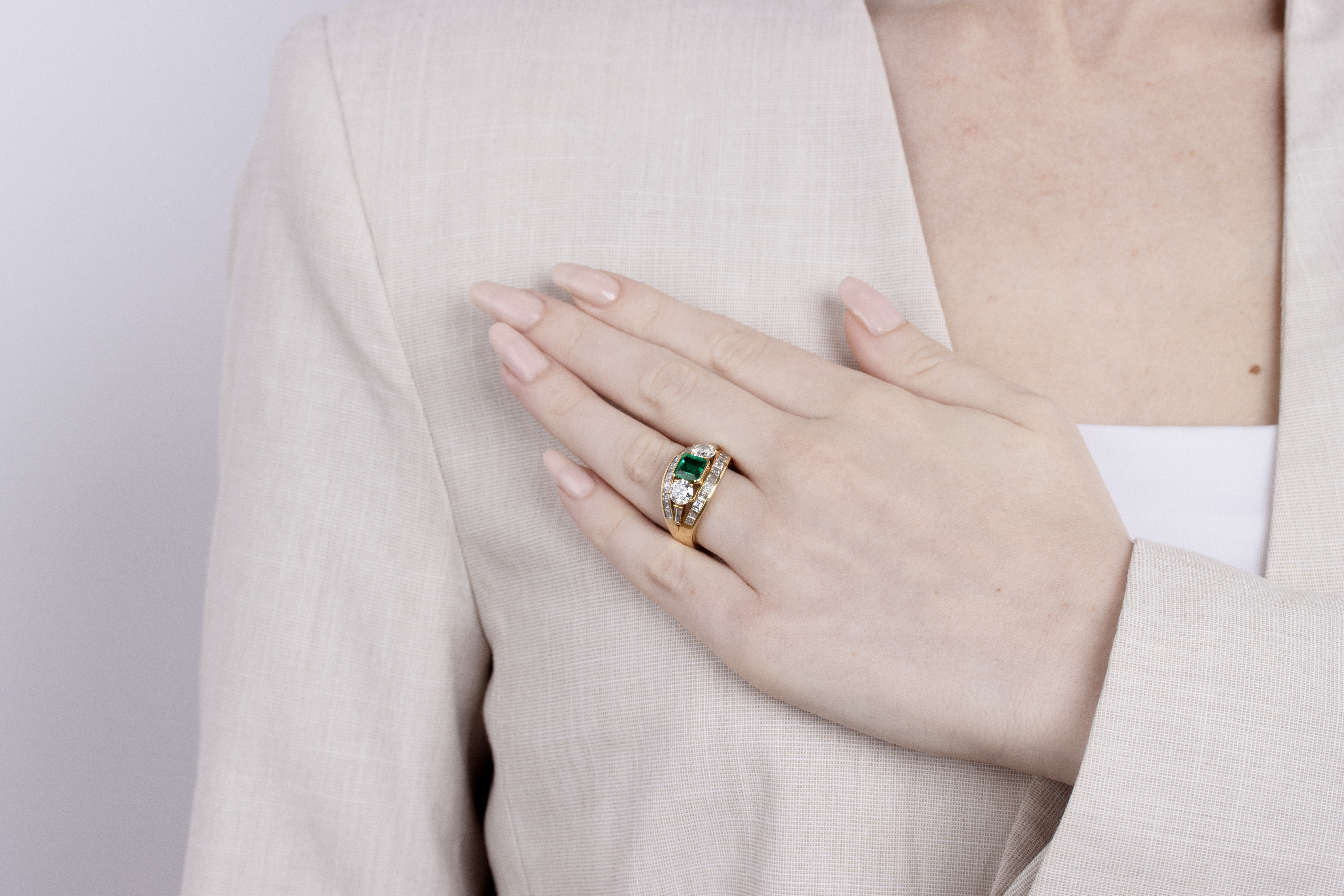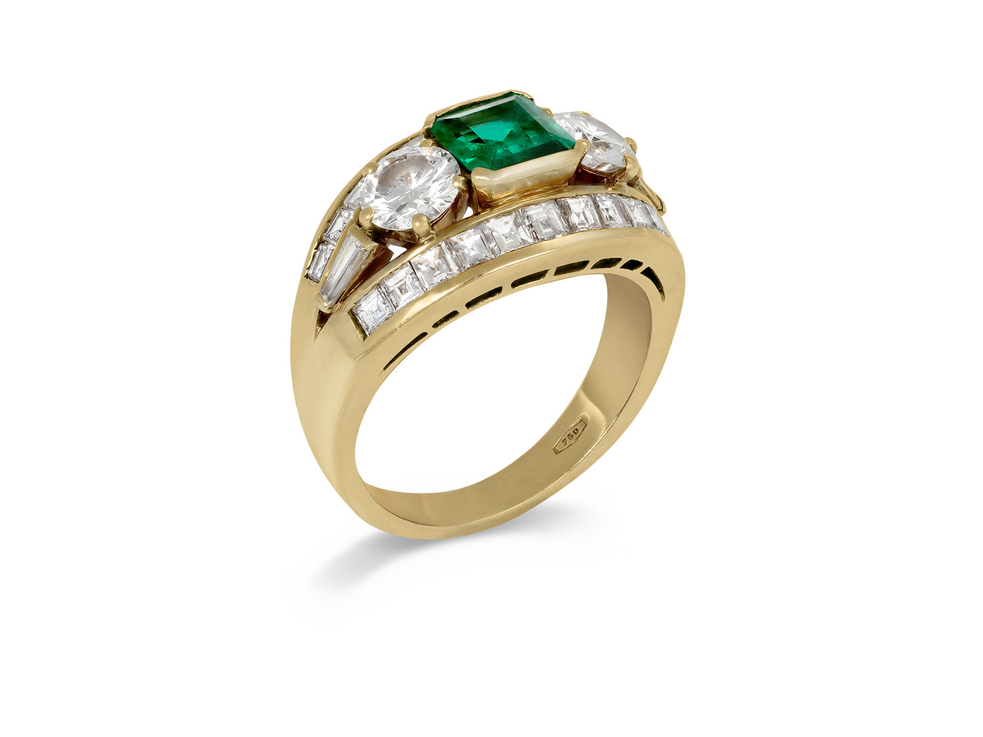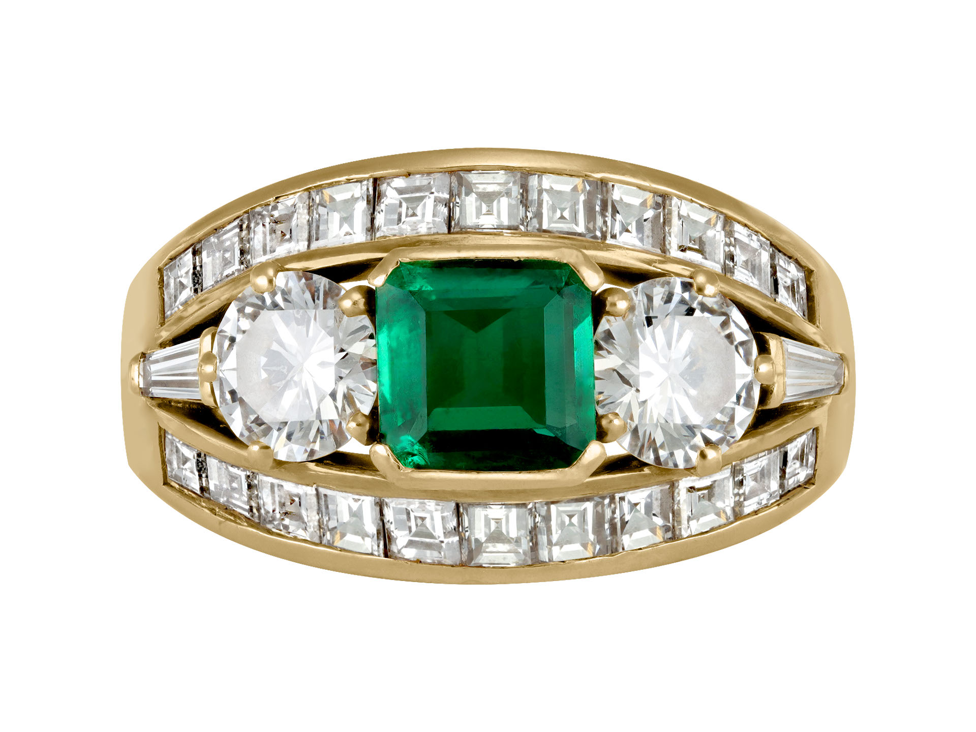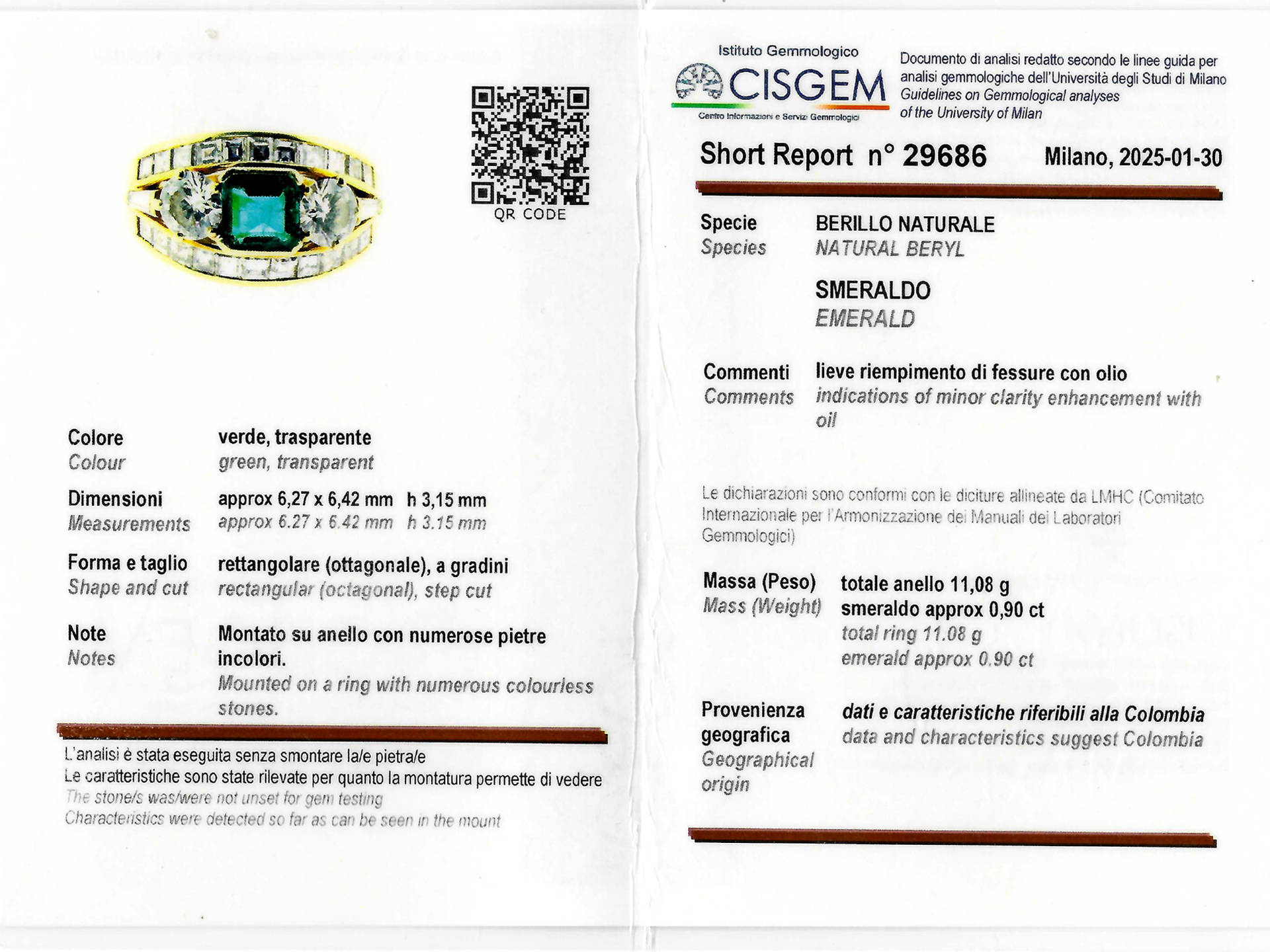 Colombian emerald and diamond ring. Set to centre with an octagonal emerald-cut natural Colombian emerald with minor oil in an open back half-rubover setting with an approximate weight of 0.90 carats, flanked by two round transitional cut diamonds in open back claw settings with a combined approximate weight of 1.30 carats, further set with two tapering baguette cut diamonds in open back half rubover settings with a combined weight of 0.20 carats, and framed to top and bottom with twenty-two square step-cut diamonds in open back channel settings with a combined weight of 1.30 carats. The total approximate diamond weight is 2.80 carats, to an impressive three stone cluster ring featuring polished edges, a linear pierced gallery and fancy shape open backholing, leading to tapering shoulders which flow through to a solid flat shank. Marked 18 carat yellow gold, signed 'Nava Encini', accompanied by Instituto Gemmologico Cisgem report #29686.