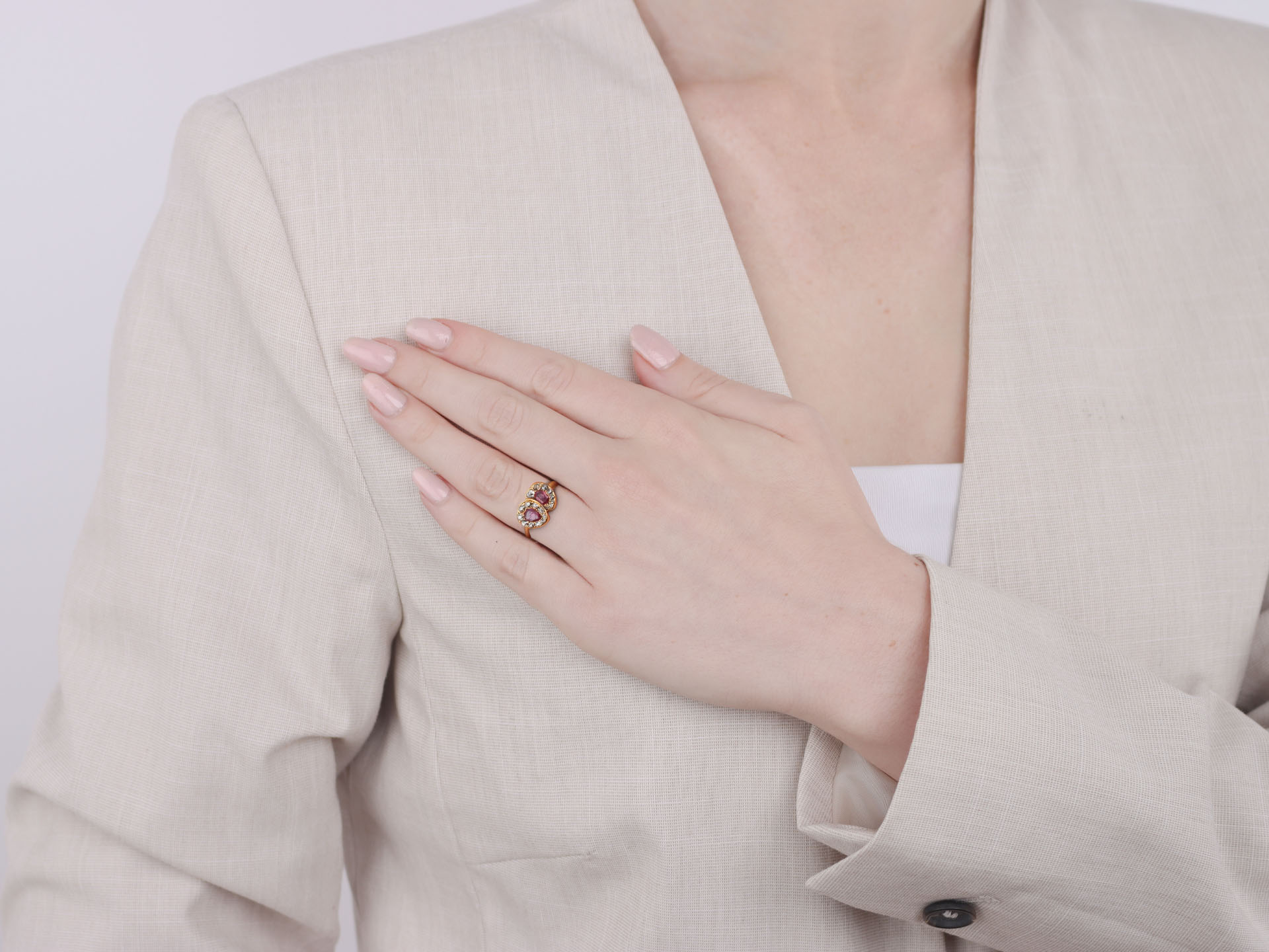 Ruby and diamond double heart ring. Set with two natural rubies, one drop shape, the other cushion shape, both in closed back grain settings with a combined approximate weight of 0.35 carats, decorated with eighteen cushion shape old mine rubies in closed back grain and rubover settings with a combined approximate weight of 0.55 carats, to an elegant double heart cluster ring featuring a polished gallery and closed backholing, leading to smooth shoulders which flow through to a solid D-shape shank. Tested 18 carat yellow gold, circa 1840s.