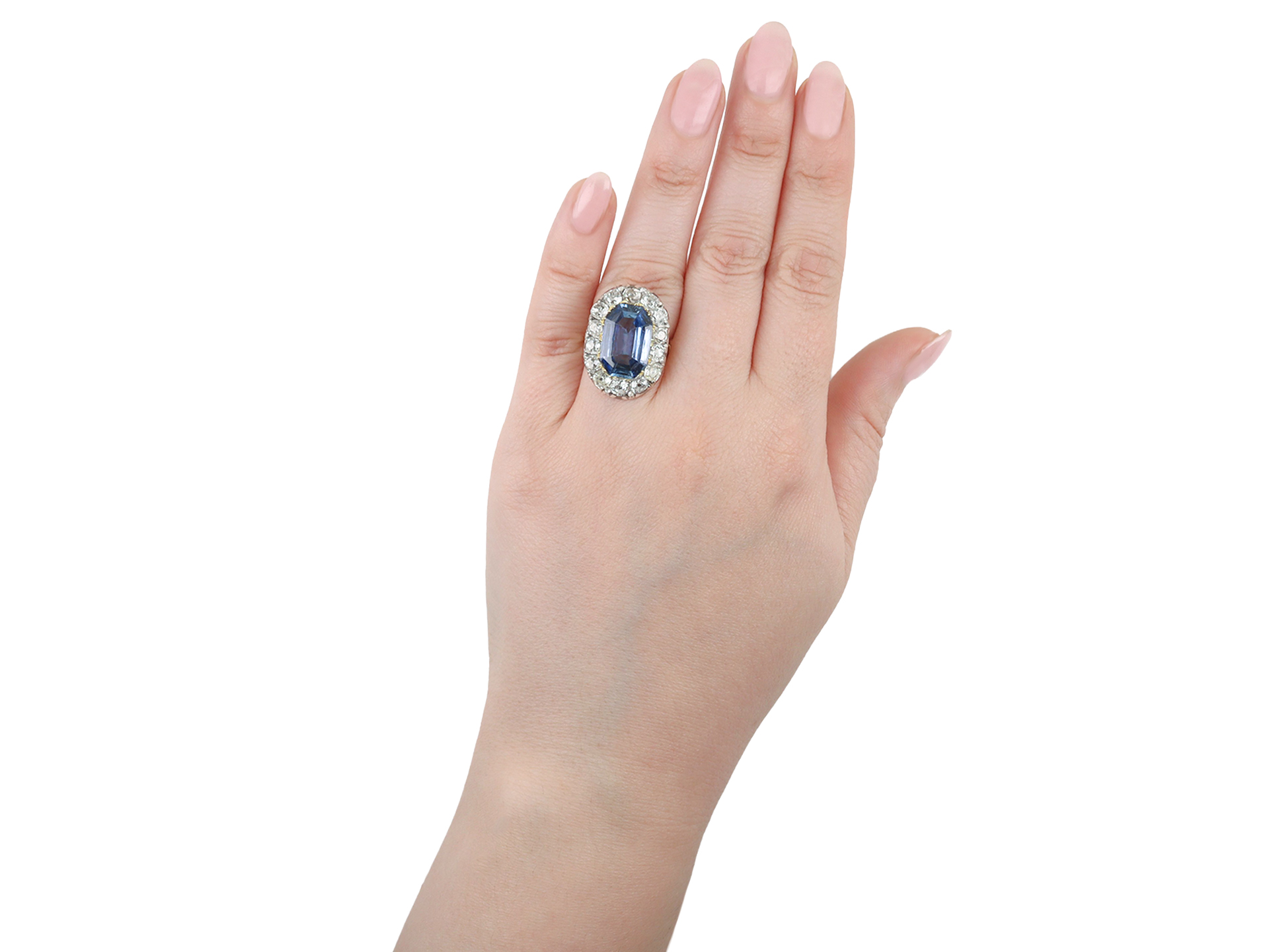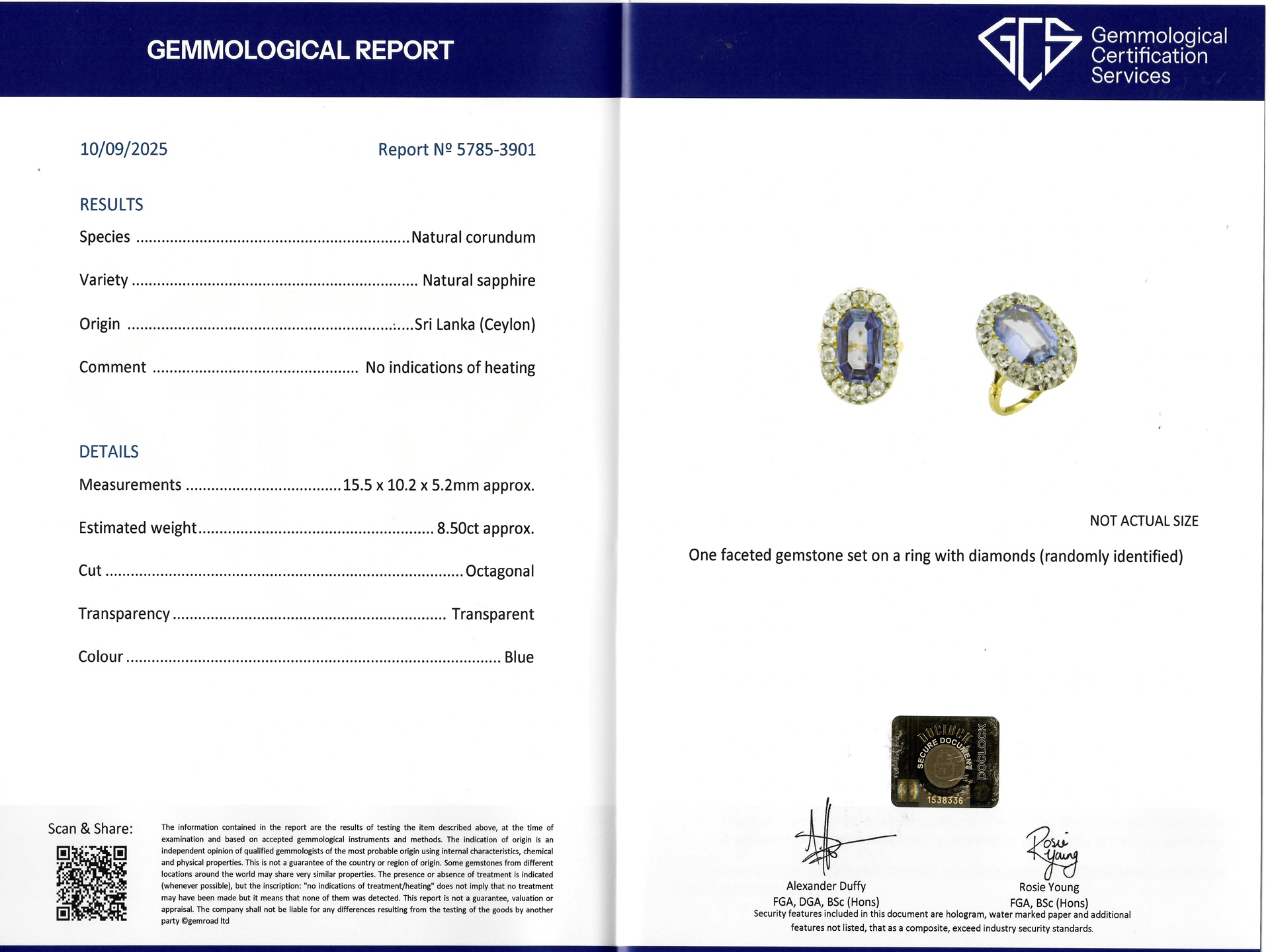Victorian sapphire and diamond coronet cluster ring. Centrally set with an octagonal emerald cut natural no heat Ceylon sapphire with an approximate weight of 8.50 carats, surrounded by fourteen cushion shape old mine diamonds in open back cut-down and grain settings with a combined approximate weight of 4.20 carats, accented with four round rose cut diamonds with a combined approximate weight of 0.04 carats. The total approximate diamond weight is 4.24 carats, to an impressive elongated cluster design, featuring polished edges, a gadrooned gallery and oval open backholing, leading to ornate scrolling split shoulders which terminate in ridged detail, and flowing through to a solid D-shaped shank. Marked in 18 carat yellow gold, settings tested silver, circa 1870, accompanied by Gemmological Certification Services report #5785-3901.