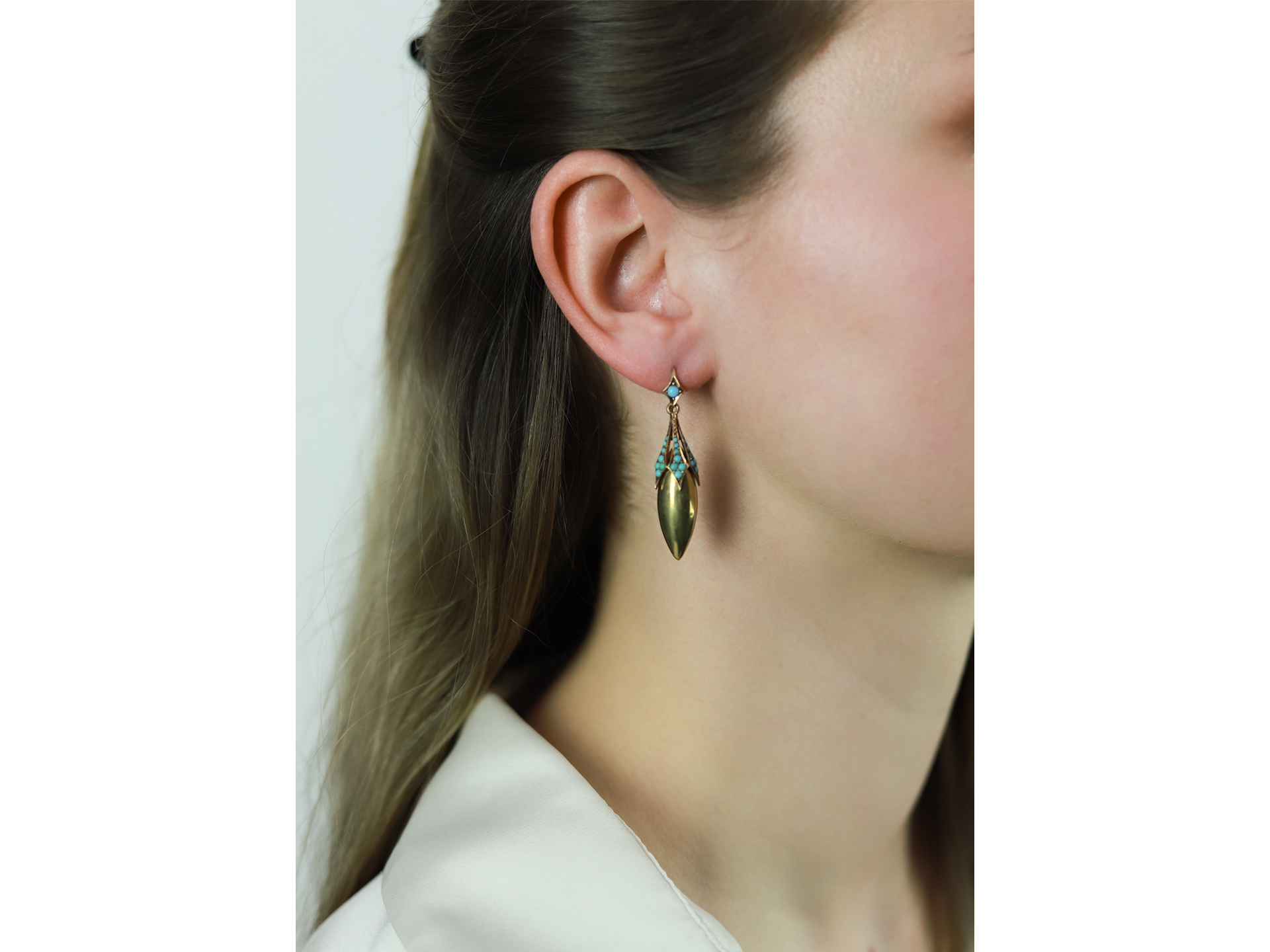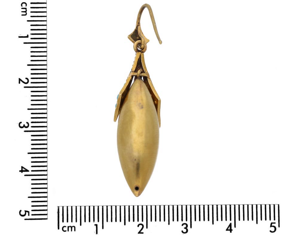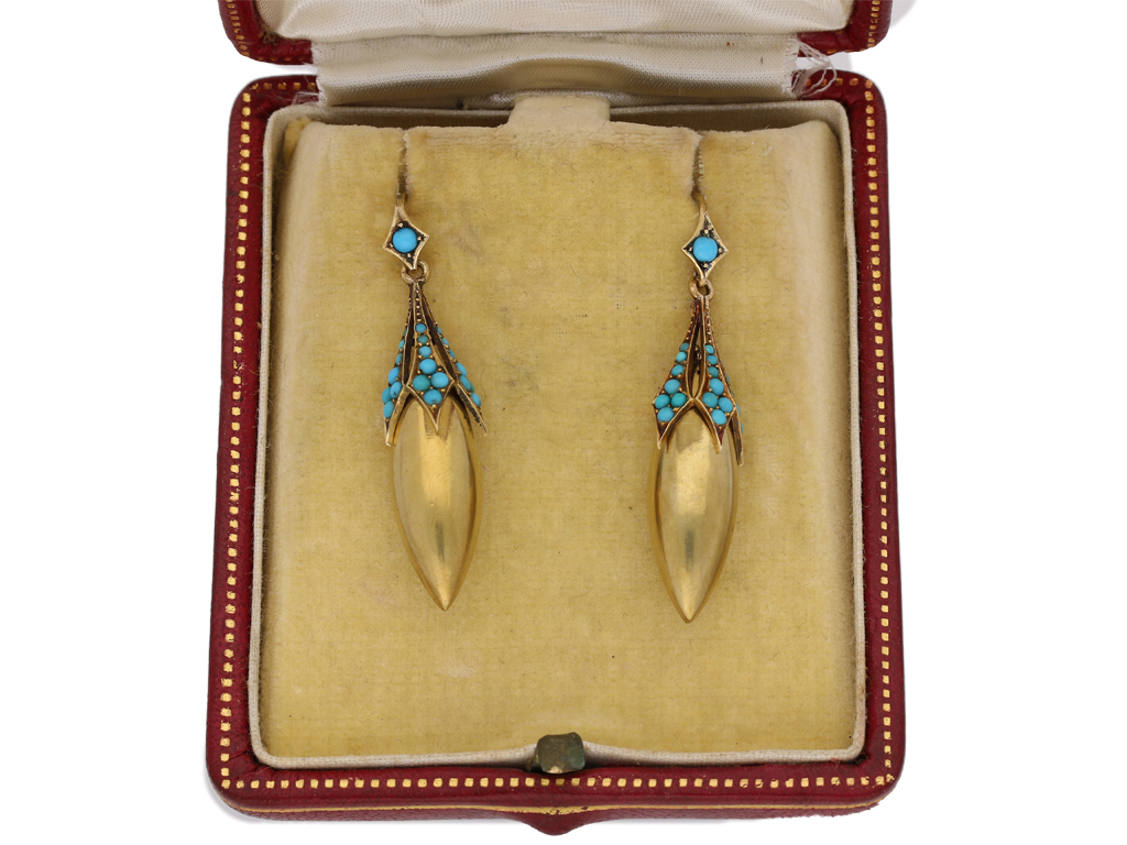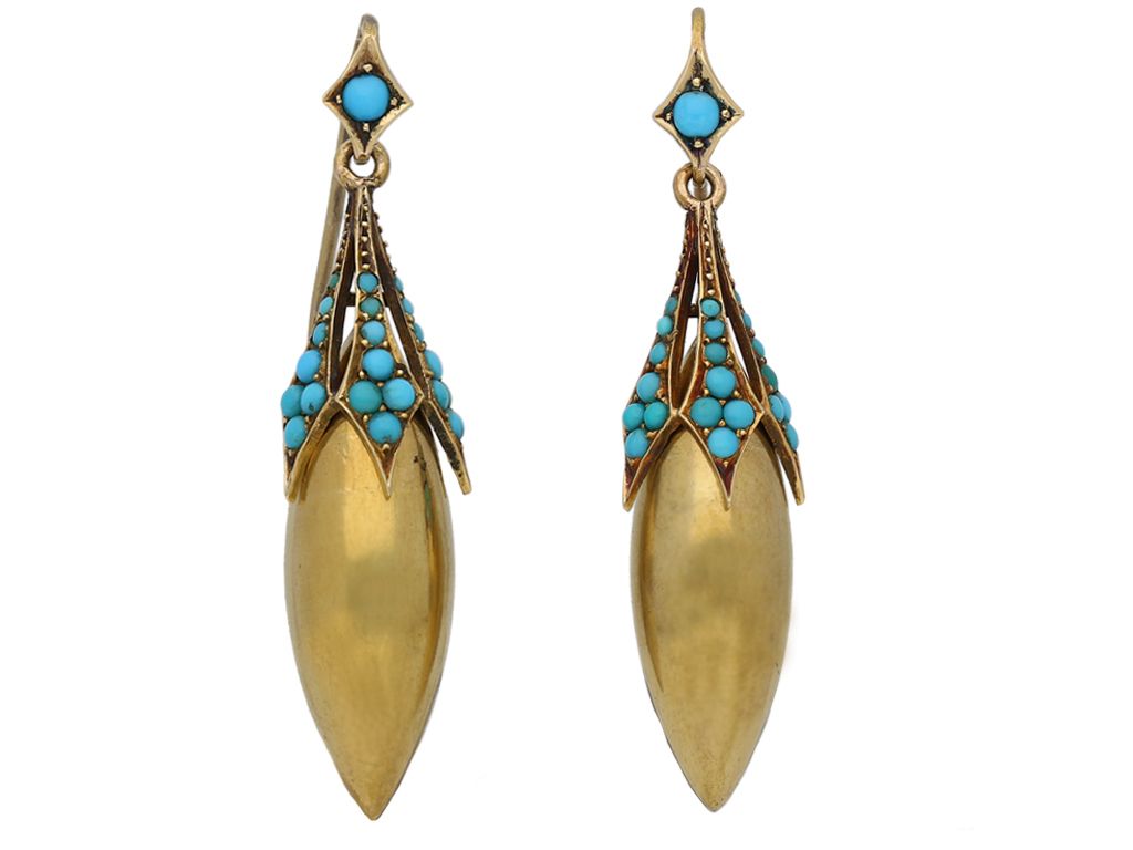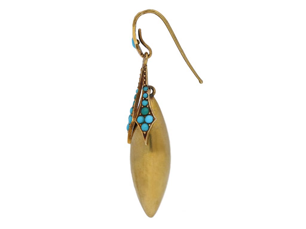 Antique turquoise drop earrings. A matching pair, each set with twenty two round cabochon natural turquoise in closed back grain settings, forty four in total, all to an elegant gold amphora-shaped drop earring, suspended from an attractive decorative surmount and further suspended from a diamond shape top, articulated and flowing with movement and fitted to reverse with a secure shepherd's hook, approximately 4.5 cm in length to top of hook. Tested yellow gold, circa 1870, accompanied by a fitted box.