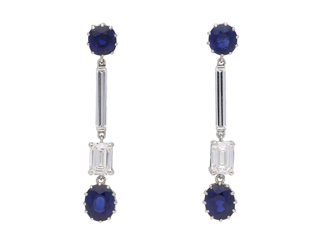 Art Deco Burmese sapphire and diamond drop earrings, circa 1930.
