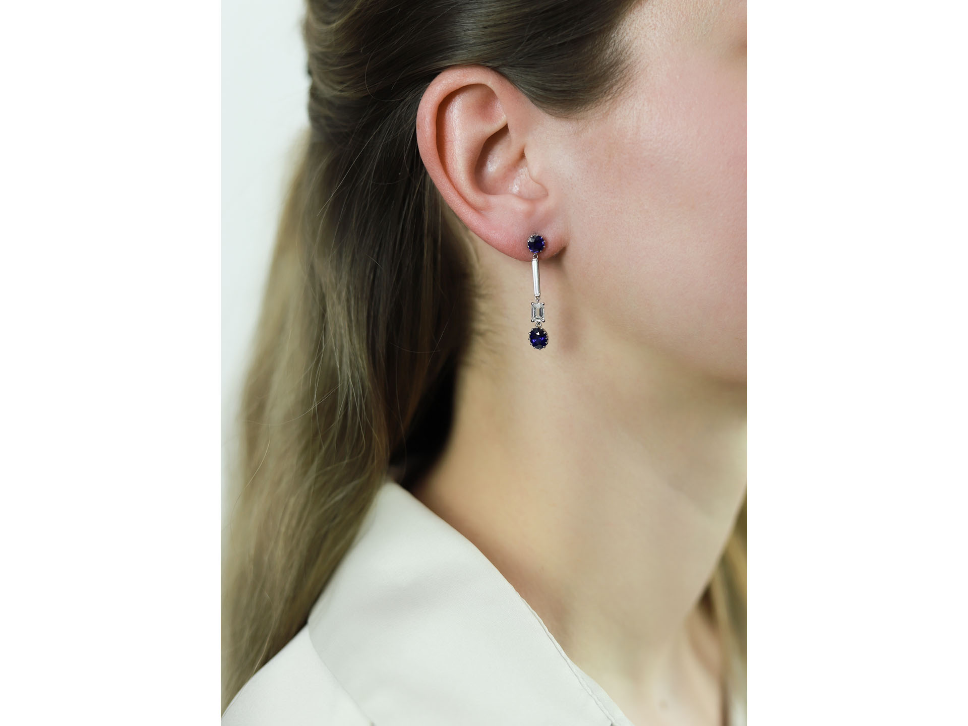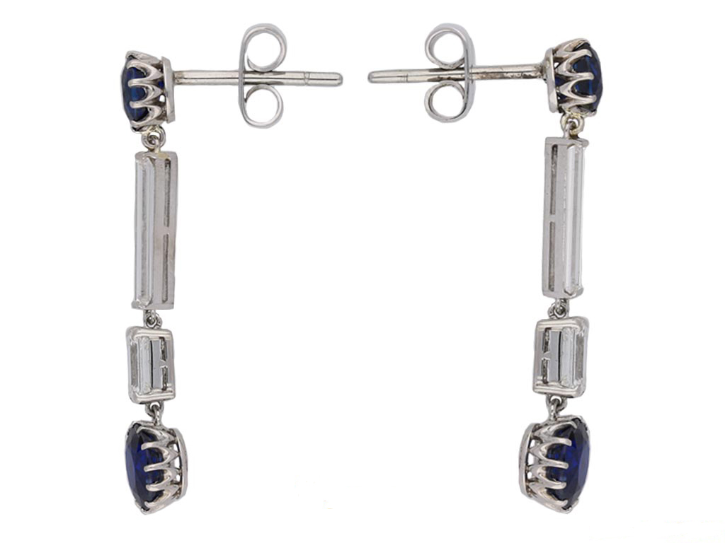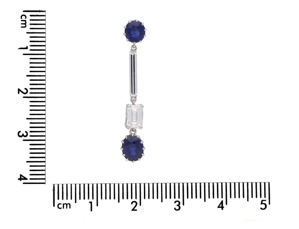Art Deco Burmese sapphire and diamond drop earrings. A matching pair, each suspending a cushion shape old cut natural unenhanced Royal Blue Burmese sapphire in an open back claw setting, two in total with a combined weight of 1.80 carats, one fitted to top with a cushion shape old cut natural unenhanced Royal Blue Burmese sapphire in an open back claw setting with a weight of 0.60 carats, the other fitted to top with a cushion shape old cut natural unenhanced sapphire in an open back claw setting with a weight of 0.74 carats, each decorated withan octagonal emerald-cut diamond in an open back claw setting, two in total with a combined approximate weight of 1.04 carats, and further set with a rectangular baguette cut diamond in an open back half rubover setting, two in total with a combined weight of 0.50 carats. The total approximate sapphire weight is 3.14 carats, the total approximate diamond weight is 1.54 carats, to an elegant articulated drop earring, flowing with movement featuring intricately carved collets, curving claws, polished borders and geometric backholing, fitted to reverse with a secure post and butterfly, approximately 3.3cm in length. Tested platinum, circa 1930, accompanied by Gem Research Swiss Lab (GRS) reports #GRS2016-120386, #GRS2016-120385 and GRS2016-120388.