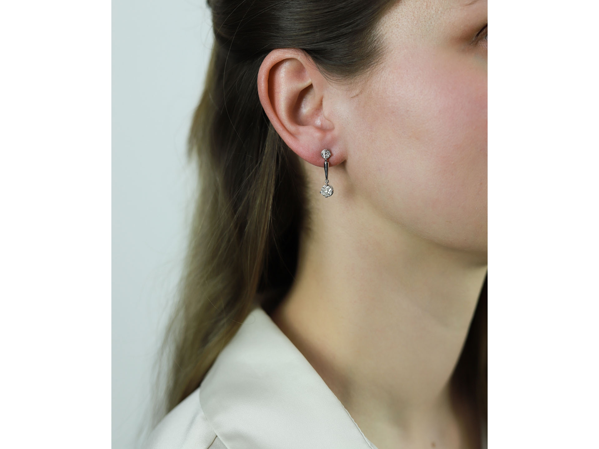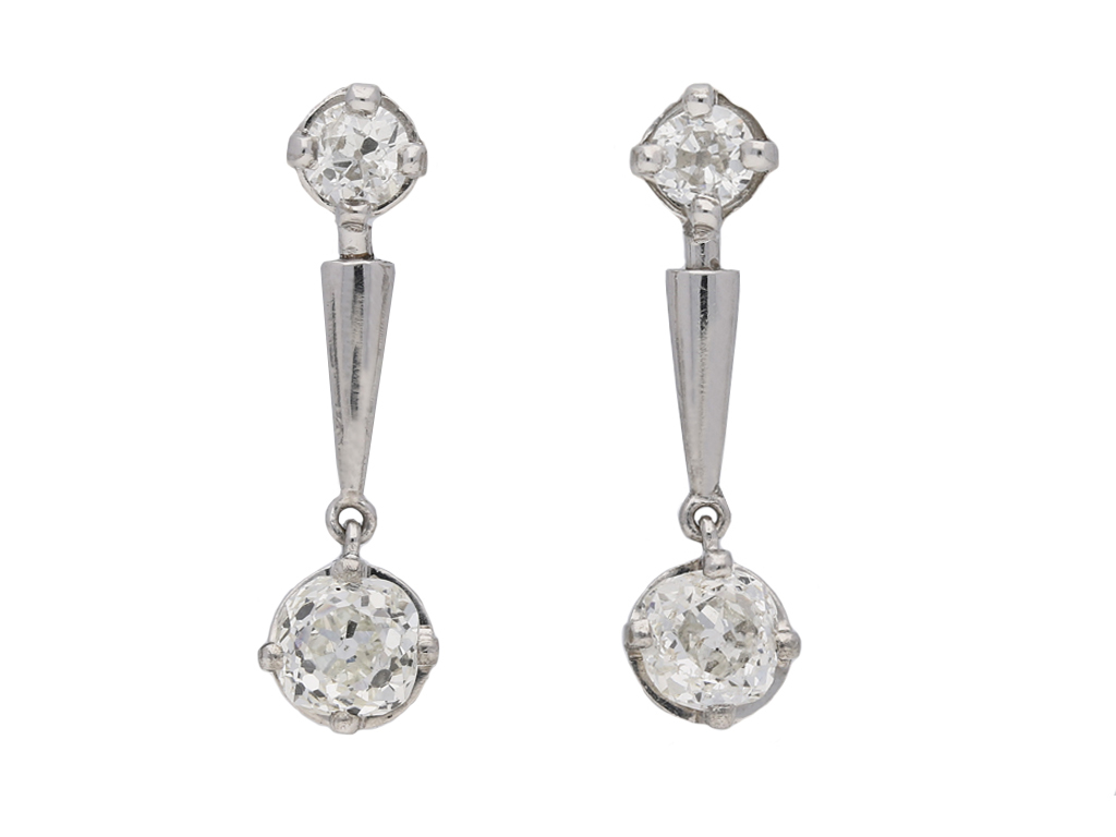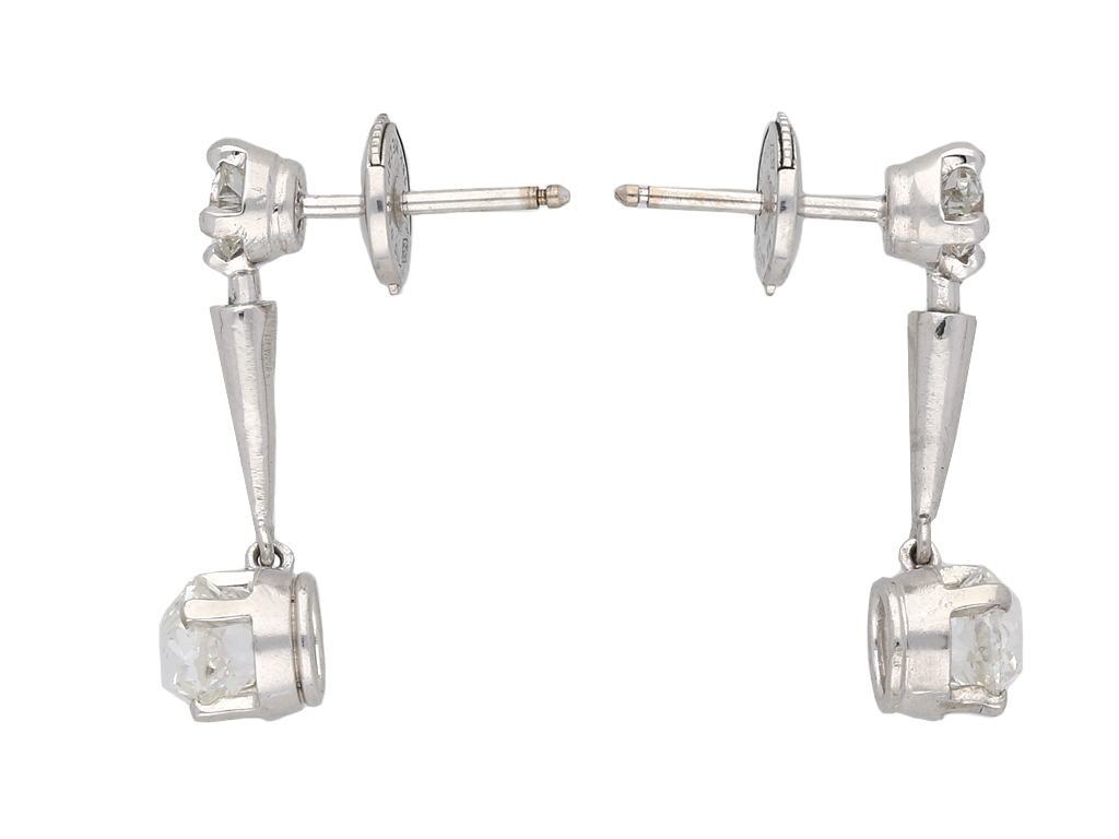 Art Deco diamond drop earrings. A matching pair of earrings, each set with a cushion shape old mine diamond in an open back four claw setting, two in total with a combined weight of 1.40 carats, suspended from a smaller cushion shape old mine diamond in similar settings, two in total with a combined weight of 0.40 carats. The total approximate diamond weight is 1.80 carats, to an articulated drop earring, flowing with movement from a slim tapering bar, with engraved linear details to the collets, pierced backholing and fitted to reverse with a secure post and disc, approximately 2.3cm in length. Earring tested white gold with platinum settings, disc marked 18 carat white gold, circa 1930.