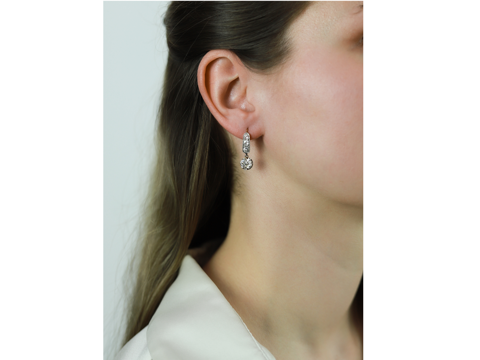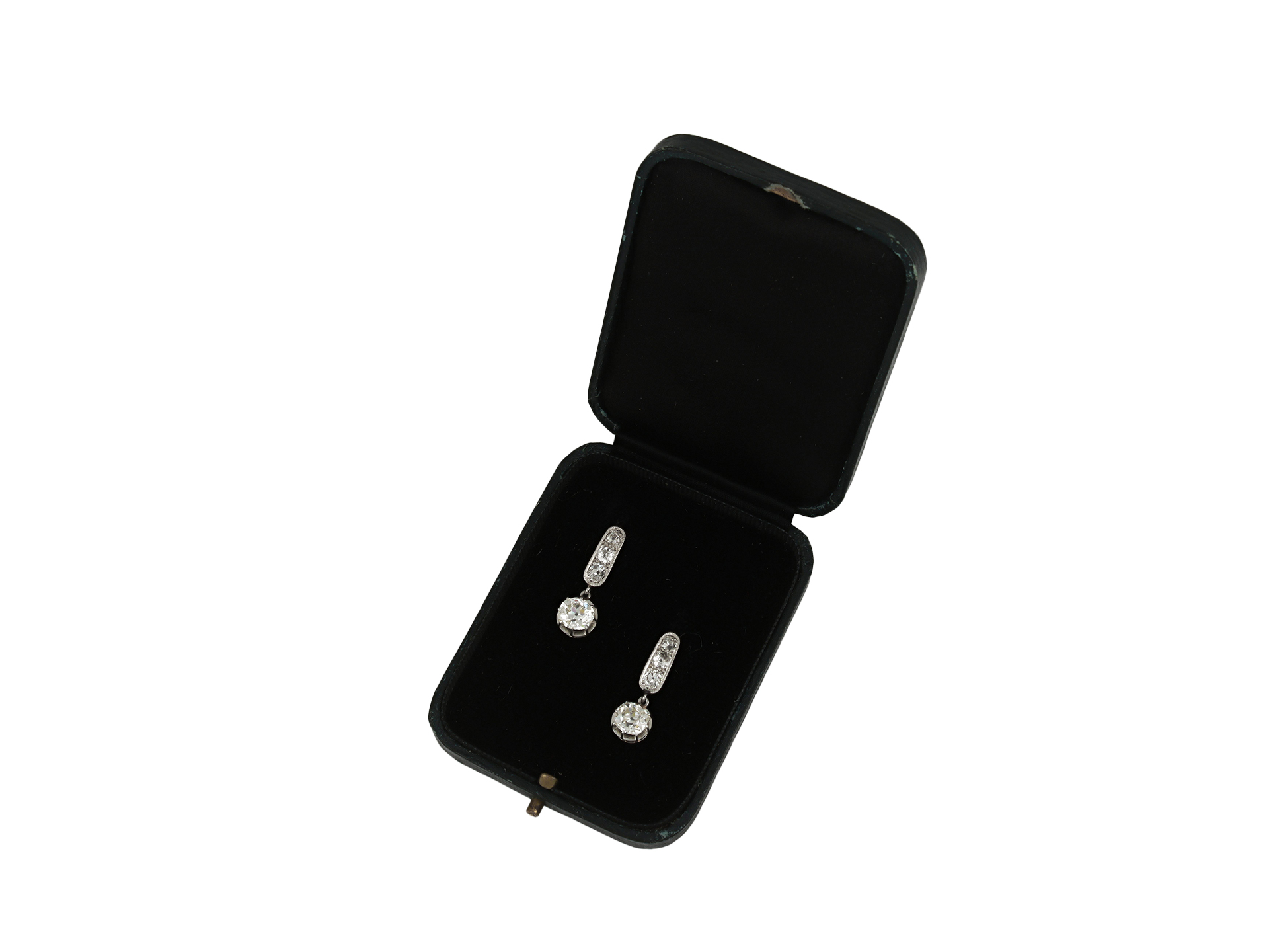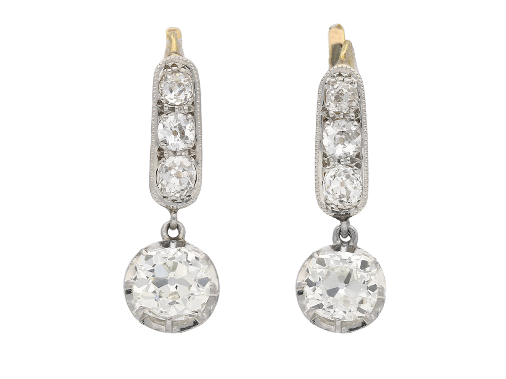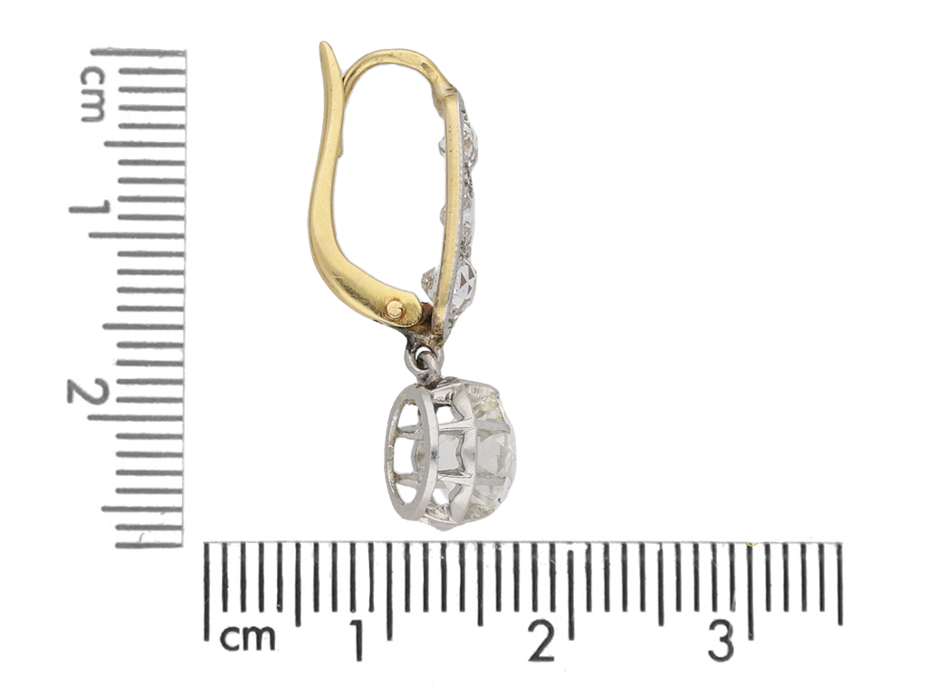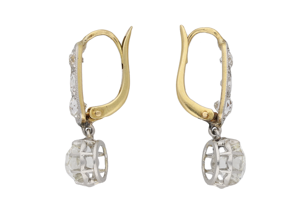 Belle Époque diamond drop earrings. A matching pair, each suspending a cushion shape old mine diamond in an open back claw setting, two in total, with a weight of 1.40 carats and 1.50 carats, further adorned with three cushion shape old mine diamonds in open back grain settings, six in total, with a combined weight of 0.70 carats. The total approximate diamond weight is 3.60 carats, to an articulated drop earring flowing with movement, featuring curving claws, an intricately pierced gallery, millegrain edging and open backholing, fitted to reverse with a secure curving shepherd's hook with hinged back fitting, approximately 2.4cm in length. Marked 18 carat yellow gold and platinum, French control marks, circa 1900, accompanied by fitted antique box.