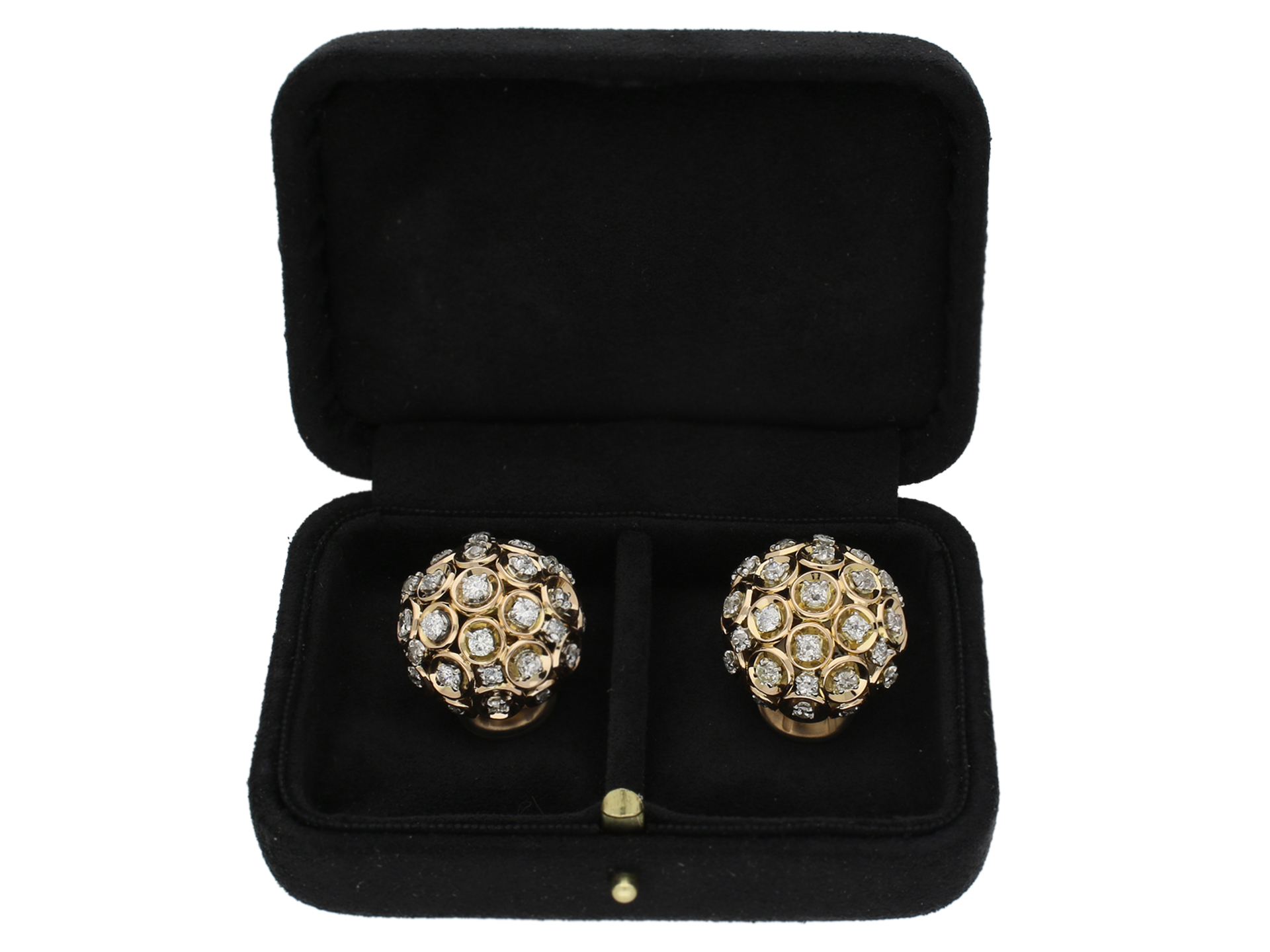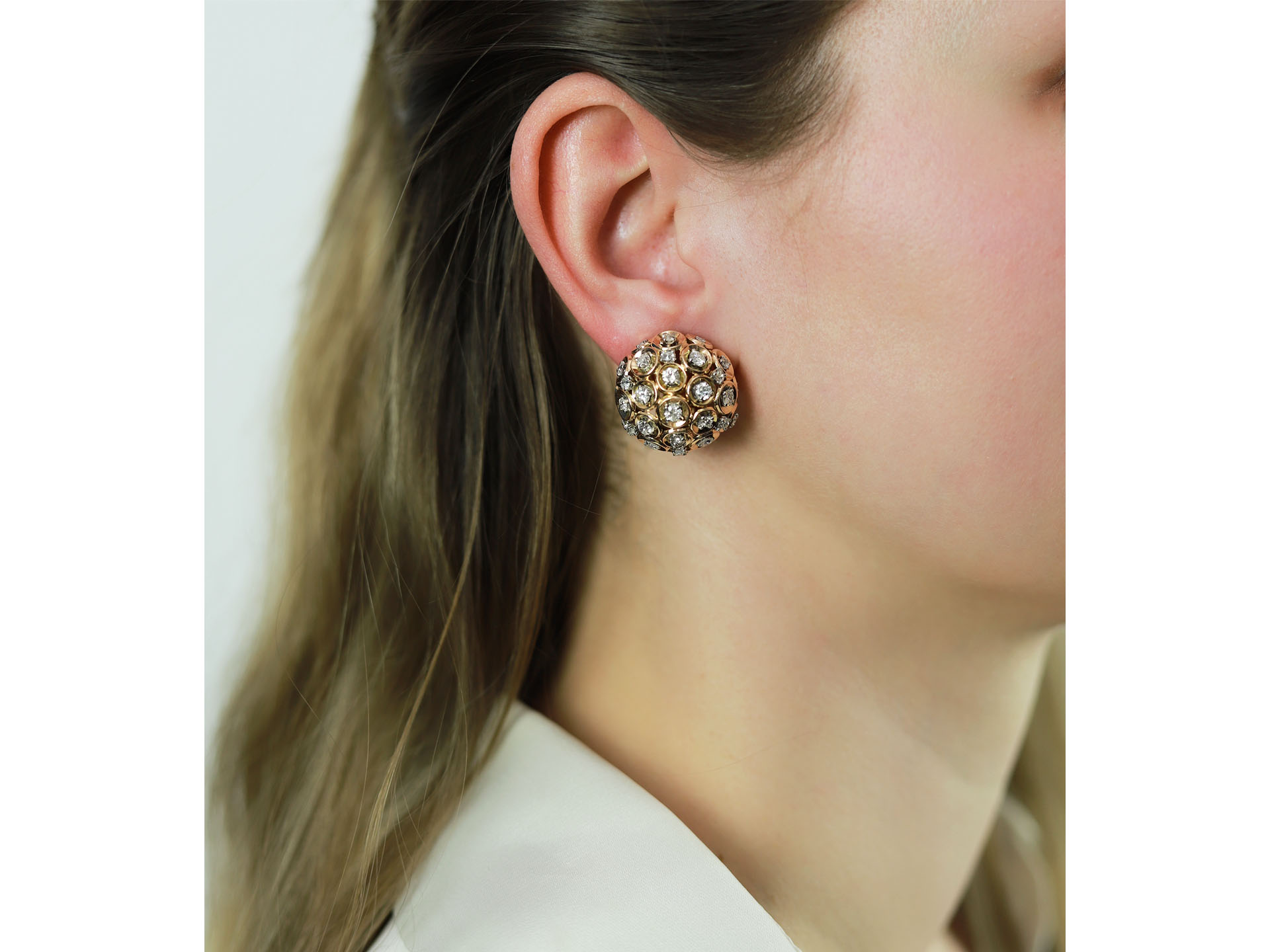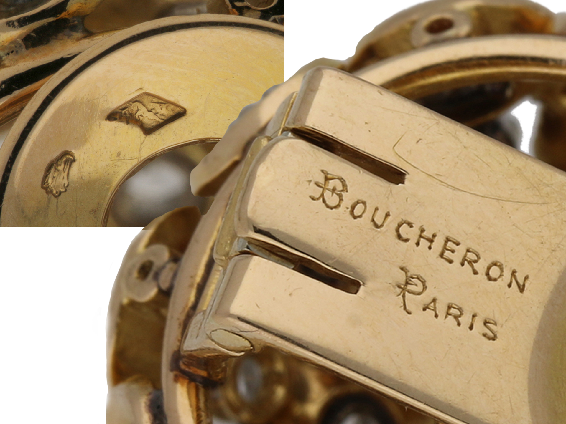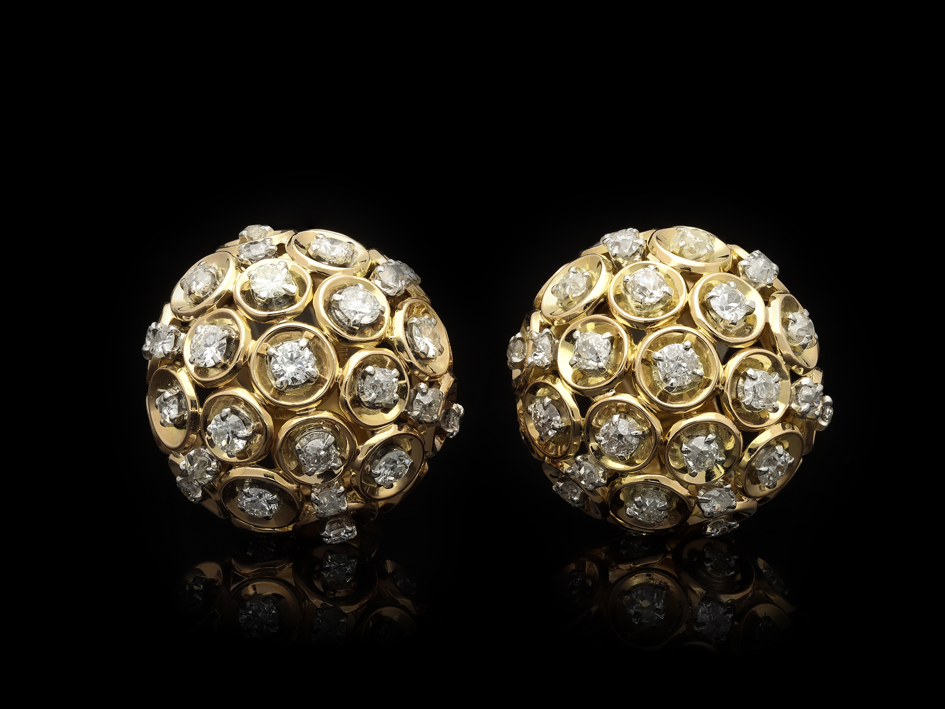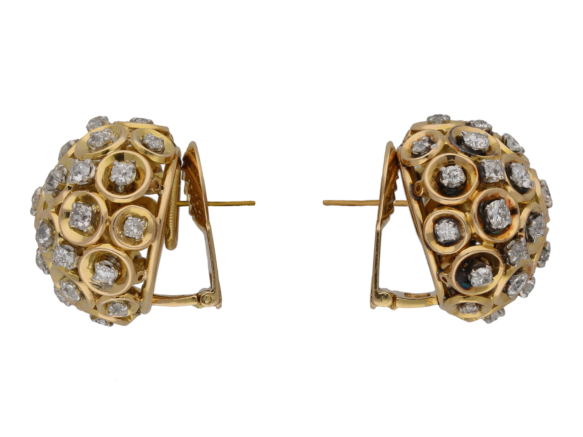 Boucheron diamond and gold clip earrings. A matching pair, each set with thirty one round mixed old cut diamonds in open back claw settings, sixty two in total with a combined approximate weight of 5.80 carats, to a pierced bombé cluster design featuring circular openwork, polished edges and round open backholing, fitted to reverse with a secure hinged clip fitting, approximately 2.2cm in diameter. Marked 18 carat yellow gold and platinum, signed 'BOUCHERON, PARIS', maker's mark for André Vassort, French, circa 1950. André Vassort became one of the most recognised and famous craftsmen of high-quality French jewellery in the mid-20th Century. He worked for many famous jewellery houses including Boucheron.