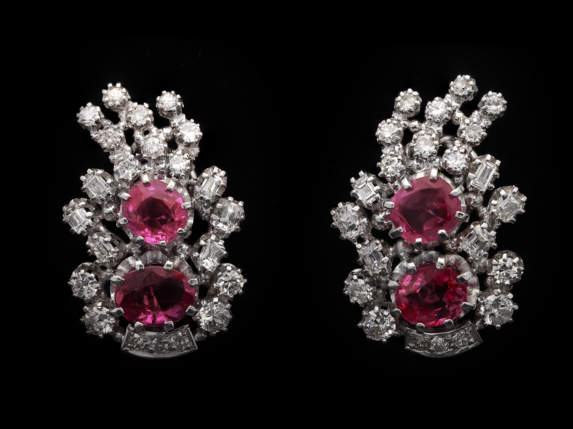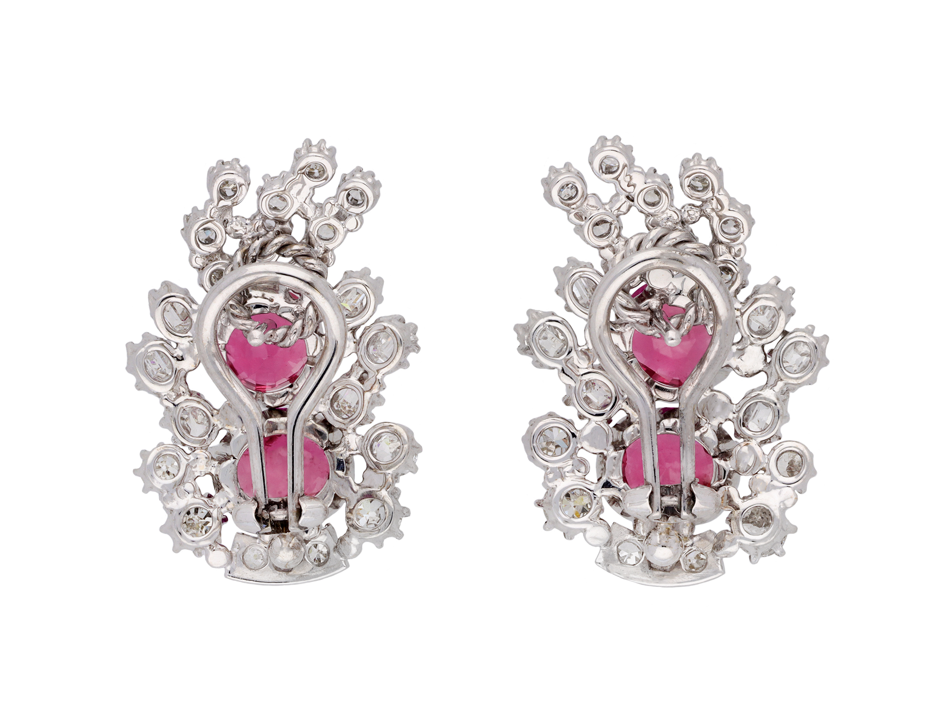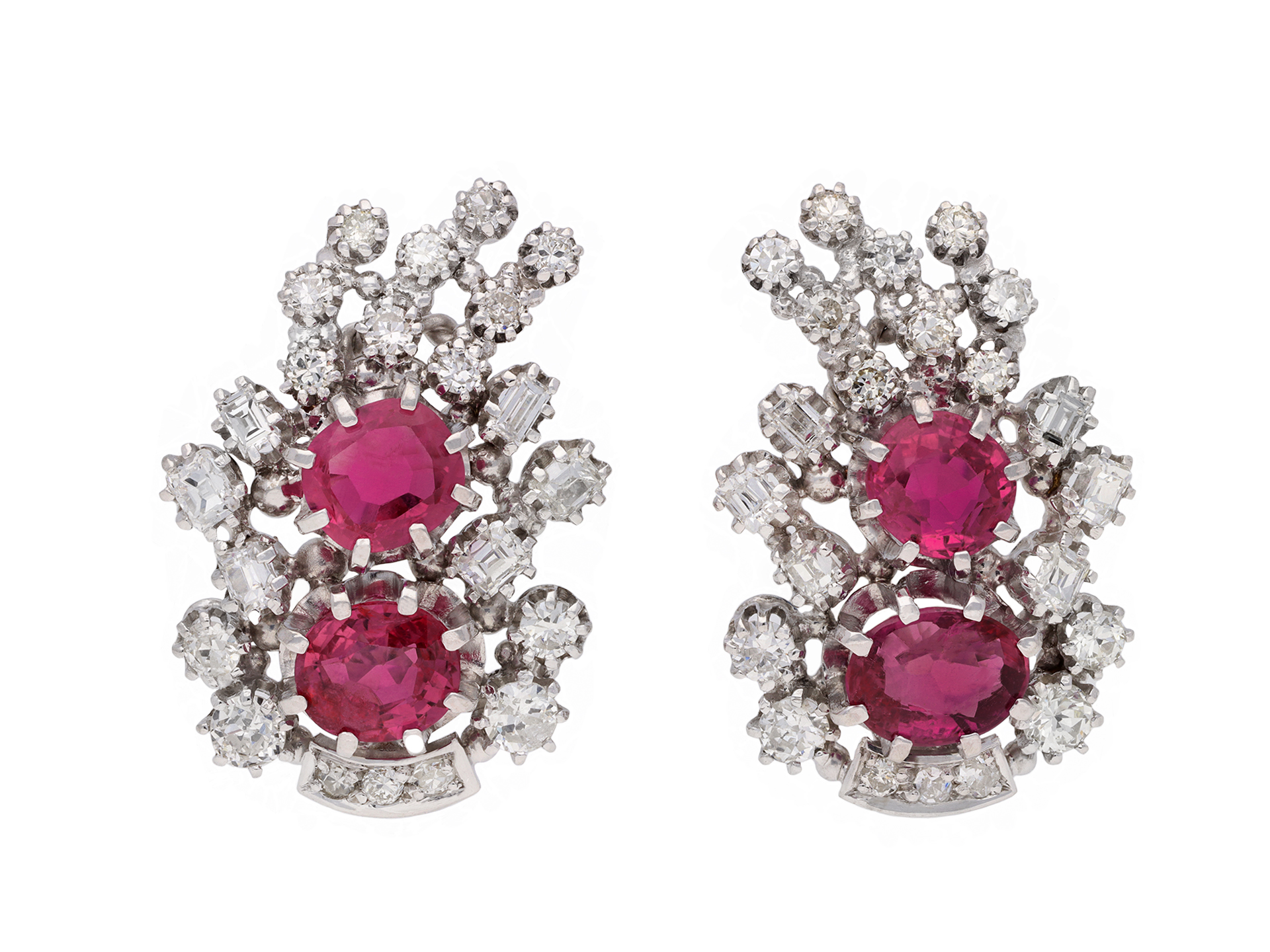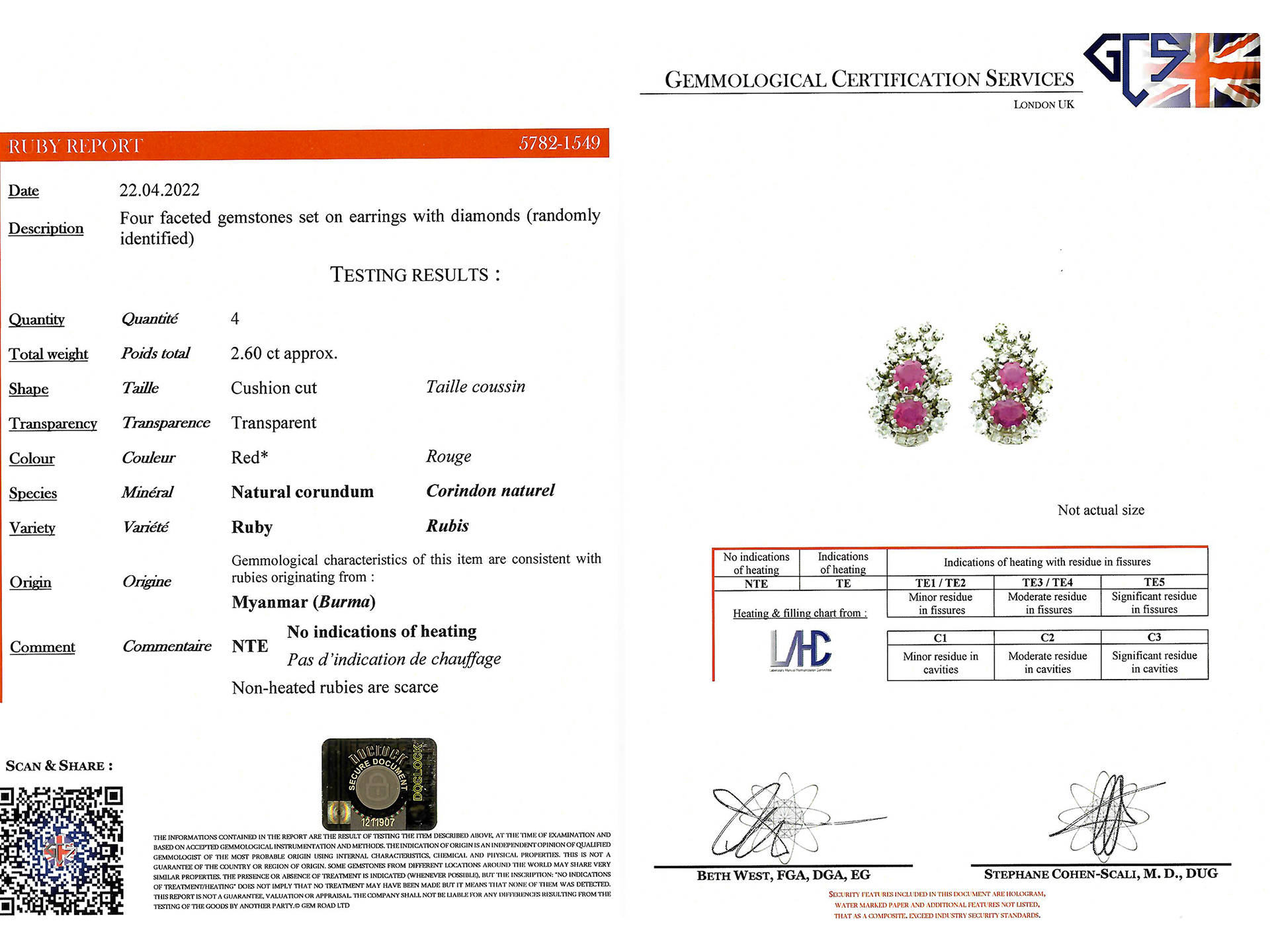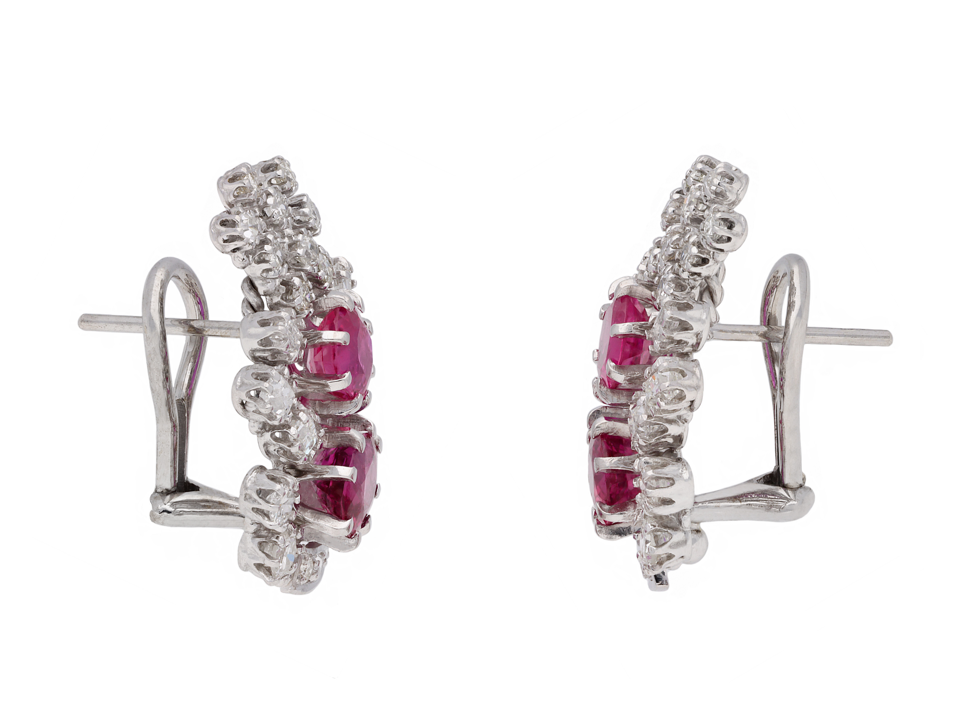 Burmese ruby and diamond earrings. A matching pair, each set with two cushion shape old cut natural unenhanced Burmese rubies in open back claw settings, four in total with a combined approximate weight of 2.60 carats, further adorned with six rectangular baguette cut diamonds in open back claw settings, twelve in total with a combined approximate weight of 1.20 carats, set further with sixteen round mixed old cut diamonds in open back claw and grain settings, thirty two in total, with a combined weight of 1.35 carats. The total approximate diamond weight is 2.55 carats, to an impressive pair of earrings featuring furving claws and open backholing, fitted to reverse with a secure post and hinge clip, approximately 2.5cm in length. Settings tested platinum, fittings tested white gold, circa 1950, accompanied by Gemmological Certification Services report #5782-1549.