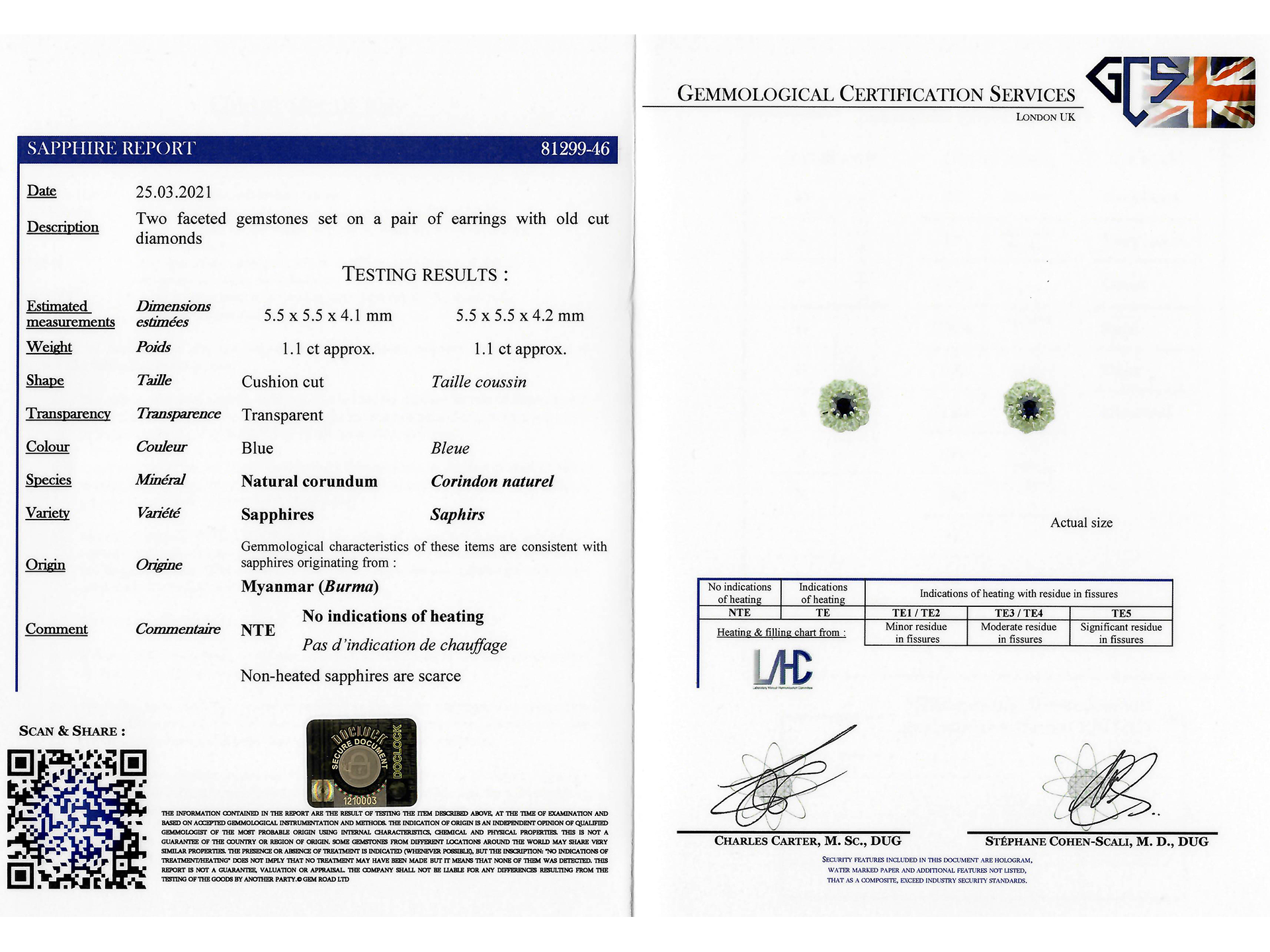 Burmese sapphire and diamond cluster earrings. A matching pair, each set to centre with one cushion shape old cut natural no heat Burmese sapphire in an open back claw setting, two in total, with a combined approximate weight of 2.20 carats, each encircled by a single row of ten cushion shape old mine diamonds, in open back claw settings, twenty in total, with a combined approximate weight of 1.00 carats, to an impressive cluster design featuring curving claws, an intricately pierced gallery and fancy open backholing, fitted to reverse with a secure post and butterfly. Tested platinum, circa 1920, accompanied by Gemmological Certification Services report #81299-46.