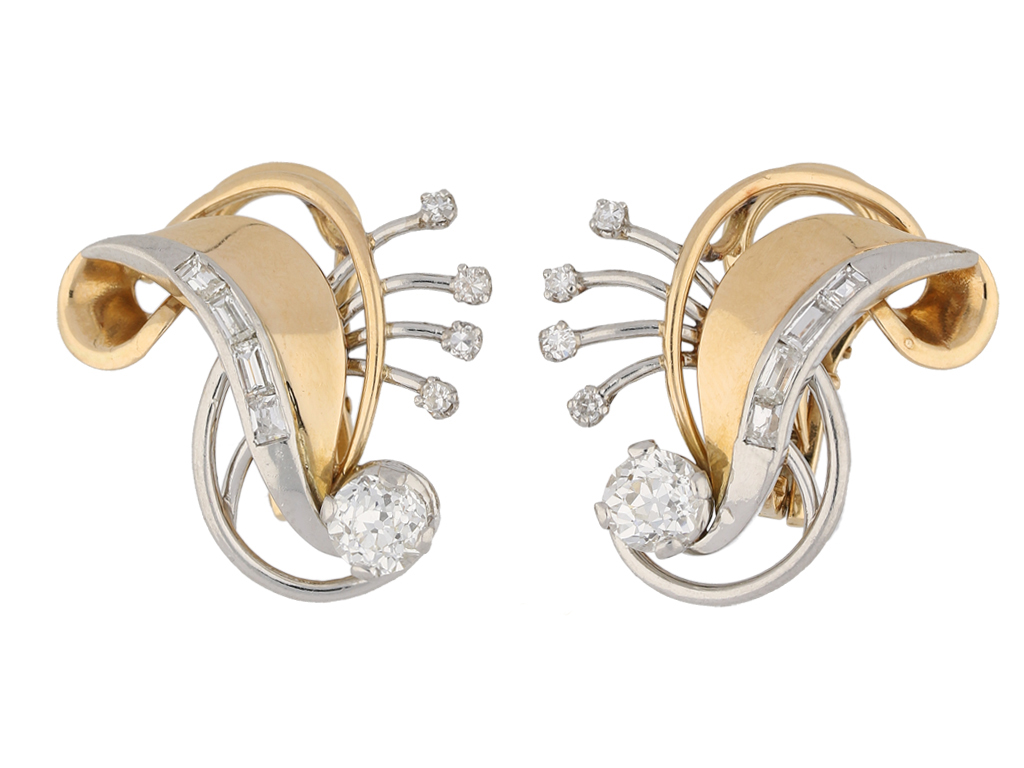 Diamond clip earrings. A matching pair, each set with a round old cut diamond in an open back four claw setting, the two with a combined weight of 1.20 carats, each further set with four round single cut diamonds in similar settings, all eight with a combined weight of 0.08 carats, and four baguette cut diamonds in open back rubover channel settings, all eight with a combined weight of 0.44 carats. The total approximate diamond weight is 1.72 carats, to an attractive openwork swirling design with circular backholing, and fitted to reverse with a secure hinged clip. Marked yellow gold and platinum, French, circa 1950.