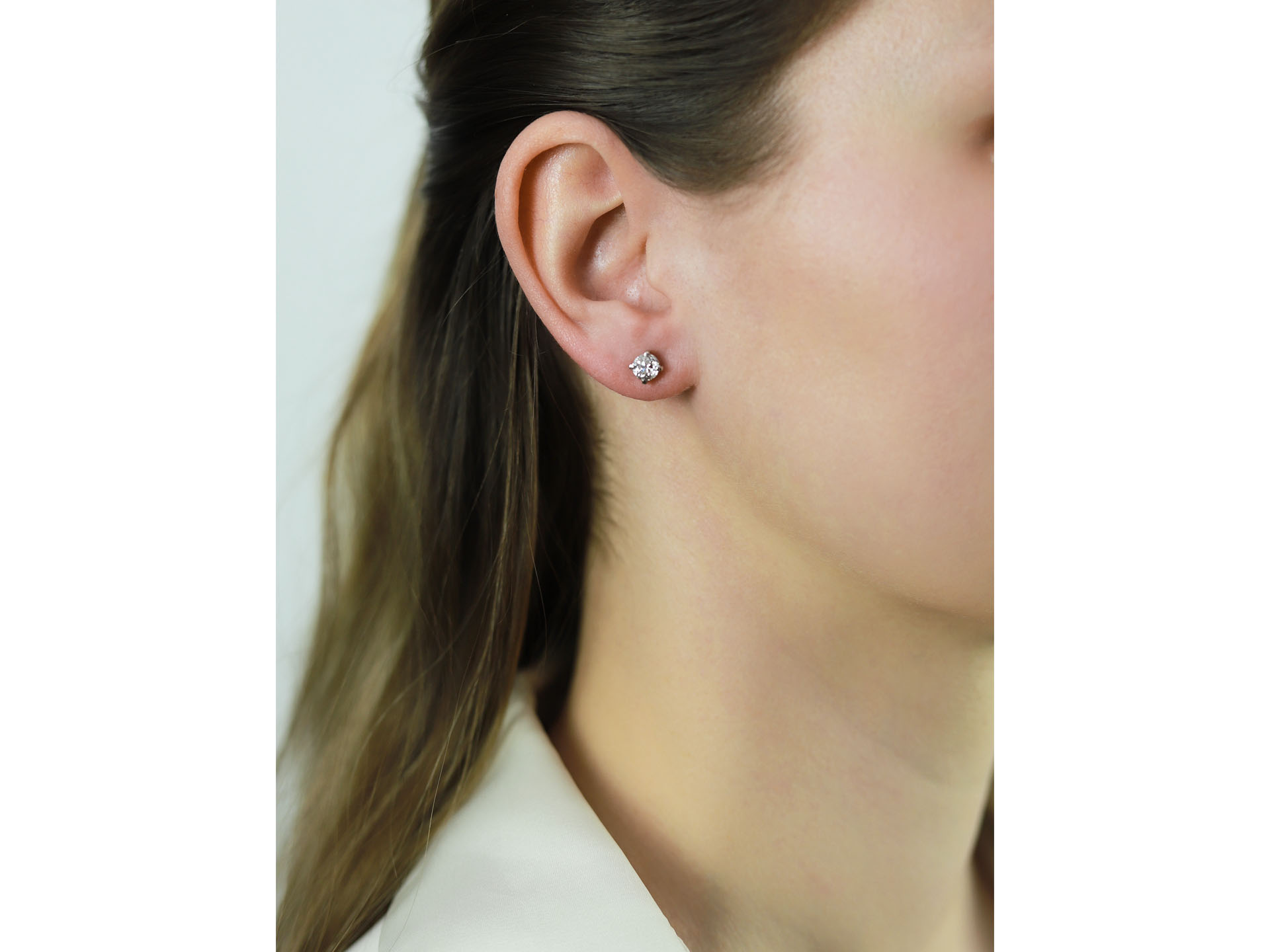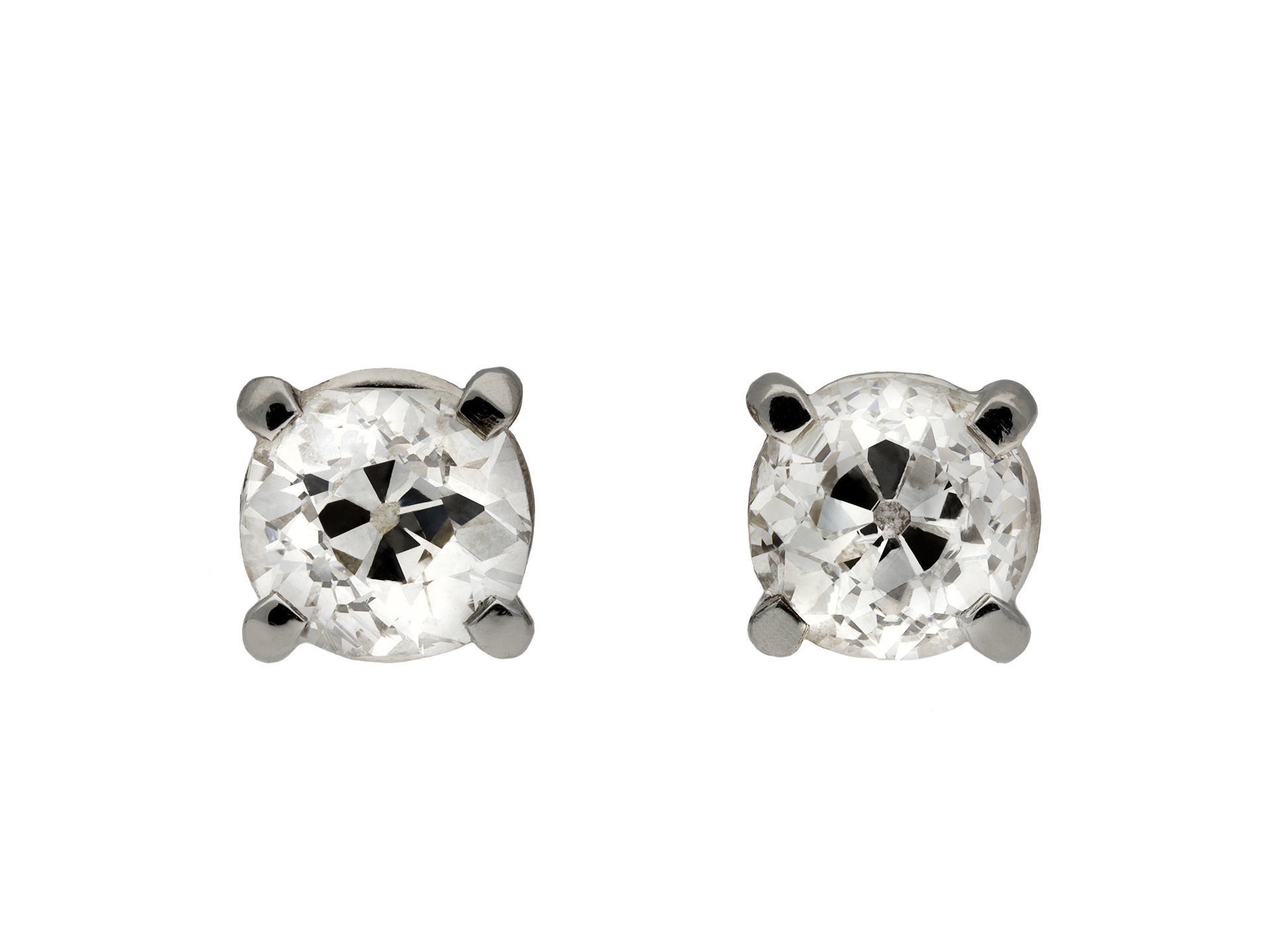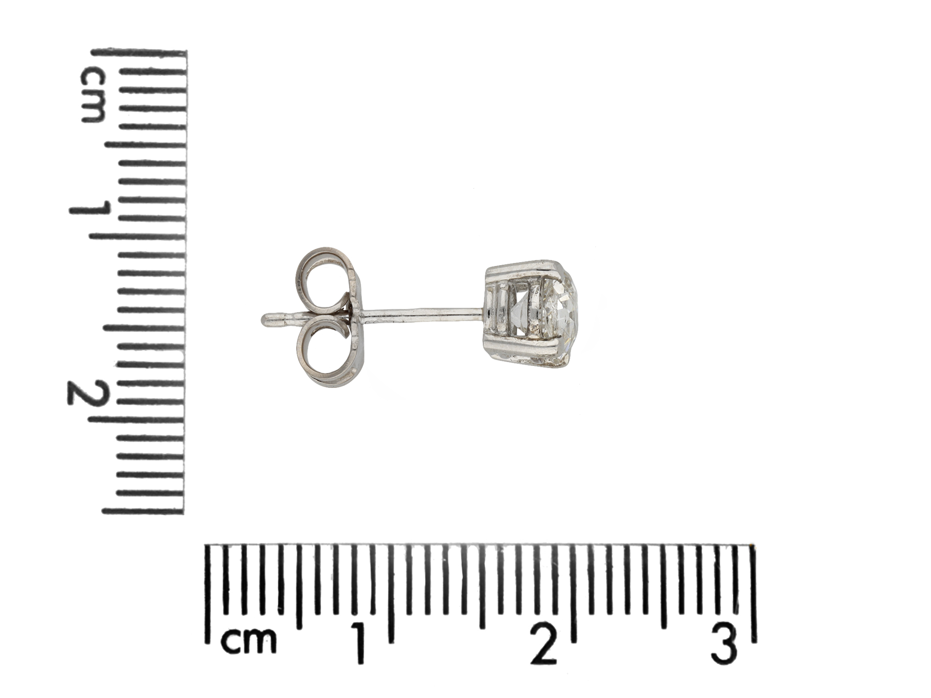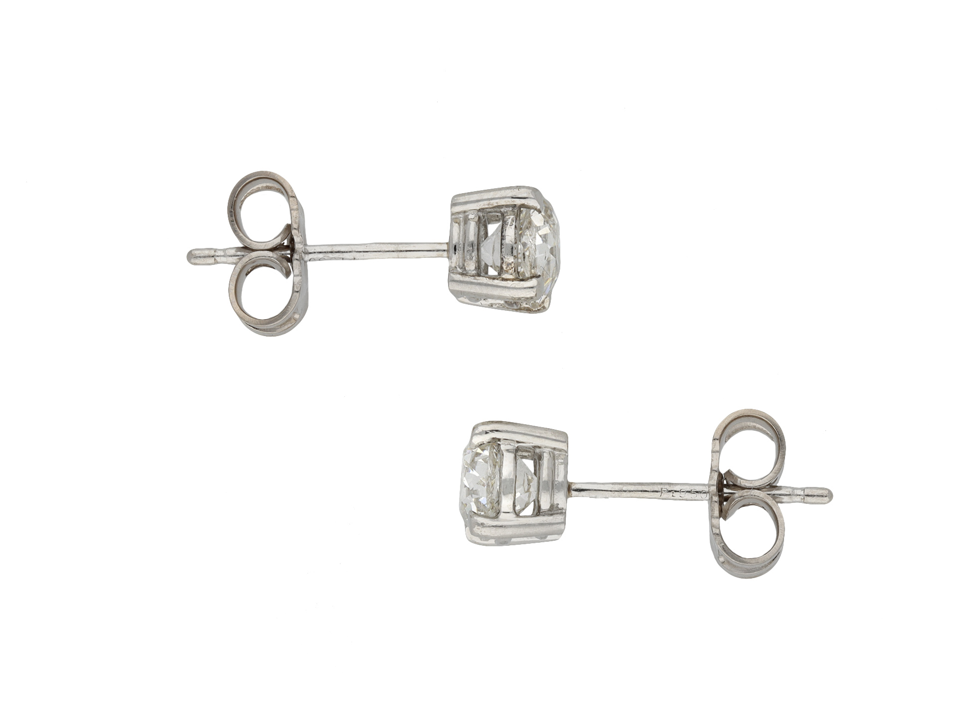 Diamond stud earrings. A matching pair, each set with one cushion shape old mine diamond in an open back claw setting, two in total, with a combined approximate weight of 1.45 carats, to an elegant stud design featuring curving claws, a pierced linear collet, and fancy open backholing, fitted to reverse with a secure post and butterfly. Tested platinum and white gold.